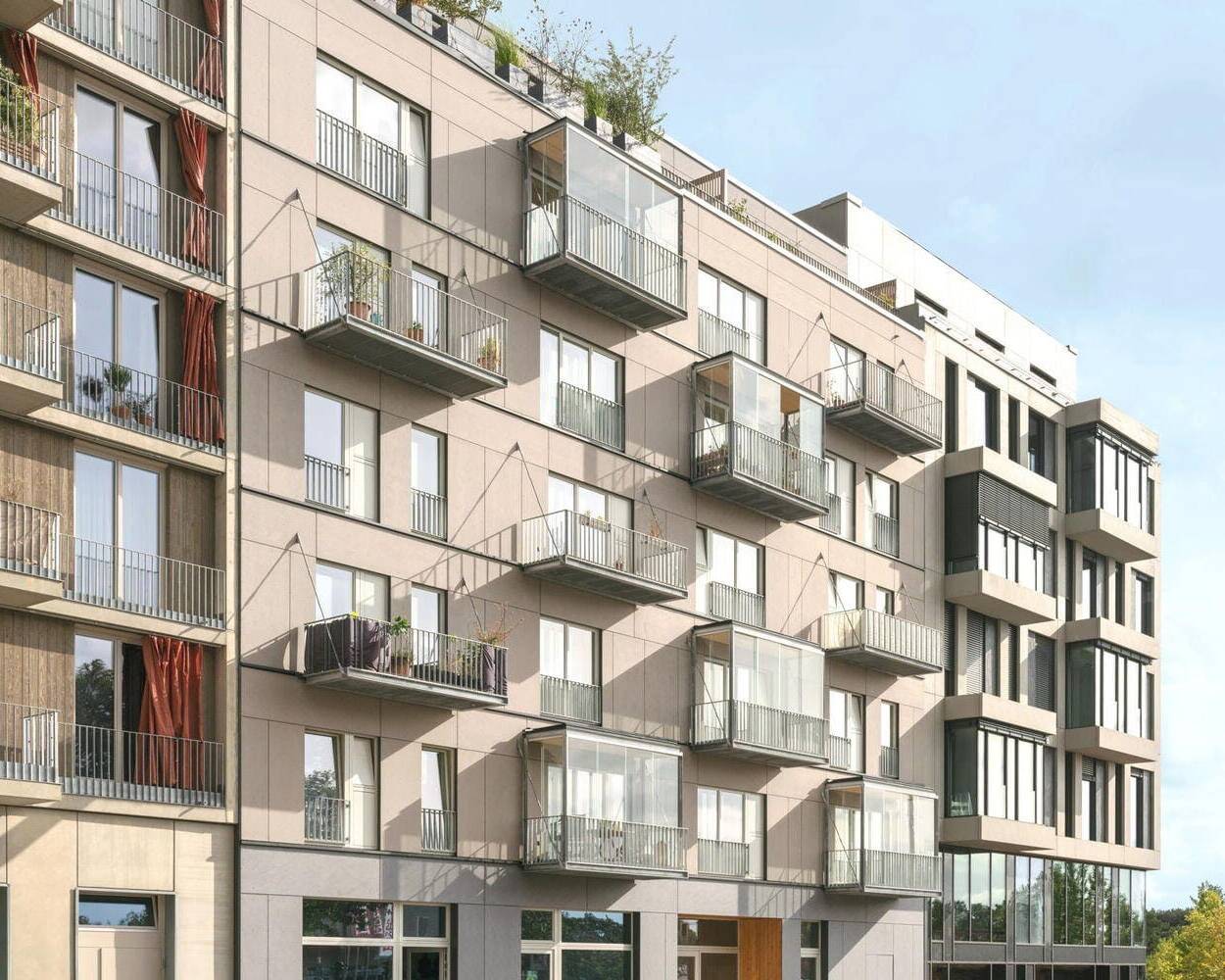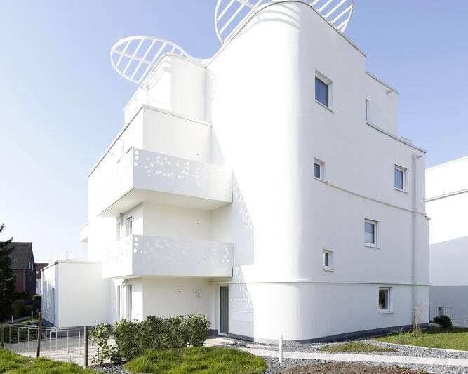 Die Architektur eines Mehrfamilienhauses in Essen-Bedingrade nimmt Bezug auf die Umgebung