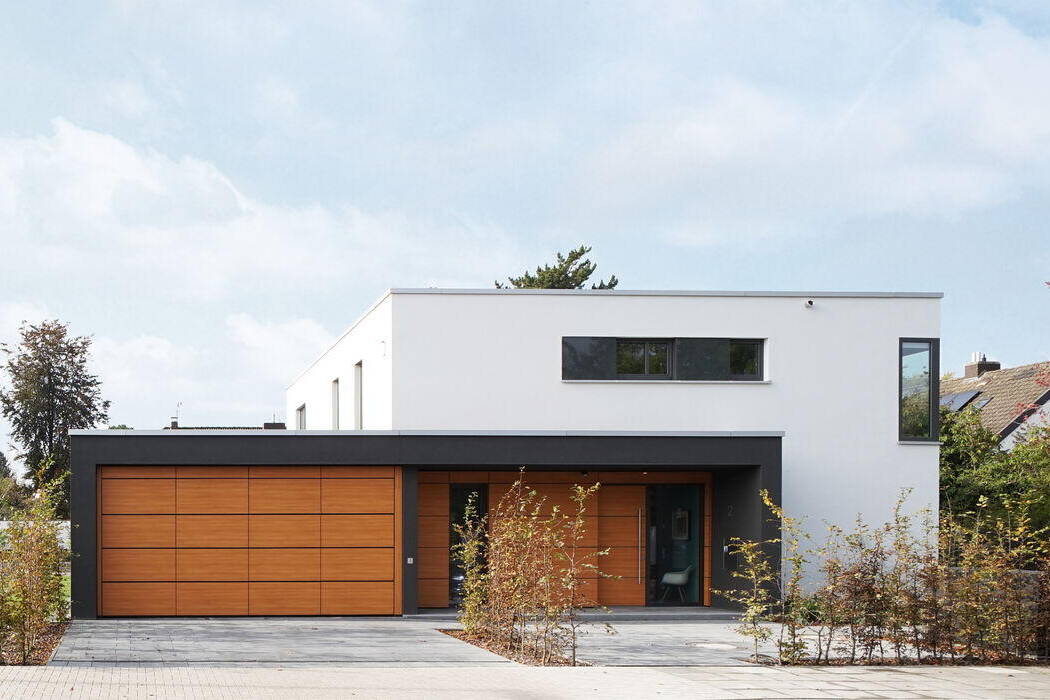 EinfamilienhäuserFlachdach Holzbau (Tragwerk)Holzfassade Zweigeschossig