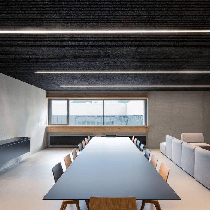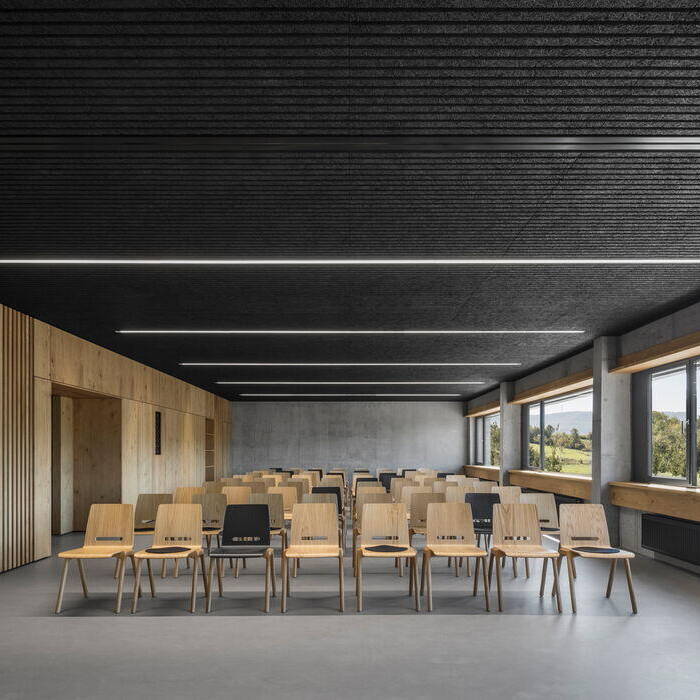 Eine bauliche „Fuge“ verdeutlicht nach außen die unterschiedlichen Nutzungen der beiden Gebäudeteile mit Schlauchturm und dem Höhensprung, der aus dem aufsteigenden Gelände resultiert. Über die einheitliche Materialität in Sichtbeton sind sie dennoch zu einer Gesamtanlage verknüpft. Für die 60 Zentimeter starken Wände wurde Dämmbeton verwendet, der das Raumklima auf natürliche Weise reguliert. Diese Materialästhetik wird in den Innenräumen fortgeführt. „Uns hat die Möglichkeit fasziniert, mit Leichtbeton innen und außen fertige Oberflächen zu erhalten, die weder gestalterisch noch bauphysikalisch zusätzlich aufgebracht Schichten benötigen“, sagt Architekt Helmut Dasch. Entstanden ist ein spannungsreiches Wechselspiel von großflächigen geschlossenen Wandflächen mit den Verglasungen der Fenster- und Torflächen. „Wir wollten ein Gebäude schaffen, dessen Erscheinungsbild dem entspricht, was eine Feuerwehr verkörpert: beispielsweise Robustheit, Sicherheit, Verlässlichkeit und handwerkliches Können“, betont Dasch. Der Hangsituation entsprechend ist die Anlage terrassiert und eine Rampe verbindet die beiden Hofebenen miteinander. Feuerwehr und Bauhof haben getrennte Ein- und Ausfahrten. Die Funkzentrale am Kopfende des Gebäudes ermöglicht den direkten Blick in die Fahrzeughalle des 1. Abmarsches sowie auf die Ein- und Ausfahrt und die PKW-Stellplätze. Eine extensive Begrünung auf dem Flachdach dient als mechanischer Schutz der Dachhaut und als Speicher für Regenwasser.