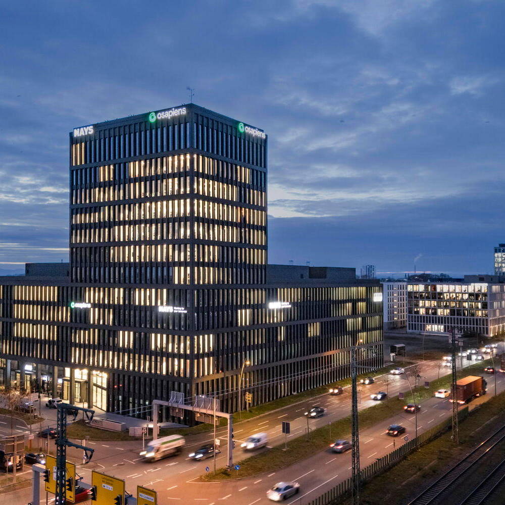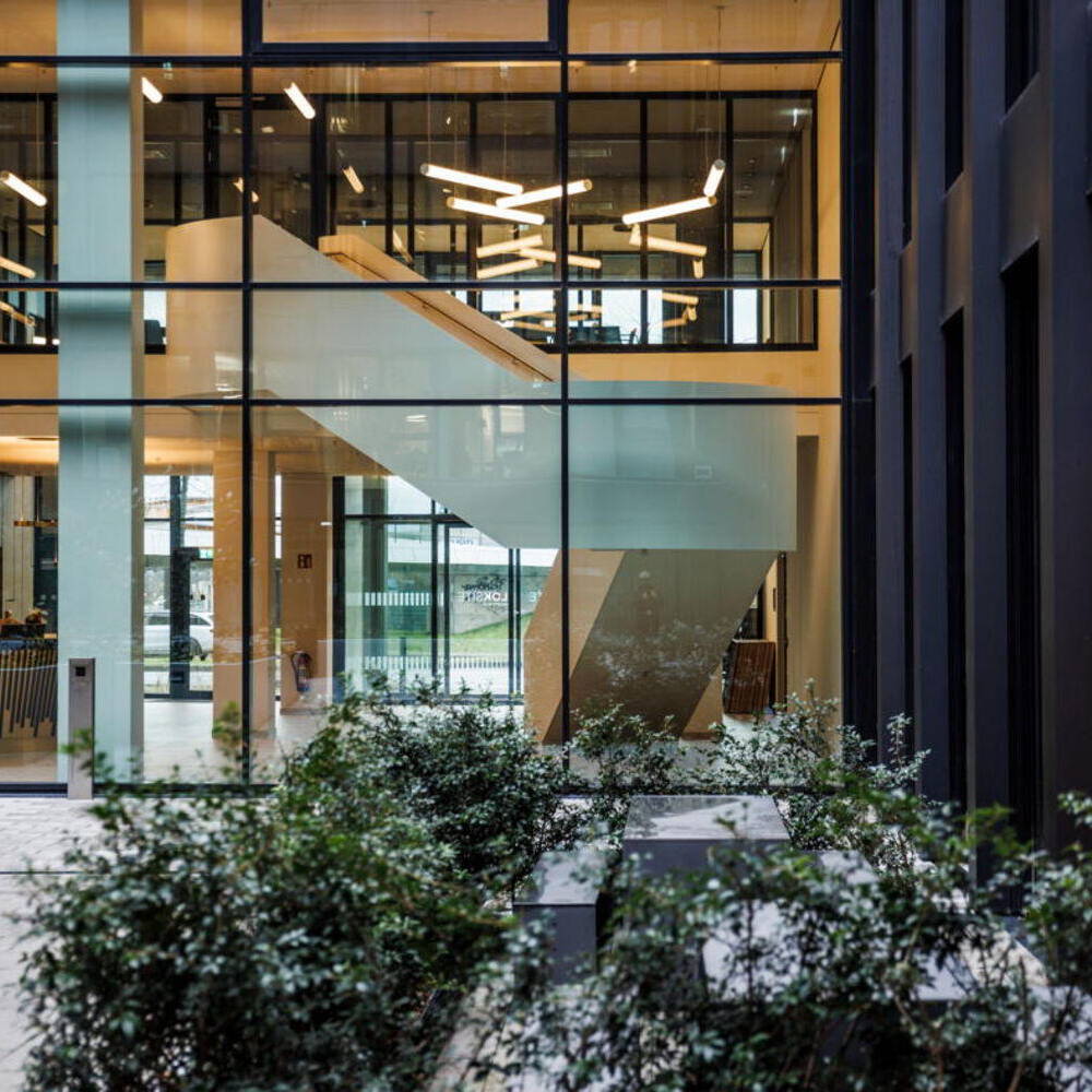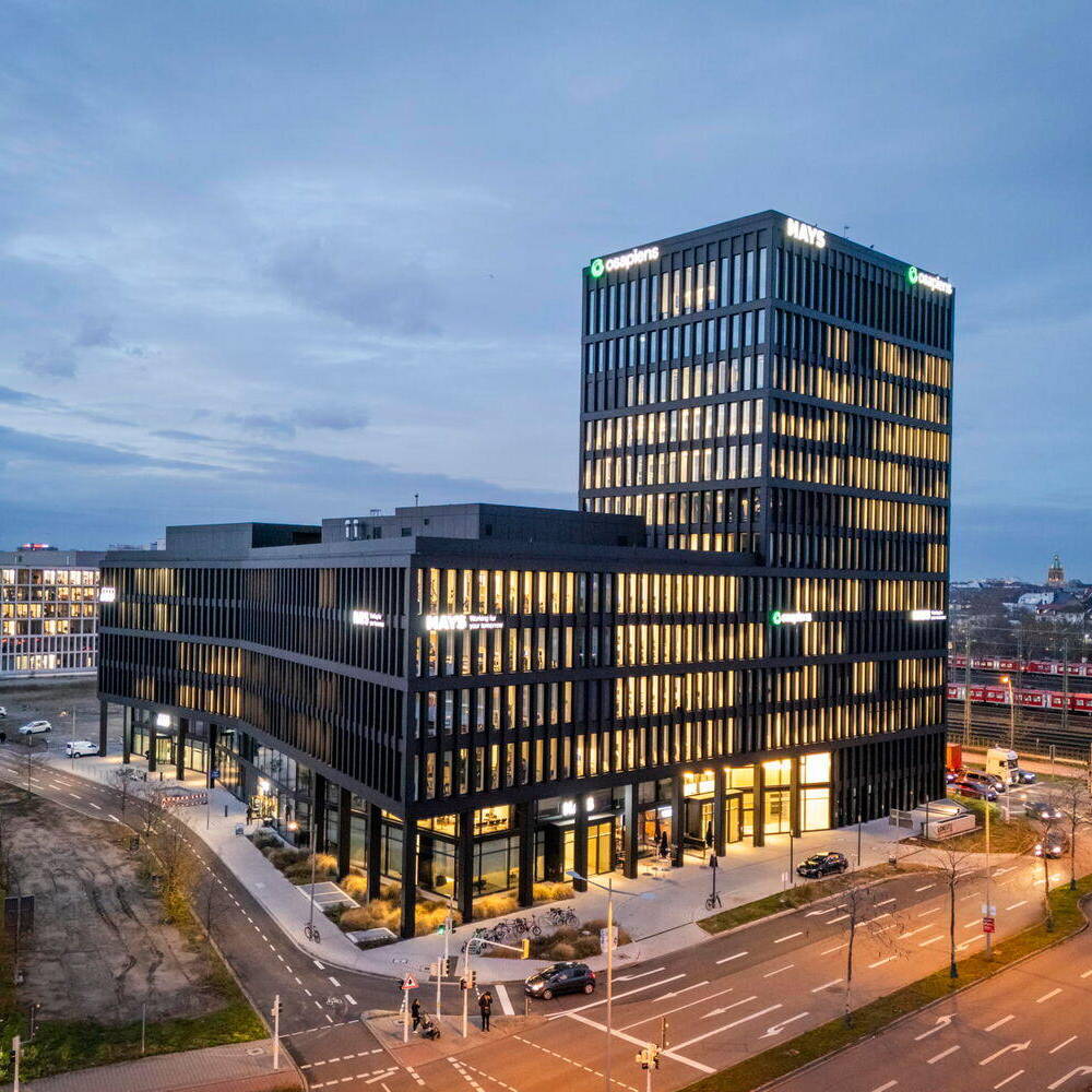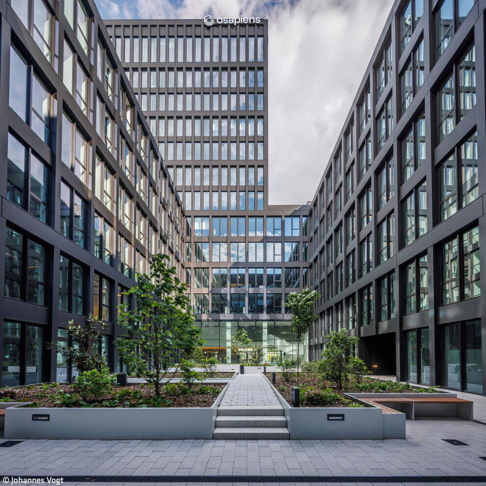 Der markante Neubau, der eine sechsgeschossige Blockbebauung mit einem 13-geschossigen Hochhausturm zu einem Baukörper rund um eine grün gestaltete Mitte verknüpft, antwortet städtebaulich auf den Victoria-Turm am westlichen Ende des neuen Bürostandortes. Das vertikale, jeweils über zwei Geschosse ausgebildete Fassadenraster lässt die dunkle Metallfassade feingliedrig und leicht erscheinen. Ein hoher Glasanteil sorgt zugleich dafür, dass die Funktionalität und Flexibilität der Innenräume auch von außen wahrnehmbar wird. Trotz seines einheitlichen Gesamteindruckes gliedert sich der Bau intern klar in den Bereich des Headquarters mit repräsentativem Zugang auf der Ostseite und einem Coworking-Bereich auf der Westseite. Dazwischen sind weitere Büromietflächen angeordnet, aber auch Sondernutzungen wie etwa das Bistro im Erdgeschoss. Mehrere Erschließungskerne ermöglichen eine Vielzahl von Nutzungsbereichen und machen so auch andere zukünftige Nutzungsaufteilungen denkbar. Alle Decken sind als Flachdecken ohne Unterzüge ausgeführt, was wiederum eine hohe Flexibilität bei der technischen Gebäudeausstattung schafft. Die Officebereiche zeichnen sich durch eine aktivierte Mittelzone aus, die unterschiedliche agile Arbeitsmöglichkeiten fördert für wechselnde Anforderungen und Arbeitswelten. Neben kommunikativen Flächen für Projektarbeit in Gruppen gibt es Rückzugsmöglichkeiten und Besprechungsinseln für konzentriertes Arbeiten oder auch kurzfristig organisierte Meetings. Teeküchen und Cafeterias sind strategisch zum grünen Innenhof ausgerichtet und bieten Raum für Austausch und Erholung. Das effiziente Energiekonzept des Gebäudes setzt auf die Aktivierung der Betondecken als thermischem Puffer, was die Kühlung effizient unterstützt. Ein intelligentes Energierückgewinnungssystem nutzt die Abluftwärme im Winter, um die Raumluft zu temperieren und Feuchte zu regulieren, ohne durch Nachheizen zusätzliche Energie zu verbrauchen. Die smarte Haustechnik steuert Licht, Sonnenschutz, Lüftung und Raumtemperatur bedarfsgerecht und dezentral abhängig von Anwesenheit, Bedarf und Tageslichteinfall.