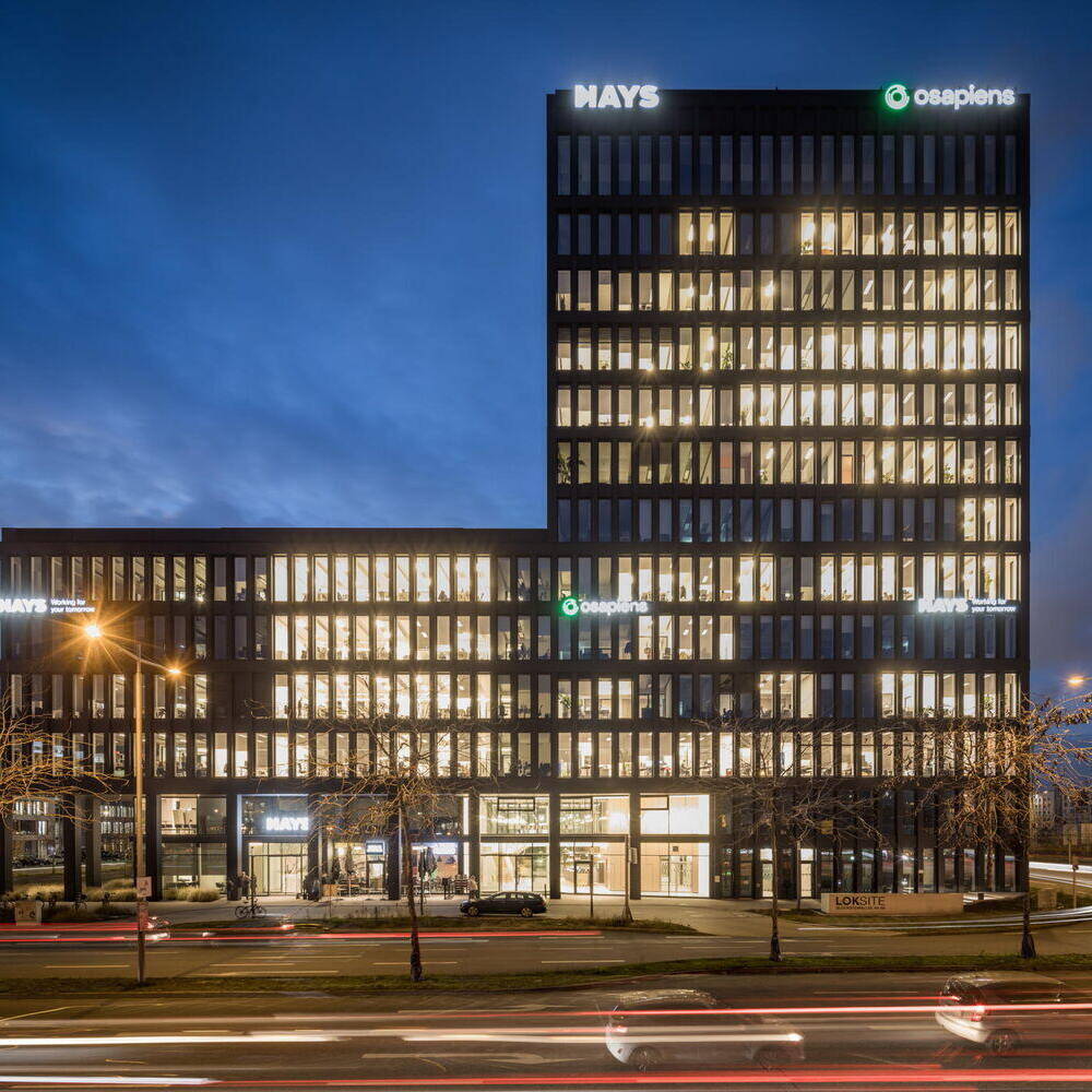 Das Glücksteinquartier in zentraler Lage am Mannheimer Hauptbahnhof hat mit dem Projekt „Loksite“ eine beeindruckende Landmarke erhalten, die städtebaulich und architektonisch neue Akzente setzt. Das von Lepel & Lepel in Zusammenarbeit mit Diringer & Scheidel entworfene Hochhaus ist sowohl städtebaulicher Auftakt des Quartiers als auch ein starkes architektonisches Ausrufezeichen. Die rund 25.000 m² umfassenden Büronutzflächen dienen vor allem dem Personalunternehmen Hays als Headquarter, aber auch die Wirtschaftsprüfungsfirma KPMG unterhält hier einen wichtigen Unternehmensstandort.