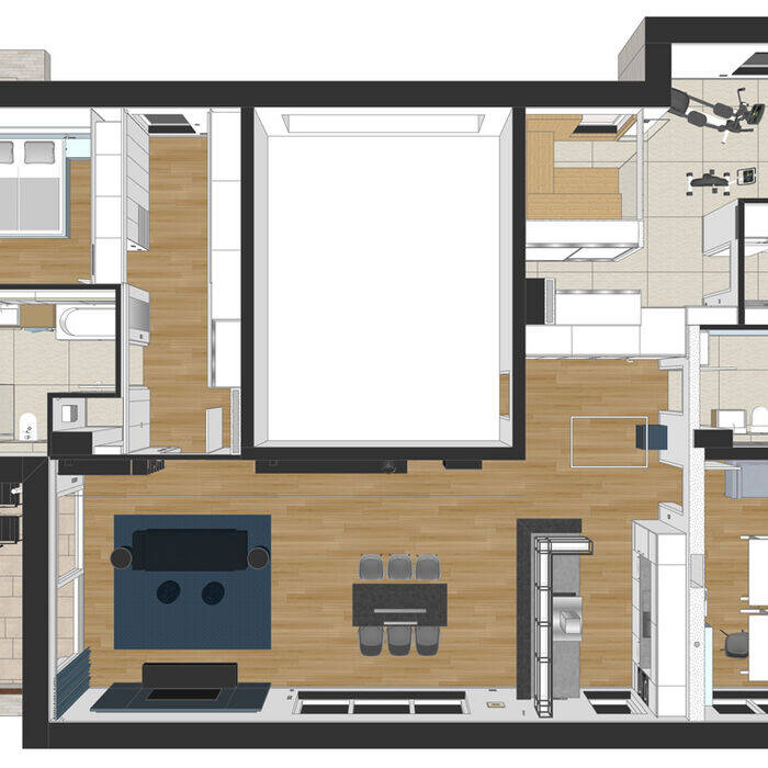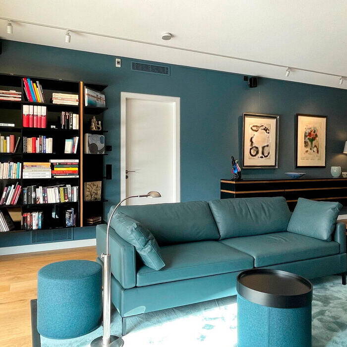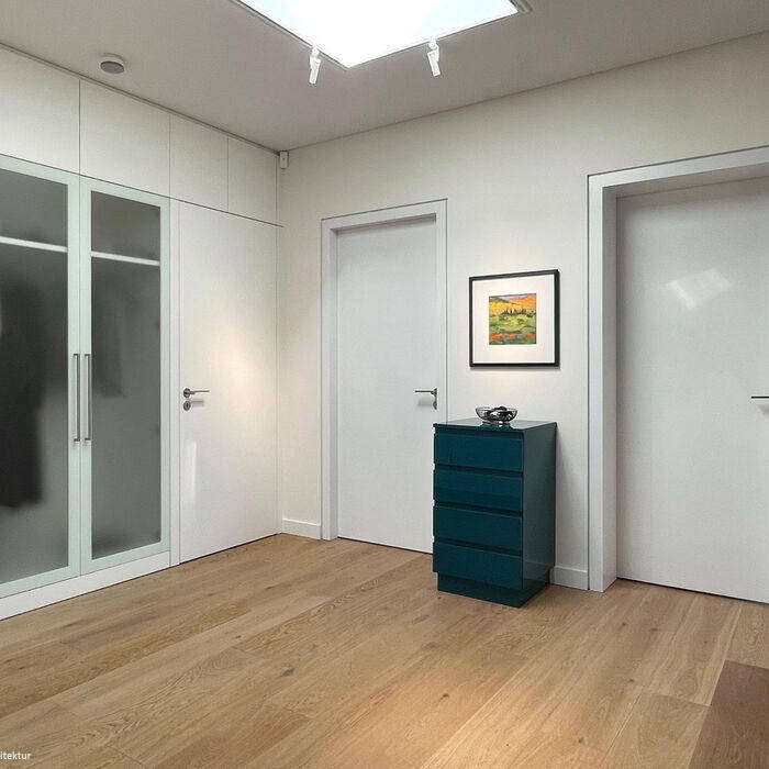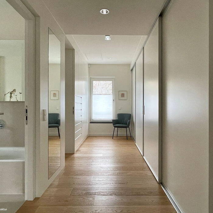 Ein Penthouse, viele Räume und noch mehr Besonderheiten: Die Wohnung, deren innenarchitektonische Gestaltung sowie Farb- und Materialkonzept von hansen innenarchitektur entwickelt wurde, steckt voller Ideen und maßangefertigter Lösungen. Diese präsentieren sich bereits im offenen Eingangsbereich, der durch eine eigens angefertigte Schrankwand vom privaten Teil der Wohnung mit Fitnessraum, Sauna und Hauswirtschaftsraum abgetrennt ist. Tagsüber sorgt hier eine Lichtkuppel für natürliche Helligkeit, während abends eine Mini-Stromschiene mit kleinen Strahlern den Bereich wirkungsvoll illuminiert.