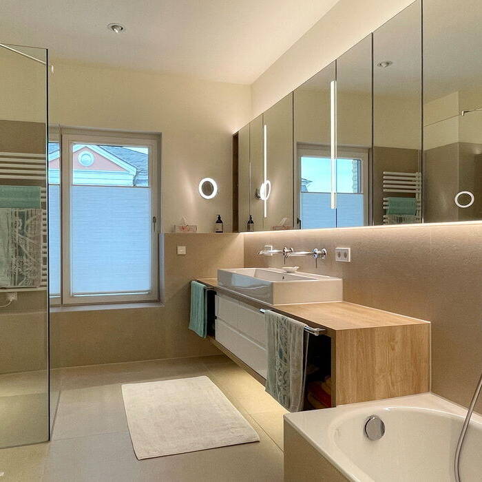 Über die Ankleide führt der Weg ebenfalls ins Bad, dessen dominierendes Element die Waschtischanlage mit einem breiten Waschbecken und zwei Wandarmaturen ist. In den Fächern über der Wanne ist die Technik für die Beleuchtung untergebracht. Zudem bietet ein kleines offenes Fach am linken Ende Platz für dekorative Parfumflakons. Die geräumige Dusche, in der Pflegeprodukte in einer Shampoo-Nische Platz finden, ist mit einem festen Glas über Eck abgetrennt. Großformatige Fliesen in Sandsteinoptik korrespondieren mit den Holzflächen und dem Parkett der angrenzenden Ankleide.