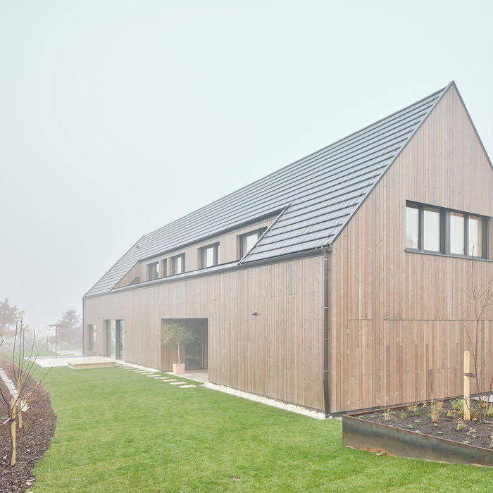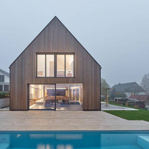 Mitunter sind es die Rahmenbedingungen für die Bebauung eines Grundstücks, die Architekturplanende herausfordern, außergewöhnliche Lösungen zu entwickeln. So auch bei diesem Einfamilienhaus für eine sechsköpfige Familie. Der Bebauungsplan gab ein eineinhalbgeschossiges Gebäude mit einem Satteldach mit einer Dachneigung von 45 bis 48 Grad vor. Holzer Architekten entwarfen in dem sehr schmalen Baufenster ein langgezogenes „Eindachhaus“, das unter seinem markanten Satteldach sowohl einen Wohnbereich und einen Arbeitsbereich als auch einen überdachten Wohnhof sowie eine Doppelgarage zusammenführt.