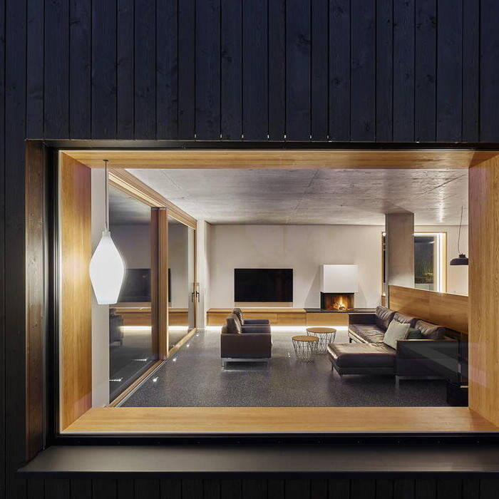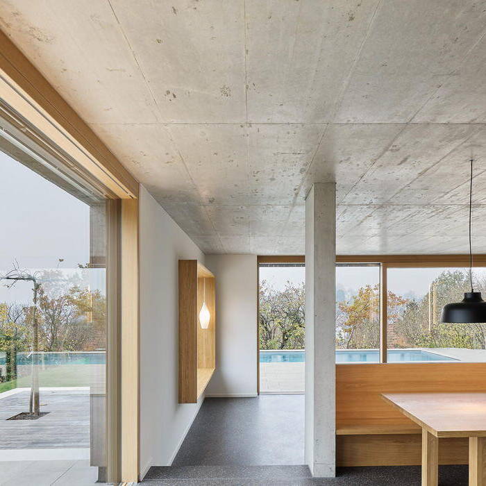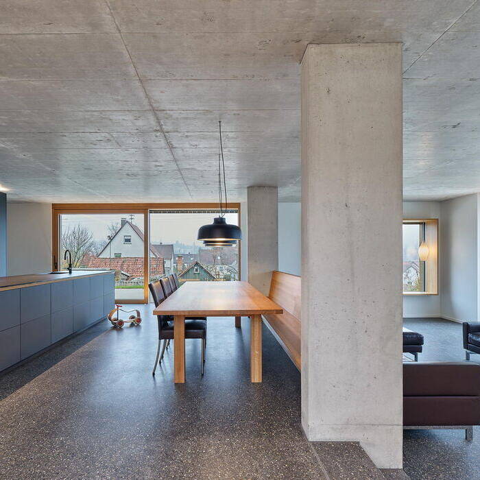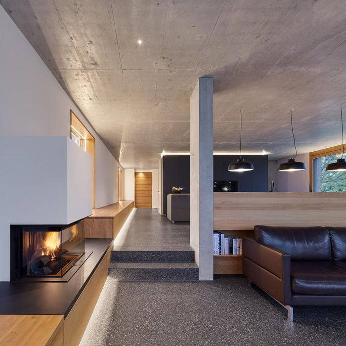 Aus dem klaren monolithischen Baukörper sind eine Dachterrasse und der Wohnhof mit Platz für an der Betondecke befestigte Schaukeln entstanden, der zum Spielen einlädt. Zur Straße hin zeigt sich das Wohnhaus mit seiner Holzfassade eher geschlossen. Die Gartenansichten hingegen lassen seinen inneren Aufbau und die Nutzungen erkennen. Mit der Ausrichtung nach Süden nutzt das Haus den Blick auf die nahegelegene Stadt. Ausgelegt als KfW55-Effizienzhaus mit Wärmepumpe wurde das Einfamilienhaus innerhalb von rund zwei Jahren geplant und realisiert. Das Erdgeschoss ist als öffentlicher Teil des Hauses ausgelegt, der optisch nahtlos in den Garten mit Pool überzugehen scheint. Die Bereiche Eingang, Kochen und Essen sind fließend verbunden. Obwohl der Wohnbereich mit offenem Kamin aufgrund der Topografie etwas tiefer liegt, ist er in das Raumkontinuum einbezogen. Ein dunkelgrau-melierter und leicht glänzender Sichtestrich durchzieht das Erdgeschoss mit weiß verputzten Wänden und Decken aus Sichtbeton. Im Zusammenspiel der edlen Grautöne mit den holzgerahmten großen Fenstern, dem tiefen Sitzfenster und den Schiebetüren zum Garten entsteht eine angenehme und wohnliche Atmosphäre. Überhaupt nimmt das warmtonige Eichenholz, das auch für Möbeleinbauten und den Esstisch mit Stühlen und eine Bank genutzt wurde, eine wesentliche gestalterische Rolle ein. Indirekte Beleuchtung setzt den präzise gesetzten Innenausbau in Szene.