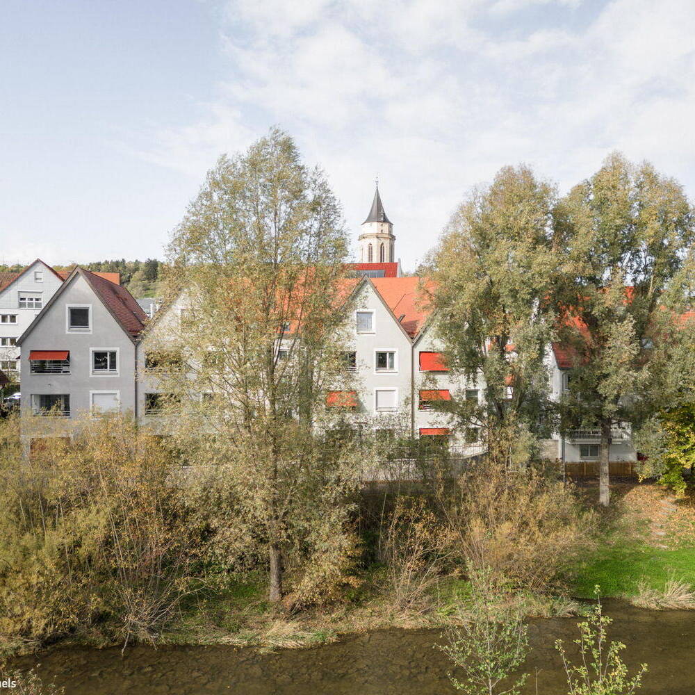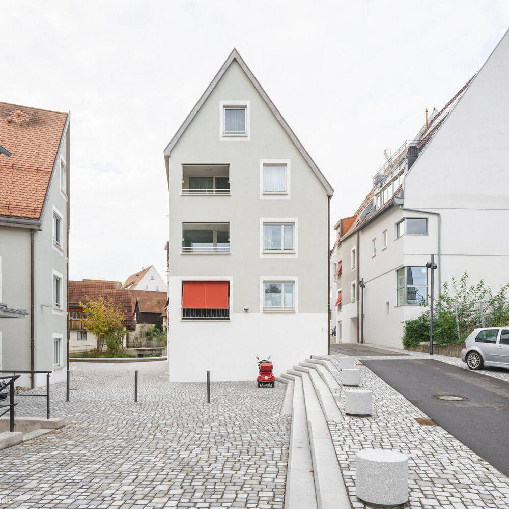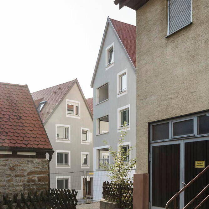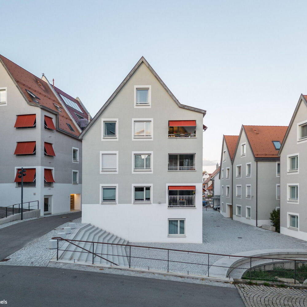 An diesem Ort in Balingen treffen verbliebene mittelalterliche Stadtstrukturen unmittelbar auf die Zeugnisse der klassizistischen Neuordnung im frühen 19. Jahrhundert. Die neue Wohnbebauung greift die klein parzellierte städtebauliche Struktur des ehemaligen Gerberviertels am Flussufer auf und entwickelt das Motiv der giebelständigen Gerberhäuser weiter. Sensibel eingefügt, komplettieren die Häuser von nbundm* Neuburger, Bohnert und Müller Architekten BDA und Stadtplaner die Stadtsilhouette und schließen die umfassende Sanierung des Viertels zwischen 1994 bis 2004 ab. Ein drittes Haus am ehemaligen Standort einer Mühle bildet den Abschluss zweier öffentlicher Räume. Ein Anbau „Beim Mühltor“ ergänzt das Gebäudeensemble und zeichnet den Verlauf der inneren Stadtmauer nach.