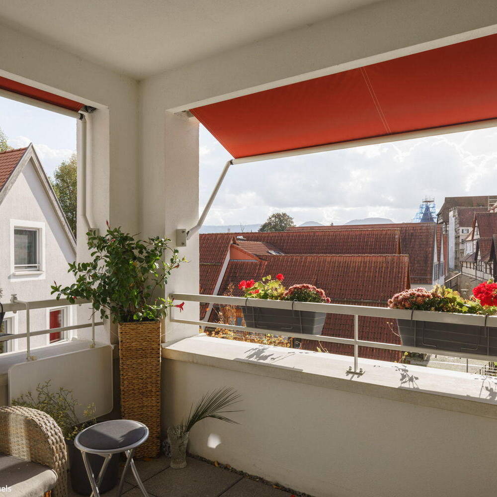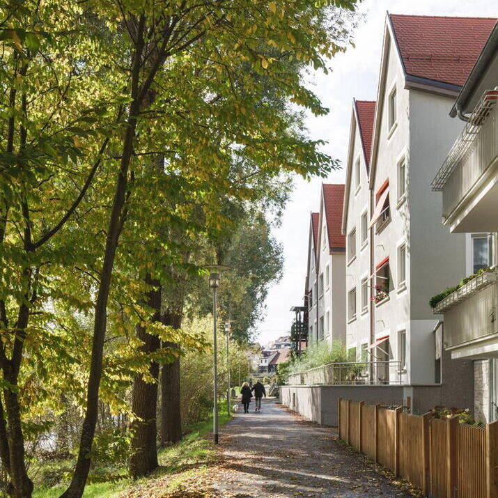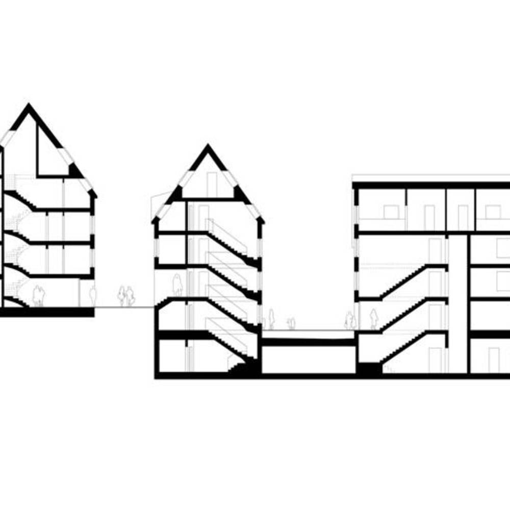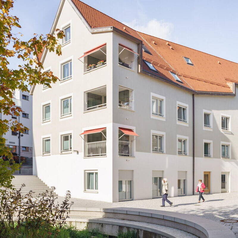 Gebäudevolumina und Hausformen orientieren sich an der umgebenden Bebauung, resultieren aus Flurgrenzen oder historischen Kanalläufen. Am Rande der Altstadt entstand auf diese Weise eine neue städtische, mehrfach ausgezeichnete Wohnbebauung, eingebettet in ein öffentliches Platz- und Raumgefüge. Auch oberirdisch sind die vier Gebäude einer Wohnbaugenossenschaft verbunden: Über das durchgesteckte Treppenhaus des mittleren Hauses gelangt man in das ebenerdig und für alle Bewohner:innen zugängliche Zwischengeschoss mit Platz für Fahrräder und Kinderwagen sowie Trocken- und Werkräume. Bis auf den Anbau sind die Häuser über einen Aufzug an die Tiefgarage angebunden und barrierefrei erschlossen. Die Wohnungen sind ebenfalls barrierefrei konzipiert und werden über eine großzügige Diele betreten. Kochen, Essen und Wohnen sind als räumlich zusammenhängende offene Bereiche entwickelt, die sich nach Bedarf – mit einer in sich geschlossenen Küche – unterteilen lassen. In den Wohn-und Schlafräumen wurde Eichenparkett verlegt, die Böden der Bäder sind gefliest. Dieser wichtige Gemeinschaftsraum innerhalb der Wohnung kommuniziert über die Loggia mit auffallend roten Markisen mit dem öffentlichen Raum. Jeweils die oberste Wohnung in den Häusern ist als Maisonette angelegt und birgt unter dem Dach Schlafräume und kleinere Zimmer. Insgesamt entstanden 22 Wohnungen mit jeweils zwei bis fünf Zimmern auf rund 1.710 m² Wohnfläche.