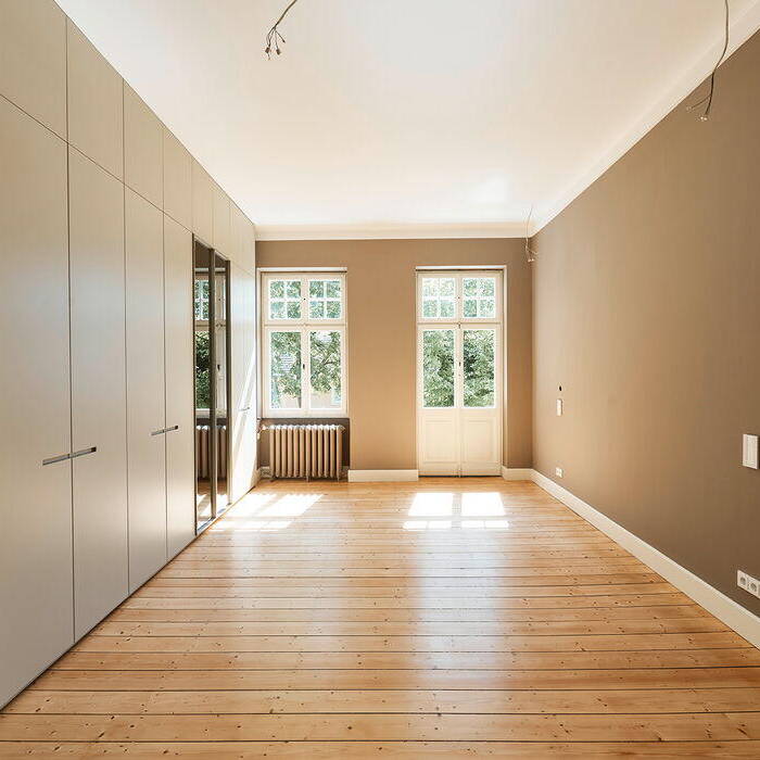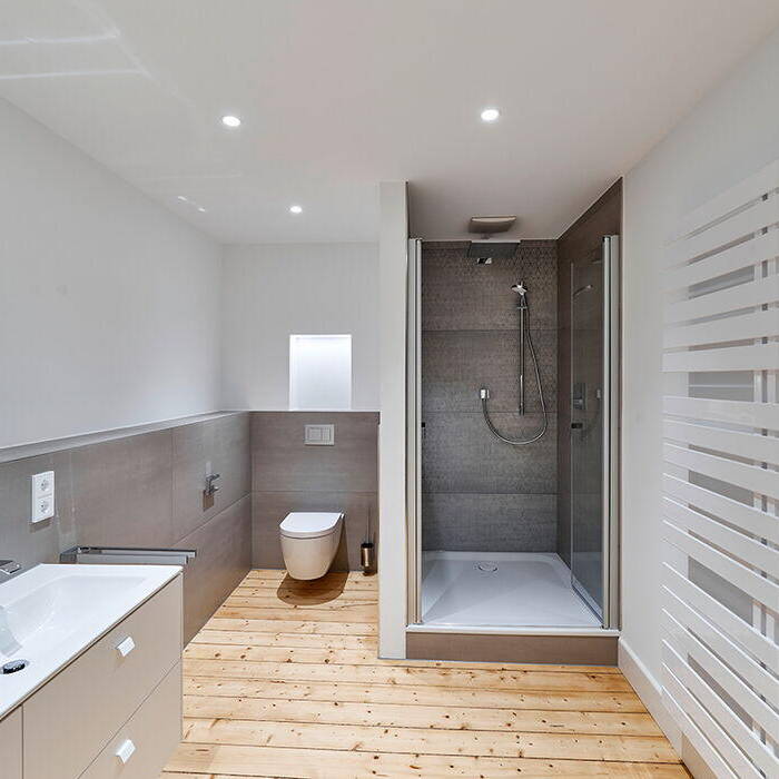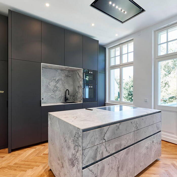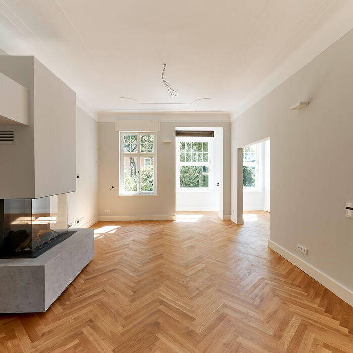 Das Bauherrenpaar wollte die abgetrennte Küche im Erdgeschoss großzügig zu den Wohnräumen öffnen. Außerdem sollten die beiden oberen Etagen so ausgebaut werden, dass eine geschossweise Trennung von Eltern- und Kinderbereich möglich wird. Vor allem das bereits ausgebaute Dachgeschoss musste daher komplett neu geordnet werden: Erst auf diese Weise ließ sich der Bauherrenwunsch nach einem großzügigen Masterbad mit Saunakabine umsetzen. Die größten Herausforderungen stellte allerdings die Fassade dar: Aufgrund der dekorativen Putzornamente und der vielfach geteilten Fenster konnte hier eine energetische Sanierung nur in engster Abstimmung mit der unteren Denkmalbehörde erfolgen. Beide Obergeschosse erhielten dabei eine Klimaanlage, die geschickt in der Fassade verborgen werden konnte. Im Inneren wurden bei der Sanierung bewusst alle Holzböden, Innentüren und Beschläge erhalten, sorgsam aufgearbeitet und repariert. Die Fliesen im Treppenhaus, die aus den 1980er-Jahren stammten, wurden dagegen durch ornamentierte Zementfliesen ersetzt. Während in den Obergeschossen die alten Gussheizkörper erhalten blieben, wurden im Erdgeschoss eine Fußbodenheizung und ein markanter neuer Kamin installiert, der mit seinem grauen Sockelblock behutsam den Raum akzentuiert. Der Küchenblock aus grauem Marmor nimmt diese Farbgebung weiter auf. Auch bei der Wandgestaltung wählte die Bauherrin bewusst Farben aus, die sich zurückhaltend dem Gebäude anpassen. Die neu installierte Haustechnik ist durch eine Free@home-Steuerung aufgewertet worden, die auch die Alarmanlage einbindet.
