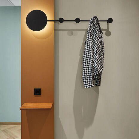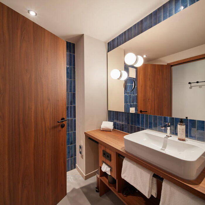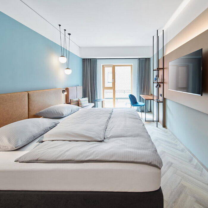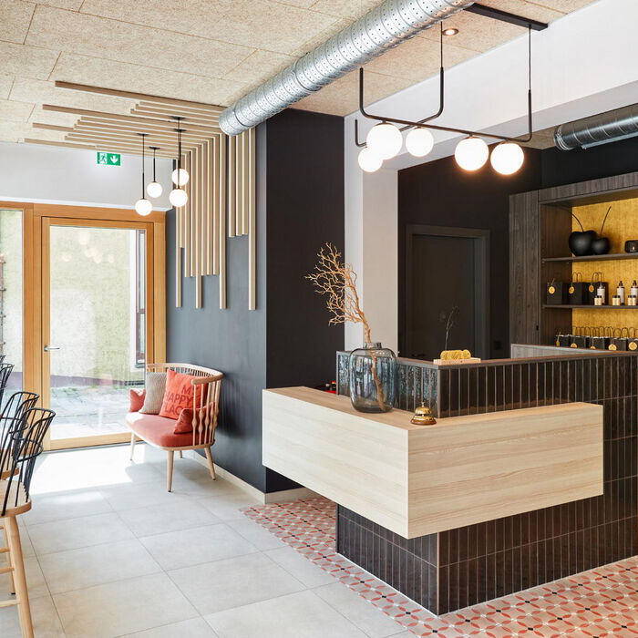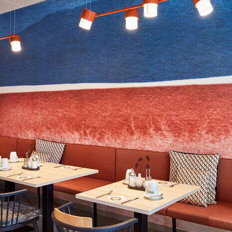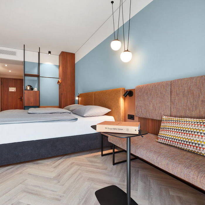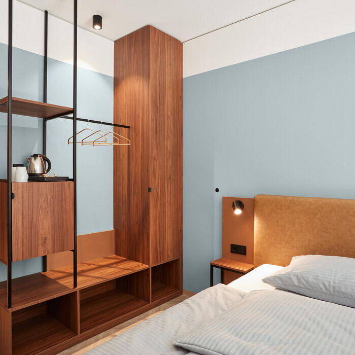 Der Auftrag für den privaten Bauherrn kam über eine Empfehlung, spezielle Vorgaben gab es nicht. „Am Anfang unseres Projekts stand eine Luftaufnahme von Neumarkt. Daraus haben wir unsere gestalterische Leitlinie entwickelt“, erklärt die Design-Innenarchitektin Anja Kalusche und ergänzt: „Die Dächer wurden in den Zimmern in leicht rötliches Nussbaumholz übersetzt, kombiniert mit blauen Wänden und Polstermöbeln.“ Akzente setzen schwarze Metallstrukturen in Regalen und Schreibtischelementen sowie die schwarz akzentuierten Leuchten – sie verleihen den Zimmern einen Hauch von industriellem Flair. Licht ist insgesamt ein wichtiges Gestaltungselement des Zimmers: Das Garderobenelement gegenüber dem Bad ist eine Sonderanfertigung für dieses Zimmer und vereint Leuchte und Garderobenstange in einem. Auch die Pendelleuchte zwischen Bett und Sitzbank ist vor der getönten Wand ein optisches Highlight. Ein heller Vinylboden im Fischgrätdesign bringt den Charme der zuvor abgerissenen Altbauhäuser zurück und schafft so eine Verbindung zwischen Tradition und Moderne. Im Bad dominieren helle Fliesen, Ton in Ton mit der abgetönten Decke. Kontrastierend dazu sind in Teilbereichen azurblaue Fliesen eingesetzt, die die Verbindung von modernem, ruhigem Design und traditionell anmutendem Feinsteinzeug unterstreichen. Während in den Zimmern das beruhigende Blau im Vordergrund steht, dominiert in den öffentlichen Bereichen ein energetisches Rotbraun. Der Boden ist hier durchgehend gefliest, optisch unterbrochen durch gemusterte Fliesen, die an einen Teppich erinnern. Der Sitzbereich, der durch eine grafische Tapete aufgewertet wird, nimmt das gestalterische Leitmotiv der roten Dächer in Verbindung mit dem blauen Himmel auf. Rezeption und Buffet bestechen durch schwarze Fliesen in Kombination mit hellem Holz. In den Etagen der Flure entsteht ein Wechselspiel zwischen dem grafischen schwarz-weißen Teppichboden und den unterschiedlichen Farbfeldern, die die langen Wände optisch verkürzen und gestalterisch beleben.