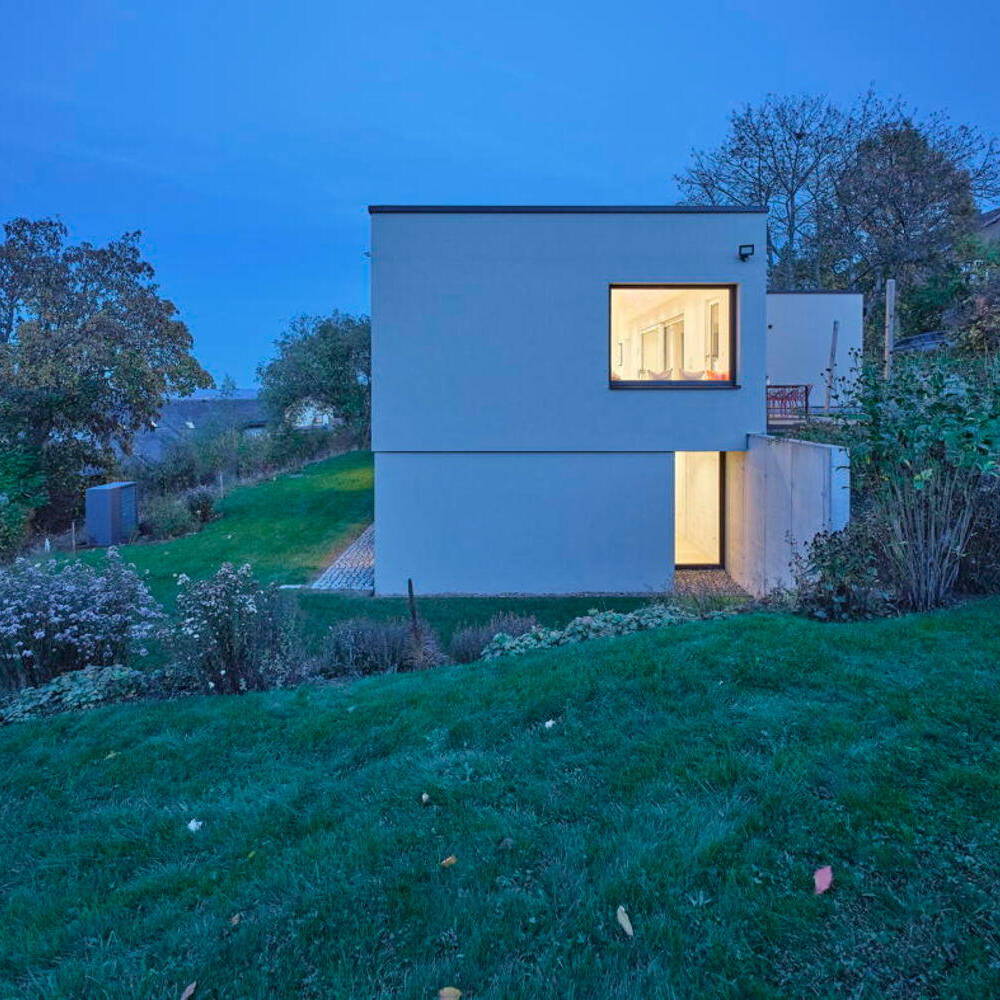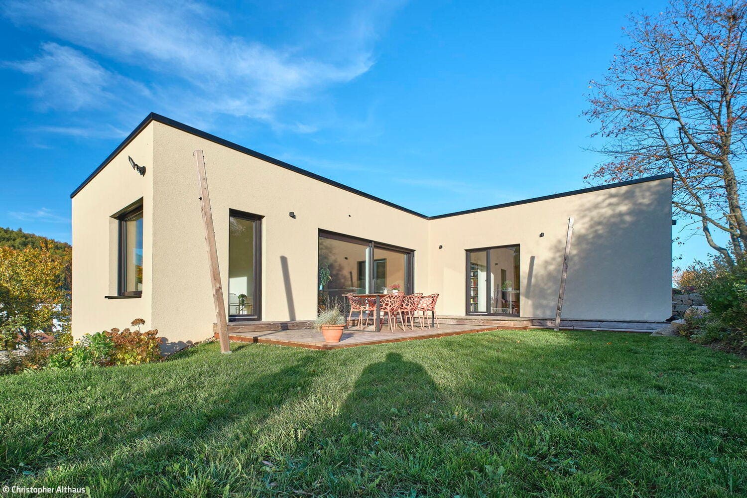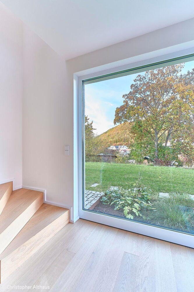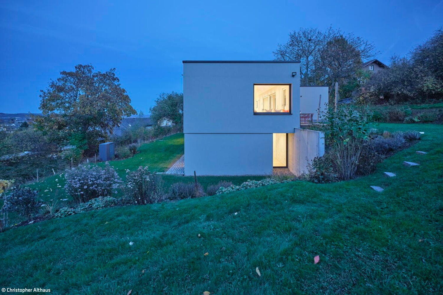 Ein Haus, das die Landschaft versteht. Unter diesem Leitmotiv schufen Althaus Architekten ein Einfamilienhaus, das Reduktion, Klarheit und ökologische Verantwortung vereint. Das Gebäude steht am Rande eines 2.400 m² großen Hanggrundstücks – ein Ort, an dem Licht, Topografie und Aussicht ein charakteristisches Spannungsfeld bilden.