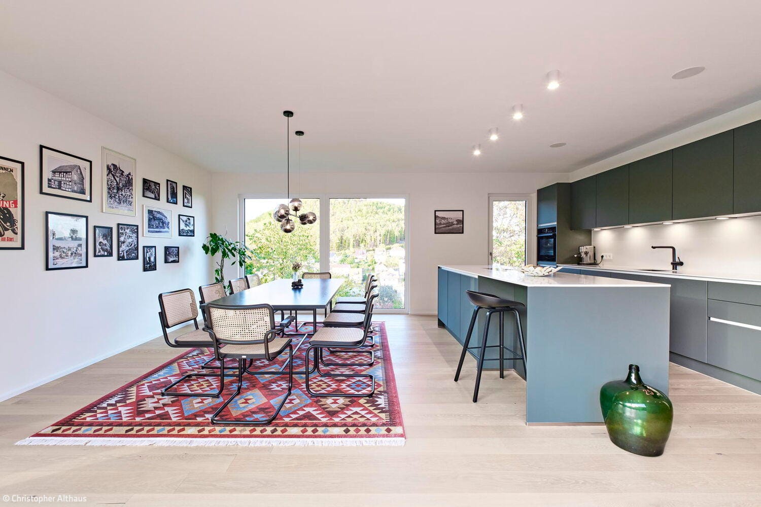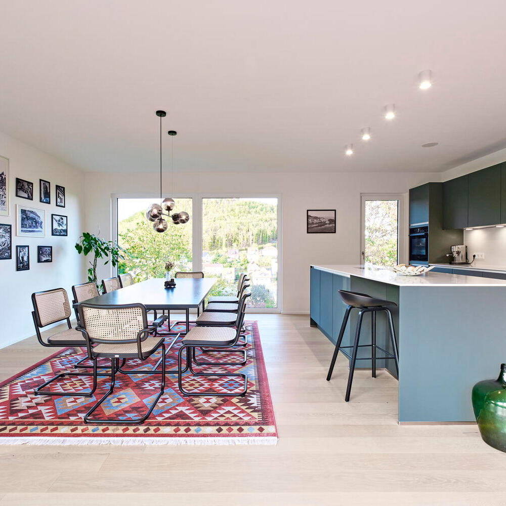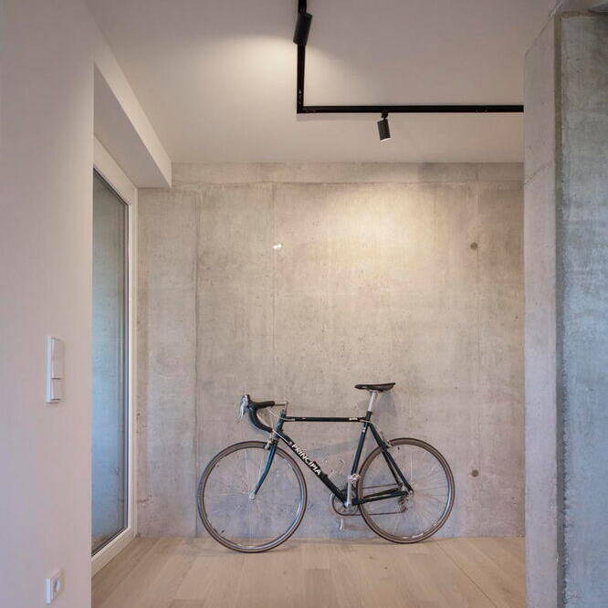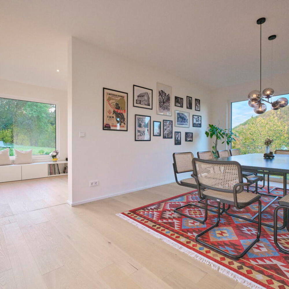 Das Materialkonzept setzt auf ausbalancierte Kontraste: Neutralität versus prägnante Haptik bzw. Neutralität versus Wärme. Kleine Gesten erzählen von der Individualität der Bewohner:innen, so etwa die Leuchten der Großmutter oder eine Wand im Esszimmer, die Familienfotos mehrerer Generationen trägt. Technisch ist das Haus konsequent: Eine Luft-Wasser-Wärmepumpe, eine großflächige PV-Anlage und ein intelligentes Steuerungssystem bilden ein abgestimmtes Energiesystem mit minimalem Verbrauch. Der Holzbau mit Holzfaserdämmung sorgt für eine hervorragende Energiebilanz und einen geringen ökologischen Impact: Effizienzklasse A+.