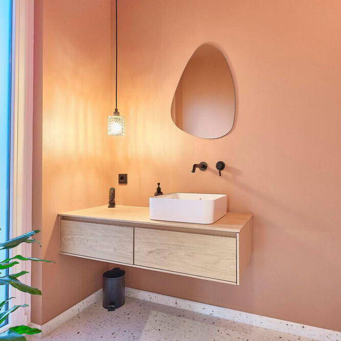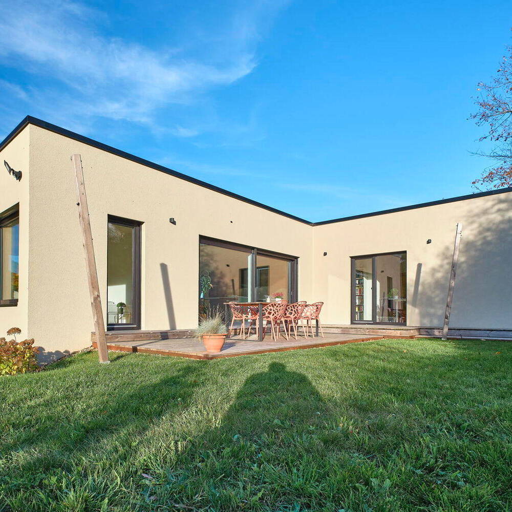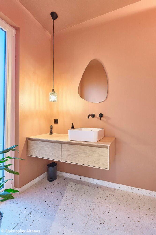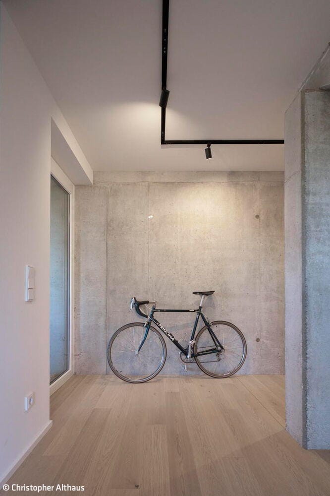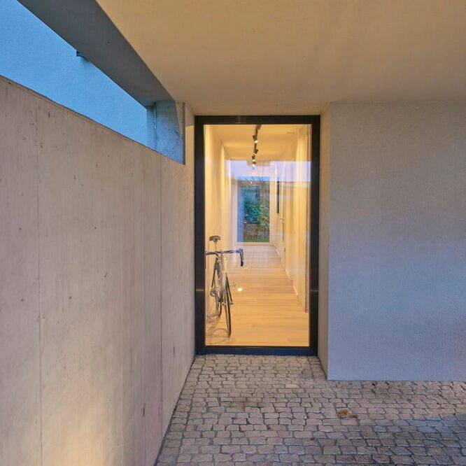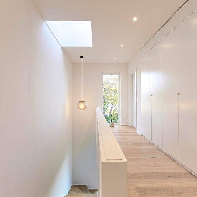 Das Materialkonzept setzt auf ausbalancierte Kontraste: Neutralität versus prägnante Haptik bzw. Neutralität versus Wärme. Kleine Gesten erzählen von der Individualität der Bewohner:innen, so etwa die Leuchten der Großmutter oder eine Wand im Esszimmer, die Familienfotos mehrerer Generationen trägt. Technisch ist das Haus konsequent: Eine Luft-Wasser-Wärmepumpe, eine großflächige PV-Anlage und ein intelligentes Steuerungssystem bilden ein abgestimmtes Energiesystem mit minimalem Verbrauch. Der Holzbau mit Holzfaserdämmung sorgt für eine hervorragende Energiebilanz und einen geringen ökologischen Impact: Effizienzklasse A+.