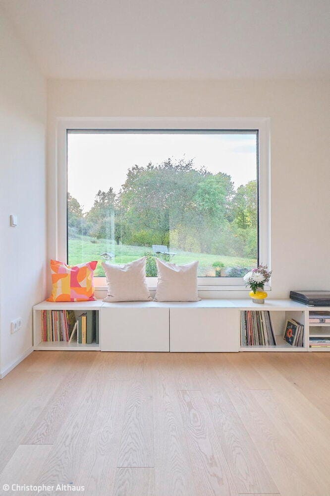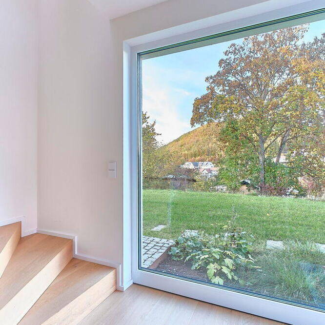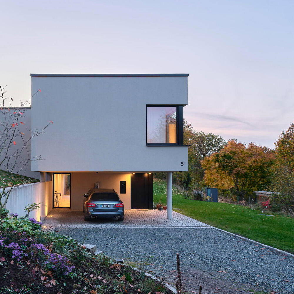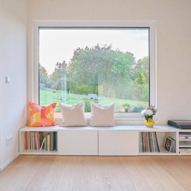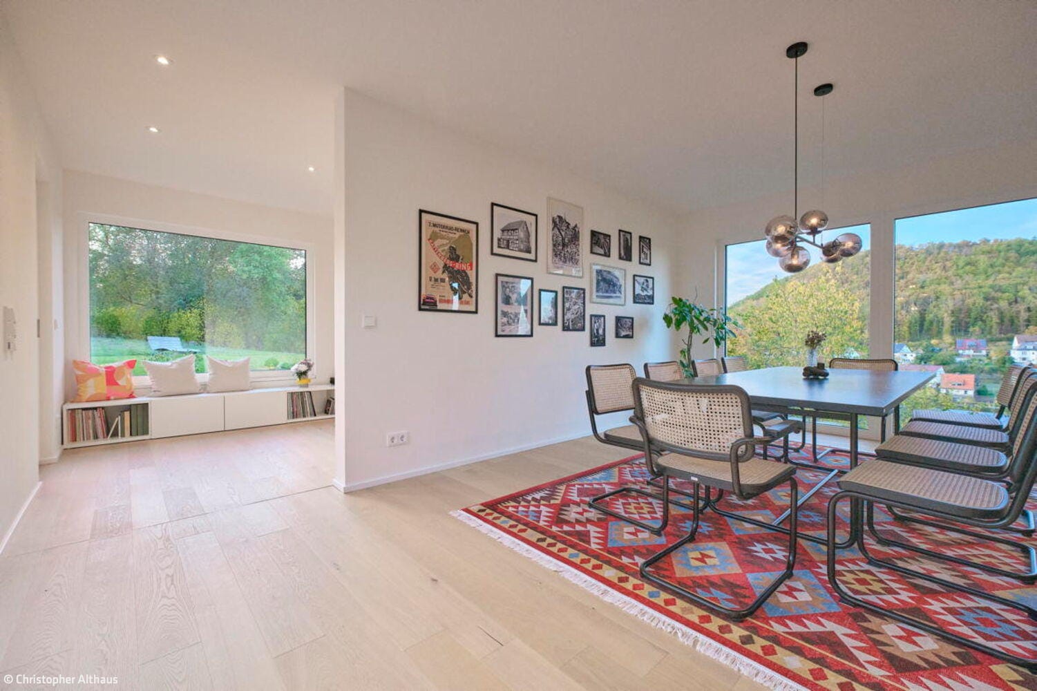 Der Eingangsbereich liegt geschützt unter dem auskragenden Obergeschoss, das zugleich Carport und Überdachung bildet. So gelingt den Architekten eine einladende Geste, die sowohl Funktionalität als auch Form vereint, denn der Zugang führt Ankommende trocken ins Haus. Innen zieht sich eine Stützwand als raumbildendes Rückgrat durch das Erdgeschoss. Sie verankert das Haus im Hang und macht die konstruktive Logik sichtbar. Der zentrale Flur öffnet sich zu den Kinderzimmern, die von hier aus Ausblick und Tageslicht genießen. Der Treppenraum dagegen bleibt bewusst introvertiert: Er rahmt den Blick nach außen und schafft einen Moment der Ruhe zwischen den Ebenen. Im Obergeschoss entfaltet sich das Wohnen als lichtdurchflutete Sequenz: durchgesteckte Räume, Blickachsen zu beiden Seiten, stets im Dialog mit der Umgebung. Die klare Kubatur ermöglicht zwei sehr unterschiedliche Perspektiven: nach Norden in die Weite des Tals, nach Süden ins Licht und den Innenhof. Am Esstisch beispielsweise fällt der Blick auf die Stadt, im Wohnzimmer öffnet sich ein Sitzfenster zur Wiese – zwei Atmosphären, ein Raumgefühl.