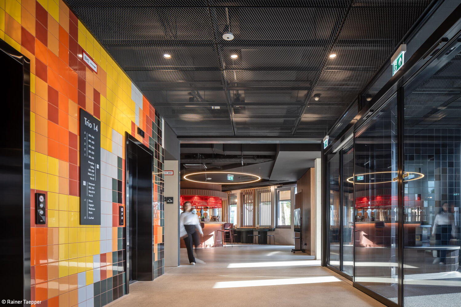Eine Bewegungsachse erschließt den eingeschossigen, abgewinkelten Baukörper und verbindet die Gruppenräume und gemeinsamen Aufenthaltsflächen. Im Zentrum liegt dort ein offener „Marktplatz“ – ein Gemeinschaftsraum und Treffpunkt mit integriertem Frühstücks- und Spielbereich. Ganz wichtig dabei: Sämtliche Aufenthaltsräume sind zum Park hin orientiert. Mehr als 6.500 m² stehen den Kindern zudem als Spielfläche im Außenbereich zur Verfügung. Neben einem befestigten Innenhof gibt es eine Wiese, einen Spielplatz sowie einen weitläufigen, naturbelassenen Abenteuerspielraum. Das Familienzentrum Hippolytusgarten ist Teil eines neuen Ensembles, zu dem das nördlich angrenzende Kirchengebäude St. Hippolytus und das ebenfalls von Atelier Brückner geplante Gemeindezentrum Hippolytushaus gehören.