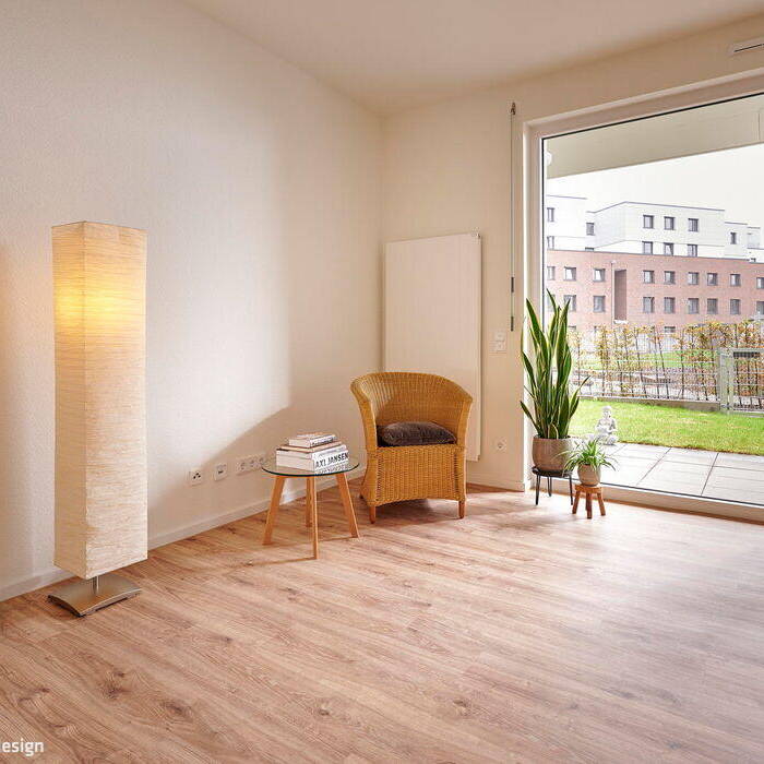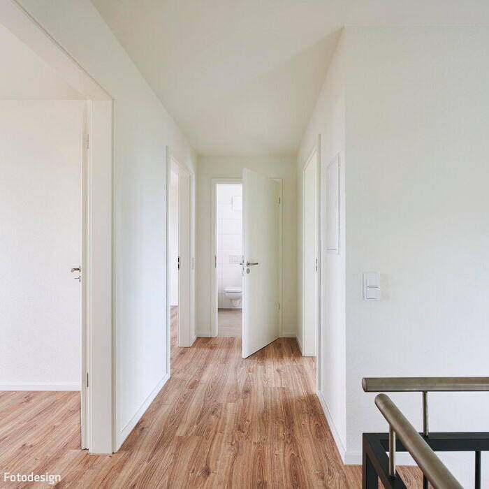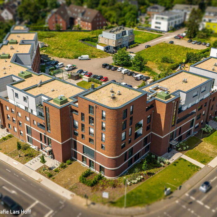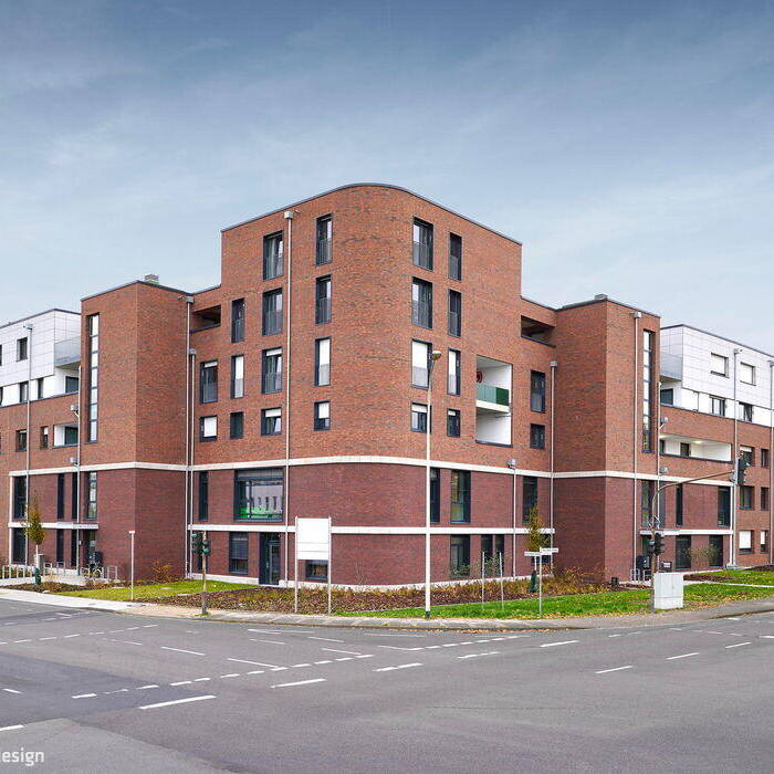 Das Neubauensemble zeichnet sich durch eine moderne, kubische Architektur aus. In Massivbauweise mit Flachdach ausgeführt, sah der Entwurf im Auftrag der Wohnungsgesellschaft GWG Rhein-Erft für die Gebäudehülle eine Kombination aus Klinker-, Putz und Vorhangfassade vor. Im neuen Quartier entstanden 82 Wohnungen für Alleinstehende, Paare und Familien. Besonders wichtig war es der GWG, Wohnraum für größere Familien zu schaffen. Daher wurden im neuen Wohnquartier Wohnungen mit einer Größe zwischen 38 bis 107 m² errichtet, von denen mehr als die Hälfte öffentlich gefördert sind. Die Innenausstattung ist wertig und modern. Die gut geschnittenen Wohnungen sind in den Wohnräumen mit Venylbelag in Eichendesign und in den Küchenbereichen mit Keramikfliesen ausgestattet. Die Bäder sind mit weißem Fliesenspiegel an den Wänden, terrakottafarbenen Keramikfliesen auf den Böden, ebenerdig erreichbarer Dusche oder Badewanne, hochwertigen Armaturen, Wand-WCs mit modernem Design und weiter Ausladung sowie Handtuchheizkörpern ausgestattet. Alle Mieteinheiten verfügen über großzügige Balkone bzw. über Terassen inkl. bodentiefer Panoramafenster sowie Mietergärten im Erdgeschoss oder aber über Dachterassen. Die Wohnungen sind über insgesamt acht Aufzüge barrierefrei erreichbar. Zudem stehen den Bewohner:innen insgesamt 76 Tiefgaragenplätze und 82 Kellerräume zur Verfügung. Im Innenhof finden neben der Außenfläche der Kindertagesstätte, die den Wohnungen zugehörigen Mietergärten sowie eine Spielfläche genügend Raum für Freizeit und Erholung.
