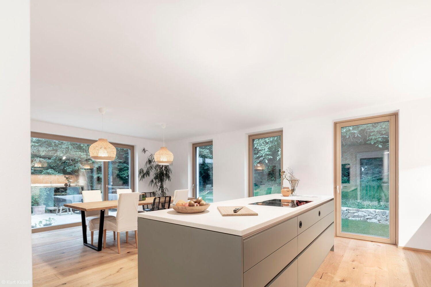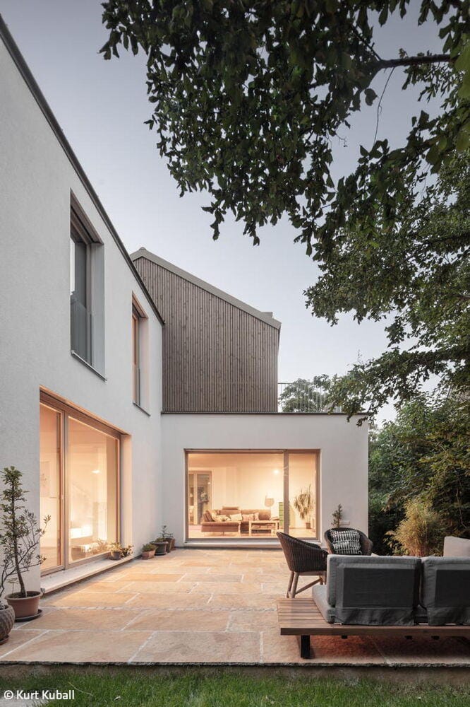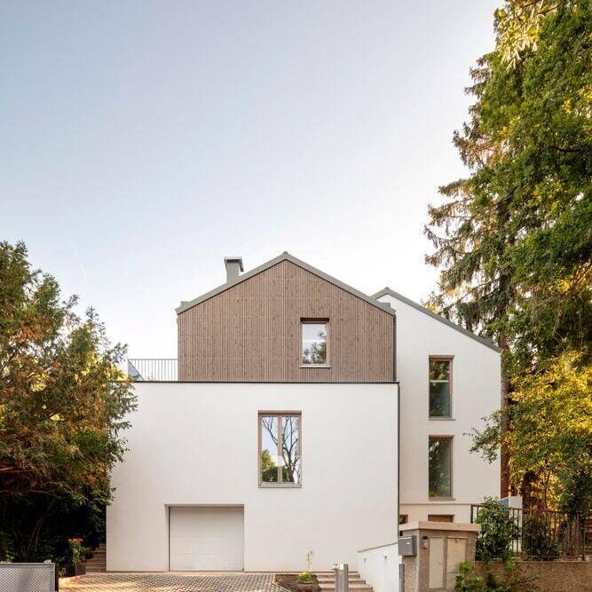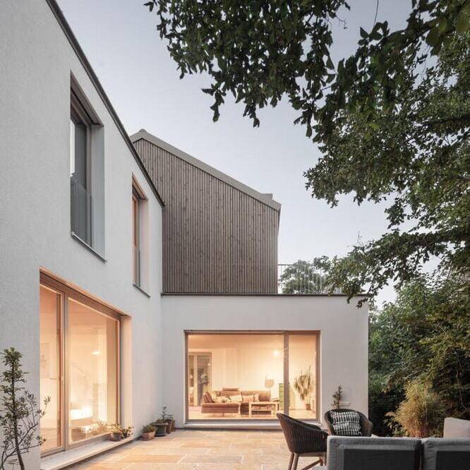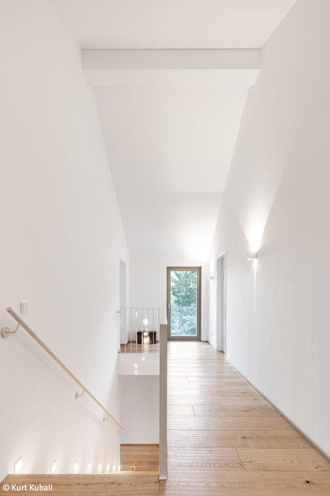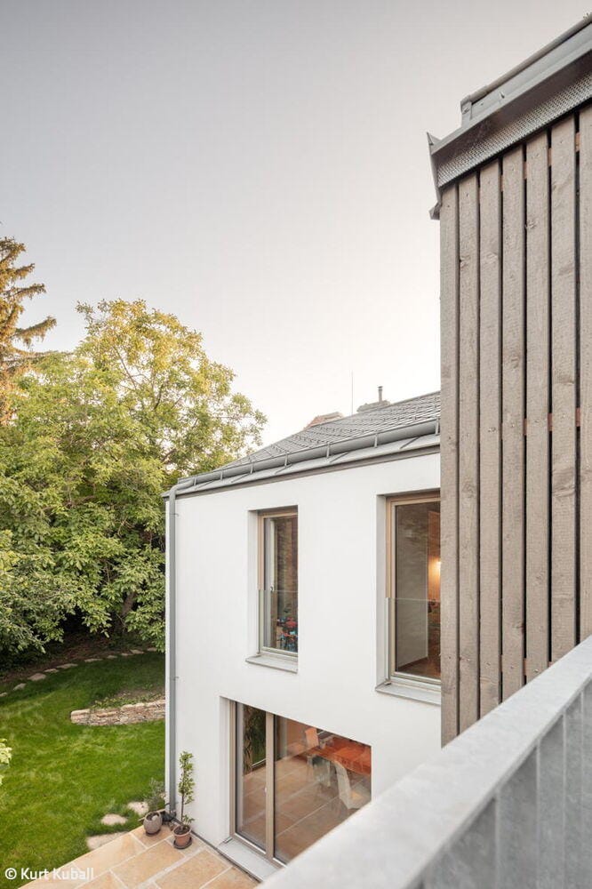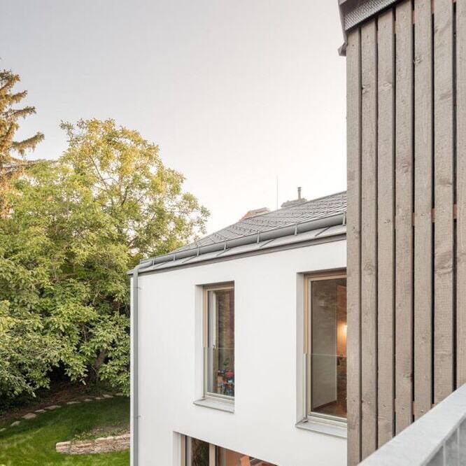 Die gewünschte grundlegende Neuorganisation entstand durch eine gemeinsame Planung von Architekt Sebastian Illichmann und Architektin Martina Hornek sowie unter Mitarbeit von Simon Jackson, die eine radikale Neupositionierung der Erschließung umsetzten. Zwei nun versetzte Treppenläufe schaffen ein zweigeschossiges, lichtdurchflutetes Entree, das den Charakter des Hauses grundlegend verändert. Von hier führt die erste Treppe in den zentralen Wohnraum, der offen mit der großzügigen Wohnküche verbunden ist. Beide Zonen orientieren sich mit breiten Fenstertüren zur Terrasse und in den Garten, wodurch erstmals eine klare Innen-Außen-Beziehung entsteht. Die zweite Treppe – zwischen zwei Wandscheiben eingefasst – führt ins Obergeschoss und markiert bewusst die Grenze zum privaten Bereich. Zwei Schlafräume öffnen sich mit französischen Fenstern zum straßenabgewandten Garten. Das Elternschlafzimmer erhielt einen völlig neu konstruierten, zurückgestaffelten Holzbau mit ostorientierter Terrasse. Dafür wurde der Dachstuhl angehoben und neu errichtet, während die Grundrisse des Bestands erhalten blieben. Konstruktiv stellte die geringe Leistungsreserve der Geschossdecken eine Herausforderung dar. Um die Kosten zu begrenzen, verzichtete das Planungsteam auf aufwendige Verstärkungen und Trockenestrichsysteme. Stattdessen kamen ein leichter Fußbodenaufbau aus Schaumbeton und ein nur fünf Zentimeter starker Spezial-Heizestrich zum Einsatz.