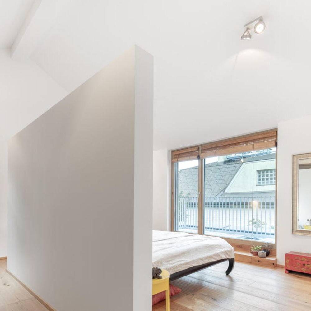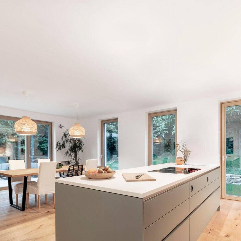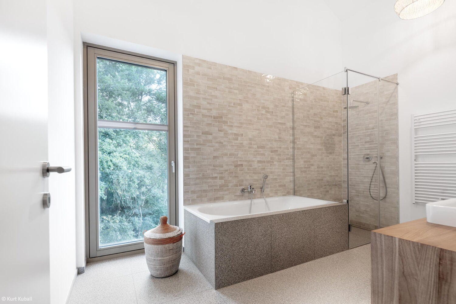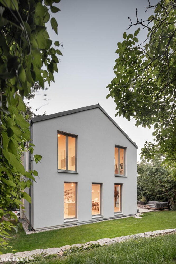 Die gewünschte grundlegende Neuorganisation entstand durch eine gemeinsame Planung von Architekt Sebastian Illichmann und Architektin Martina Hornek sowie unter Mitarbeit von Simon Jackson, die eine radikale Neupositionierung der Erschließung umsetzten. Zwei nun versetzte Treppenläufe schaffen ein zweigeschossiges, lichtdurchflutetes Entree, das den Charakter des Hauses grundlegend verändert. Von hier führt die erste Treppe in den zentralen Wohnraum, der offen mit der großzügigen Wohnküche verbunden ist. Beide Zonen orientieren sich mit breiten Fenstertüren zur Terrasse und in den Garten, wodurch erstmals eine klare Innen-Außen-Beziehung entsteht. Die zweite Treppe – zwischen zwei Wandscheiben eingefasst – führt ins Obergeschoss und markiert bewusst die Grenze zum privaten Bereich. Zwei Schlafräume öffnen sich mit französischen Fenstern zum straßenabgewandten Garten. Das Elternschlafzimmer erhielt einen völlig neu konstruierten, zurückgestaffelten Holzbau mit ostorientierter Terrasse. Dafür wurde der Dachstuhl angehoben und neu errichtet, während die Grundrisse des Bestands erhalten blieben. Konstruktiv stellte die geringe Leistungsreserve der Geschossdecken eine Herausforderung dar. Um die Kosten zu begrenzen, verzichtete das Planungsteam auf aufwendige Verstärkungen und Trockenestrichsysteme. Stattdessen kamen ein leichter Fußbodenaufbau aus Schaumbeton und ein nur fünf Zentimeter starker Spezial-Heizestrich zum Einsatz.