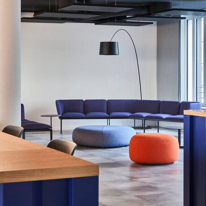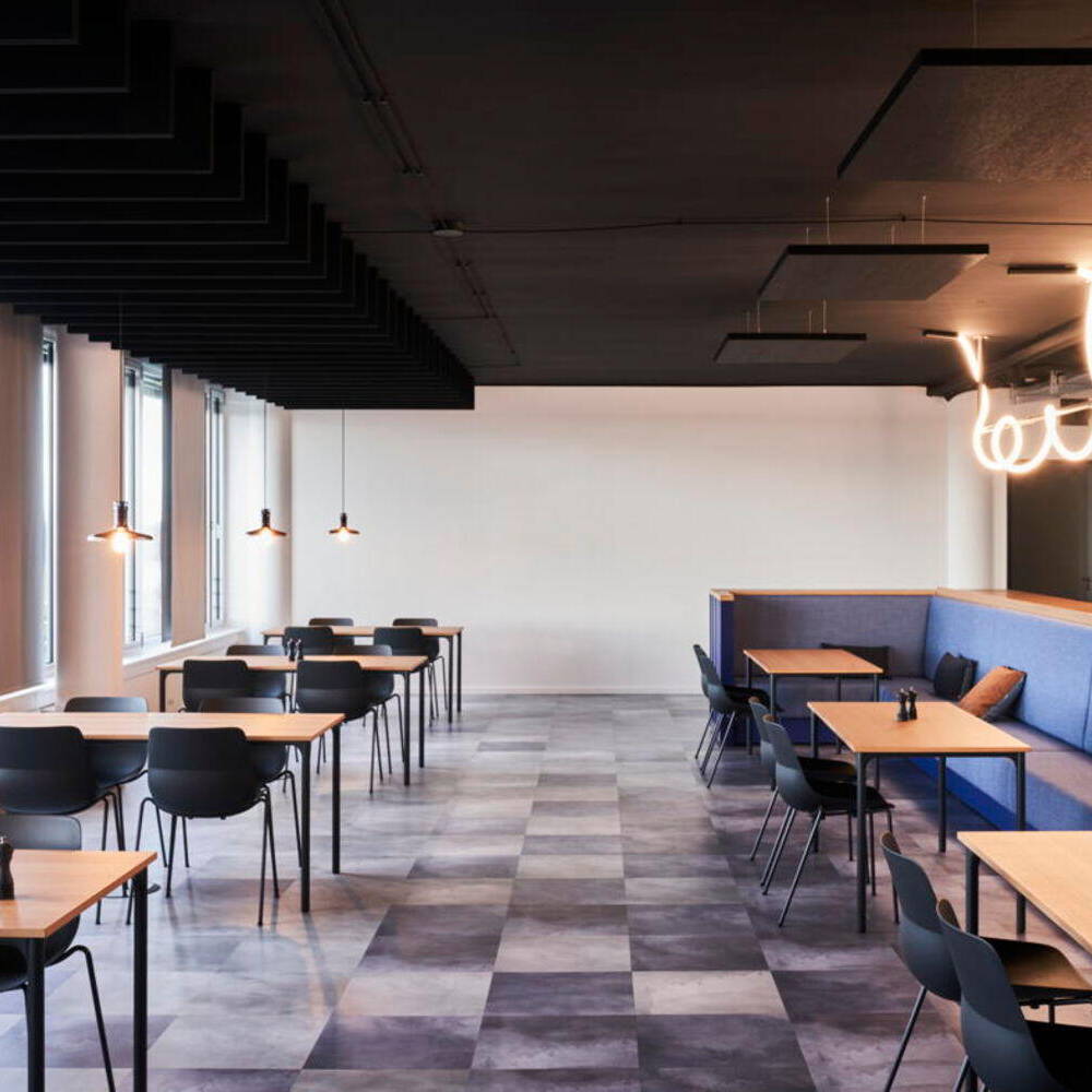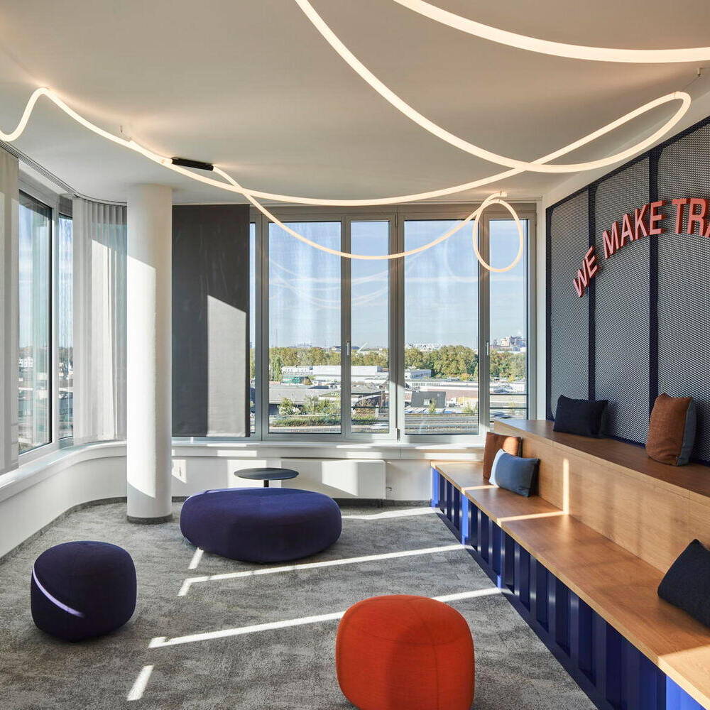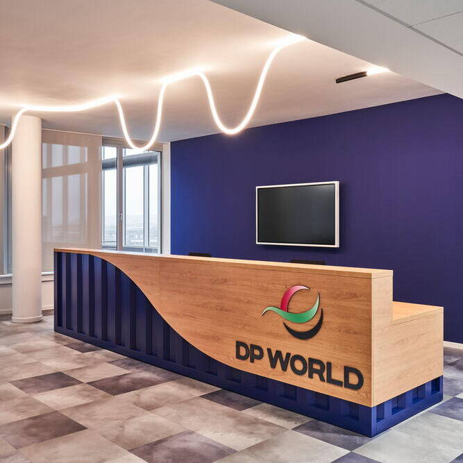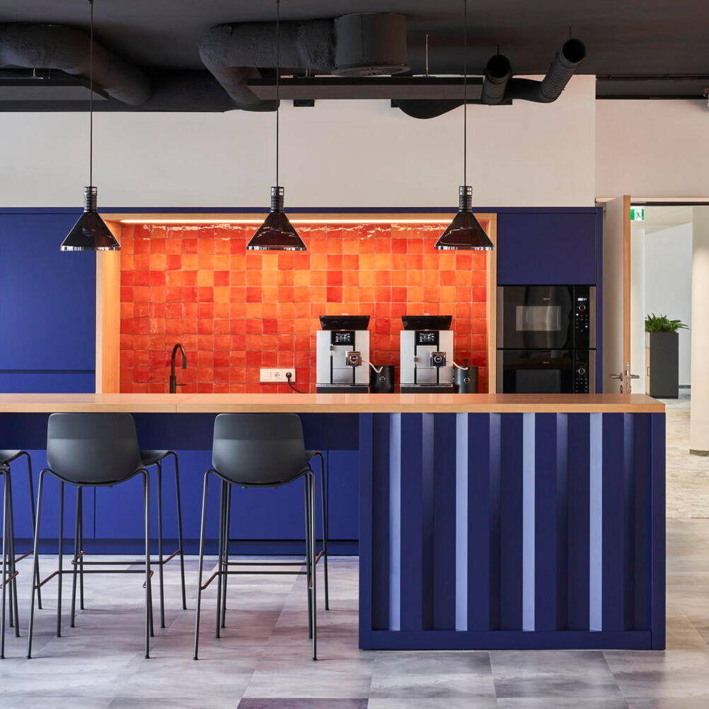 Der Bereich Containerhäfen und Transport auf Wasserwegen bestimmt einen Großteil des Geschäfts von DP World, so dass die neue Bürowelt im Duisburger Innenhafen stimmig verortet ist. In dem bereits bestehenden Bürogebäude wurden das 6. Obergeschoss sowie Teile des 4. Obergeschosses angemietet. Auf insgesamt 3.700 m² entstanden in rund eineinhalb Jahren Projektzeit 164 Arbeitsplätze. Hannah Schulze von pro m² erläutert die Herausforderungen für ihr interdisziplinäres Team: „Es finden sich zwei Farbwelten wieder, die in der generellen Gestaltung aufgegriffen wurden und die Basis des Innenarchitekturkonzepts bilden. Einerseits ist dies die sehr gedeckte Farbwelt, die immer wieder in der Logistik-Branche auftaucht und hier in Kontrast zu den sehr knalligen Brand Colours von DP World steht.“ Ins Interior-Design übertragen, zieht sich Industrial-Look wie ein roter Faden durch das gesamte Konzept. Gearbeitet wurde mit schwarzen Gestellen und Holzoberflächen, so dass die Arbeitsplätze in gedeckten Farben gehalten sind. Das industrielle Konzept wird in den offenen Gemeinschaftsbereichen bewusst aufgebrochen. Hier setzen intensive Farben Akzente, allen voran ein leuchtendes Orange in Kombination mit der kobaltblauen Corporate Farbe des Unternehmens. Auch das Thema Flow, das sich vom Leitspruch des Logistikunternehmens ableitet sowie den Bürostandort am Wasser widerspiegelt, wurde durch die Wahl des Bodenbelags und der Beleuchtung aufgegriffen. So wurde der Teppichboden in zwei verschiedenen Farbtönen im Arbeitsbereich wellenartig verlegt und die blauen Fliesen in den Essbereichen bringen durch eine gepixelte Verlegung Dynamik in den Bodenbelag. Wellenbewegungen ahmt partiell auch die Beleuchtung nach, deren flexible Lichtschläuche ausdrucksstark in Szene gesetzt sind. Zusammen mit den individuell angefertigten Schreinermöbeln in Schiffscontaineroptik, die sich am Empfang sowie an der Sitzbank und Küchenzeile im Work Café wiederfinden, ergibt sich ein stimmiges Gesamtbild. Die wohltuende Atmosphäre hat dazu beigetragen, die bislang an klassische Einzelbüros gewöhnten Mitarbeitenden für die moderne Arbeitswelt zu begeistern: Diese umfasst neben einer Arena für lockere Präsentationen unterschiedlich große Besprechungsräume mit neuester Technik, Projekträume mit agilen Möbeln, ein Work Café für Pausen und flexibles Arbeiten, Loungebereiche, Callboxen und Rückzugsbereiche.