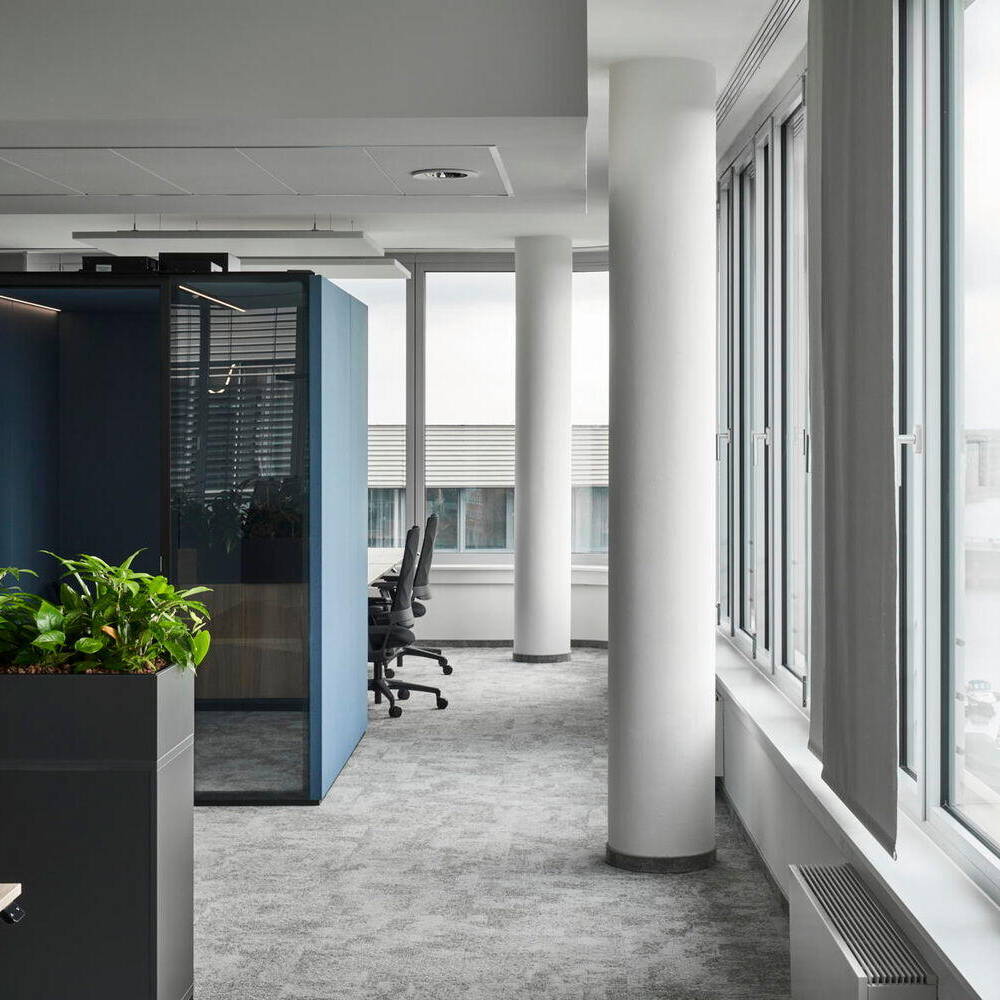 Zwei Standorte in einer Stadt, das empfand das Logistikunternehmen DP World für seine Duisburger Büros als nicht mehr zeitgemäß und beschloss, beide an einem neuen Ort zu bündeln und den Mitarbeitenden dort eine moderne und flexibel nutzbare Bürowelt zu bieten. Dafür holte es den Immobiliendienstleister pro m² aus Düsseldorf ins Boot, dessen Projektleiter Jan Oelze ausführt: „In enger Zusammenarbeit mit unserem Kunden haben wir unsere ganzheitliche Expertise optimal eingesetzt: von der umfassenden Mietvertragsberatung über ein maßgeschneidertes Interior Design bis hin zur frühzeitigen Absicherung von Qualität, Terminen und Kosten.“