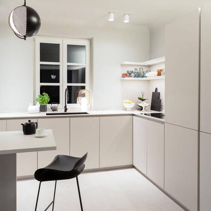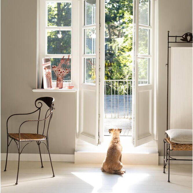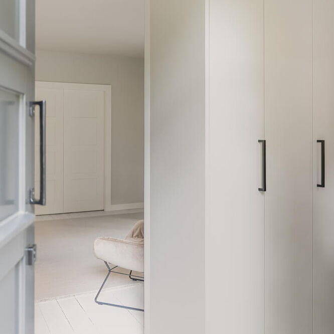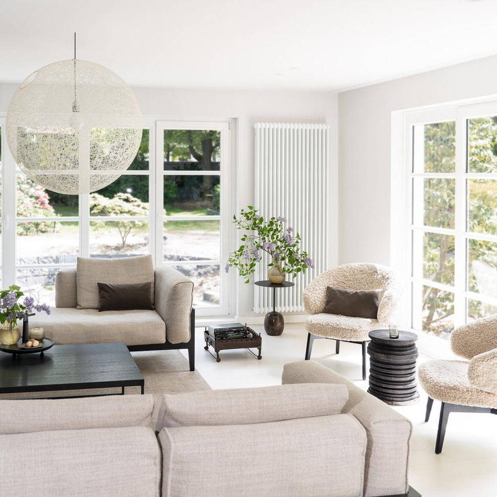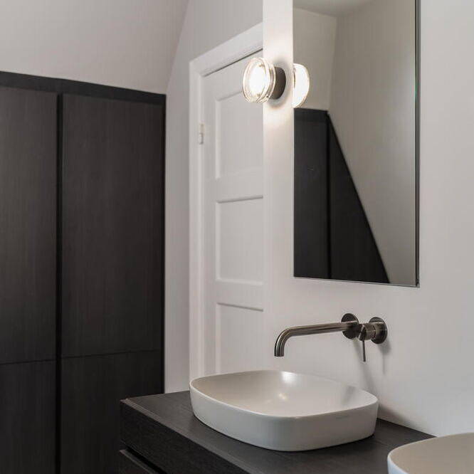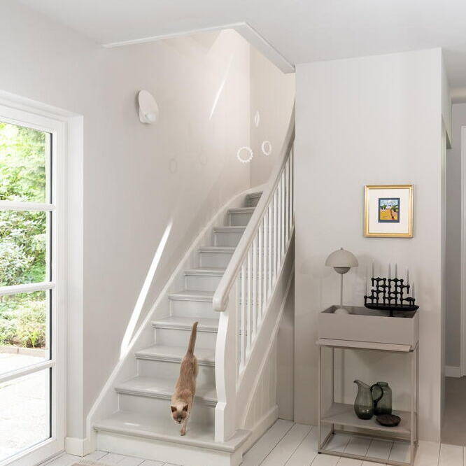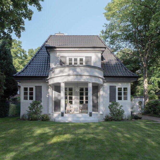 Das 1928 erbaute Haus mit weiß gestrichener Klinkerfassade, Walmdach und vorgesetzten Flachdachgauben wurde energetisch saniert und komplett umgebaut. Die leitende Idee war seinen historischen Charme wieder zu beleben. Die zeittypischen Gestaltungsmerkmale wie die Fensteraufteilung mit profilierten Fensterbänken, Sprossen und Kassetten, Fensterläden aus Holz, gewellte Dachziegel und Kassettentüren wurden mit modernen Materialien wiederhergestellt. Der ursprüngliche Grundriss wurde an die individuellen Vorstellungen und Wünsche der Familie angepasst. Neben der Schaffung eines Arbeitsbereichs im Erdgeschoss entstanden im Keller ein zusätzliches Bad und ein Hobbyraum. Besonderer Wert wurde auf die Sichtbeziehungen aus allen Räumen ins Grüne sowie vielfältige Zugänge aus dem Wohn- und Essbereich in die selbst gestalteten Gartenflächen mit naturnaher, üppiger und pflegeleichter Bepflanzung mit Stauden, Gräsern und Zwiebelblumen gelegt. Handwerklich aufgebrachte Kalkputze und -anstriche in gebrochenen Weißtönen reflektieren das Tageslicht und sorgen mit den großzügigen Fensterflächen für Helligkeit. Die besondere Atmosphäre durch die aufgearbeiteten oder wiederhergestellten historischen Details wird so erlebbar. Die Ästhetik der japanischen und skandinavischen Einrichtungskultur hat die Innenarchitektin zu einer harmonischen Mischung vereint, die sich vor allem durch klare Linien, minimalistisches Design und die Verwendung natürlicher Materialien auszeichnet. Nach Entwürfen von Lisa Fardi angefertigte Einbauten werden durch sorgfältig ausgewählte Möbel, Leuchten, Badausstattung und Accessoires bekannter Designer ergänzt. Handwerkskunst, Struktur, Ausgewogenheit und Gelassenheit zeichnen das neue Zuhause der Familie aus.