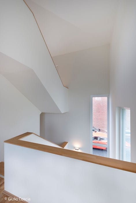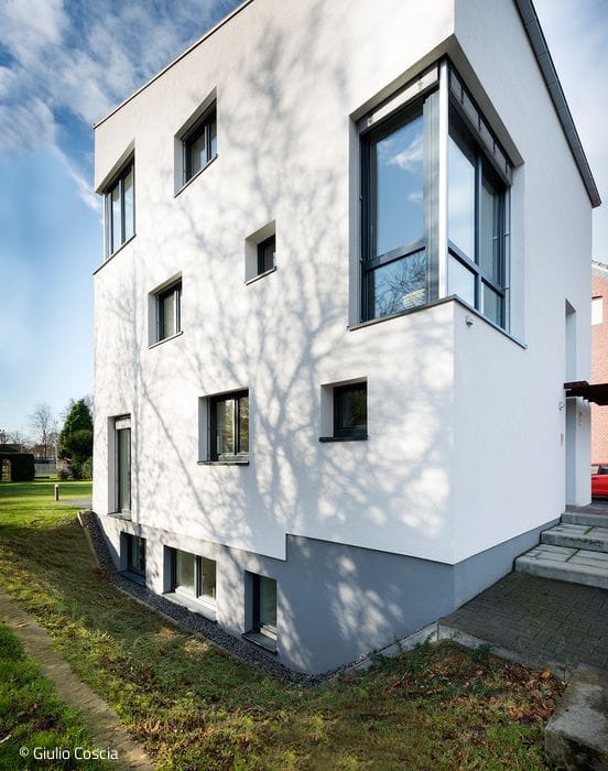 Mitten im Zentrum von Mönchengladbach-Bettrath wollte sich eine Familie mit zwei Kindern ihren Traum vom Eigenheim verwirklichen. Ein energiesparender Neubau war gewünscht. Mehrere Architekten wurden angefragt – man entschied sich für das Büro bau grün!, das als einziges Büro garantierte, ökologische und ökonomische Nachhaltigkeit mit den funktionalen Bedürfnissen und ästhetischen Wünschen in Einklang zu bringen. Die Idee des Architekten, das Haus mit Ausnahme des Kellers in Holzrahmenbauweise zu erstellen und mit einer Putzfassade mit einem Holzfaser-WDVS zu versehen, bedurfte längerer Diskussion. Dass dank der Vorfertigung eine schnellere Bauzeit und höhere Präzision möglich ist, aber auch eine angenehme Wohnatmosphäre entsteht und der CO2-Fußabdruck gesenkt wird, überzeugte schließlich die Bauherren. Alle über dem Keller realisierten Außen- und Innenwände, Decken und der Dachstuhl wurden dabei aus heimischem Kiefern- und Fichtenholz hergestellt. Energetisch ist das Gebäude als Passivhaus konzipiert: Eine 42 cm dicke Zellulose-Einblas- und eine Holzfaserdämmung sowie dreifach verglaste Passivhausfenster sorgen für eine gute Wärmedämmung und hohe Luftdichtheit. Wegen des geringen Energieverlusts konnte auf eine größere Heizung verzichtet werden – allein eine Fußbodenheizung wurde integriert. Eine Sole-Wasser-Wärmepumpe kümmert sich um Warmwasser und Nachheizenergie. Die zentrale Lüftungsanlage, die über ein Gebäudemanagementsystem gesteuert wird, sorgt für aktive und passive Wärmerückgewinnung und schafft dabei ein gesundes Wohnklima – da einer der Hausbewohner Hausstaub-Allergiker ist, kein unwichtiger Nebeneffekt. Räumlich wirkt das Haus trotz seiner relativ kleinen Wohnfläche von 147 m² geräumig: An ein Entree und den kompakten Wohn-, Ess- und Kochbereich schließt sich im Erdgeschoss ein offenes Treppenhaus an. Das Obergeschoss beherbergt die Kinderetage mit eigenem Bad und einem offenen Spielbereich mit Galerie. Die Elternetage befindet sich mit Bad und Ankleide direkt unter dem Dach.