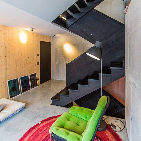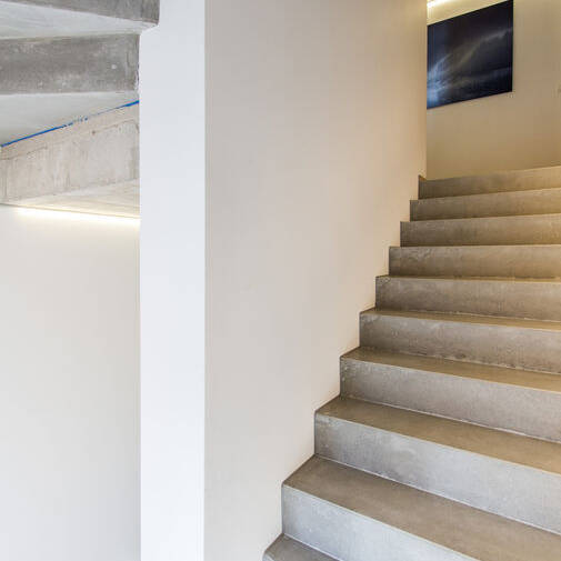 Im Untergeschoss gibt es neben den Kellerräumen der Wohnungen eine Tiefgarage. Im Innern des Gebäudes wurde mit ähnlichen Materialien gearbeitet, wie im Einfamilienhaus: Die Böden sind entweder als Sichtestrich oder mit Holzparkett ausgeführt.