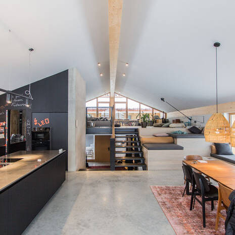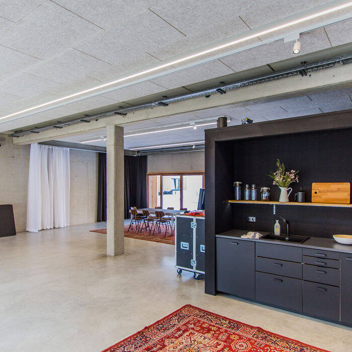 An der Ost- und Nordseite sieht das Gebäude wie eine große Scheune aus. Im Erdgeschoss befindet sich ein Multifunktionsraum, der zu mieten ist und als Fotostudio, Büro oder für Veranstaltungen genutzt wird. Ein Lagergeschoss an der Nordseite kann über eine Tennenbrücke befahren werden.