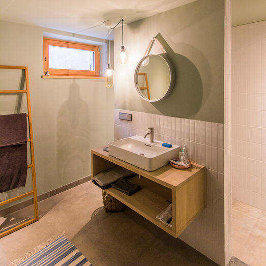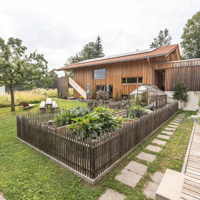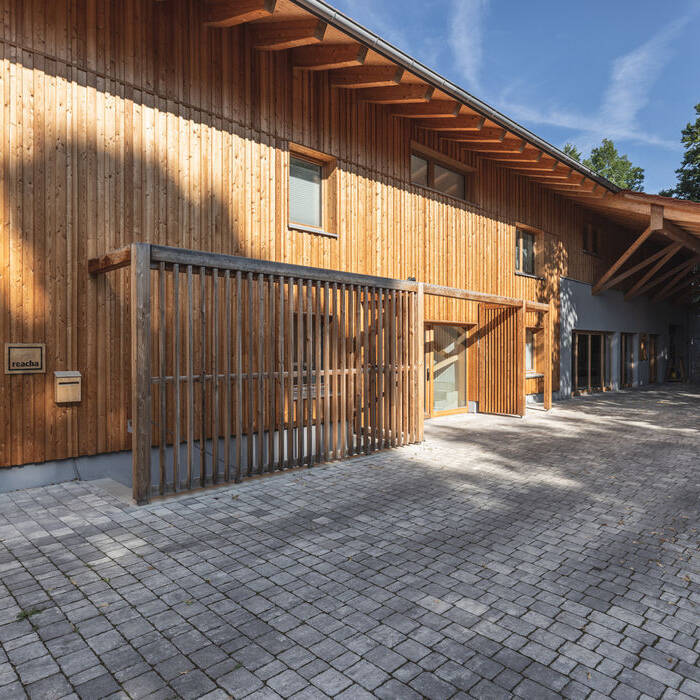 Im Gewerbetrakt, im südlichen Bereich des in Ziegelbauweise mit hinterlüfteter Lärchenholzfassade errichteten Gebäudes, befinden sich fünf Wohnungen unterschiedlicher Größe – eine davon ist barrierefrei.