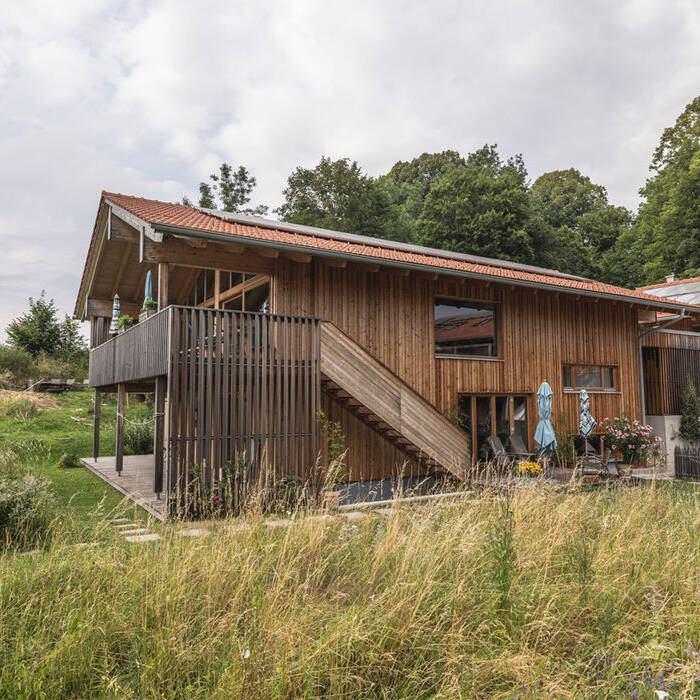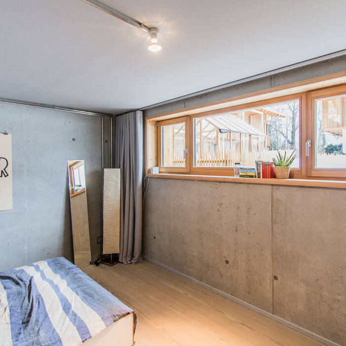 Der Eingang befindet sich am oberen – und am unteren Ende der Treppe betritt man den sehr großen, über die gesamte Breite des Hauses verlaufenden Balkon mit prachtvollem Ausblick. Lediglich das Kellergeschoss und der versteifende Kern in der Mitte des Gebäudes sind aus Stahlbeton, die übrigen Bauteile sind in Holzbauweise, mit tragenden Brettschichtholz-Wänden und Decken realisiert.