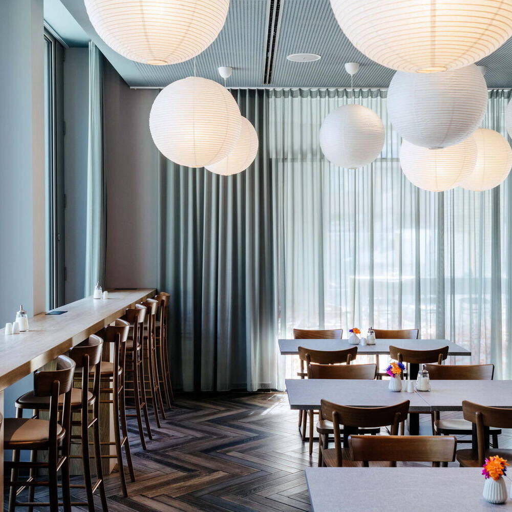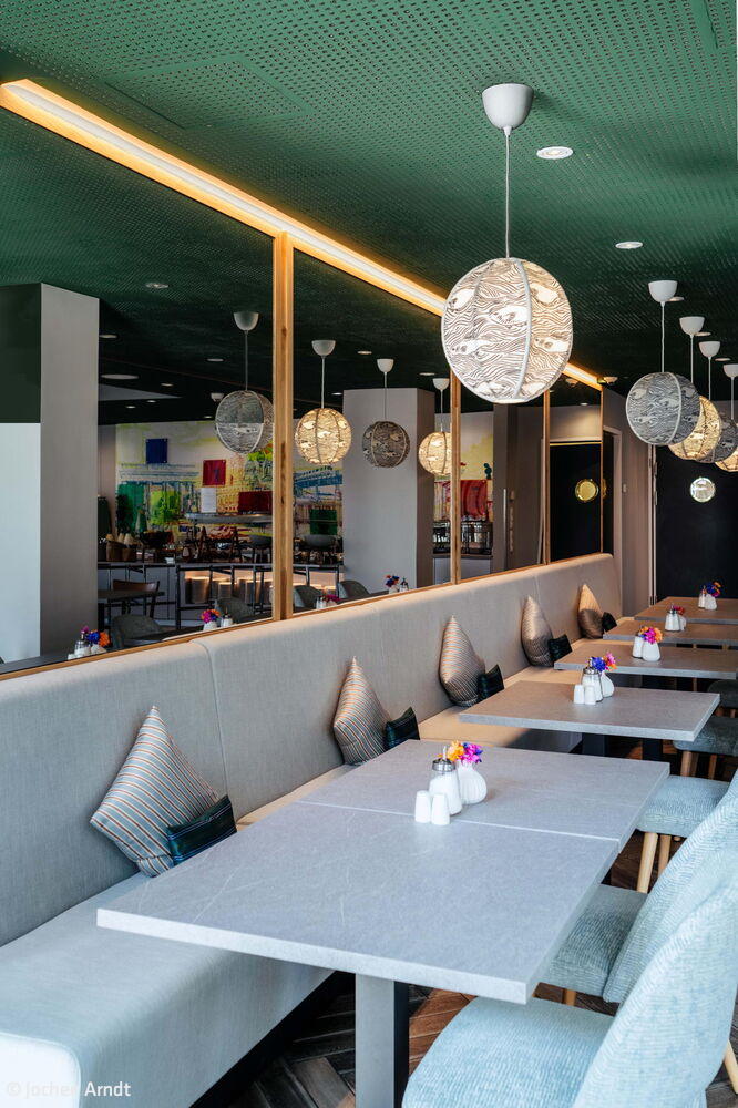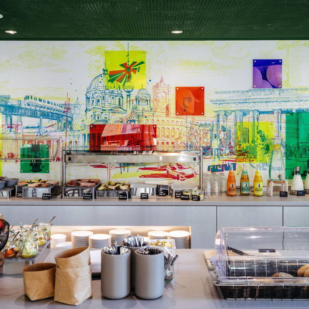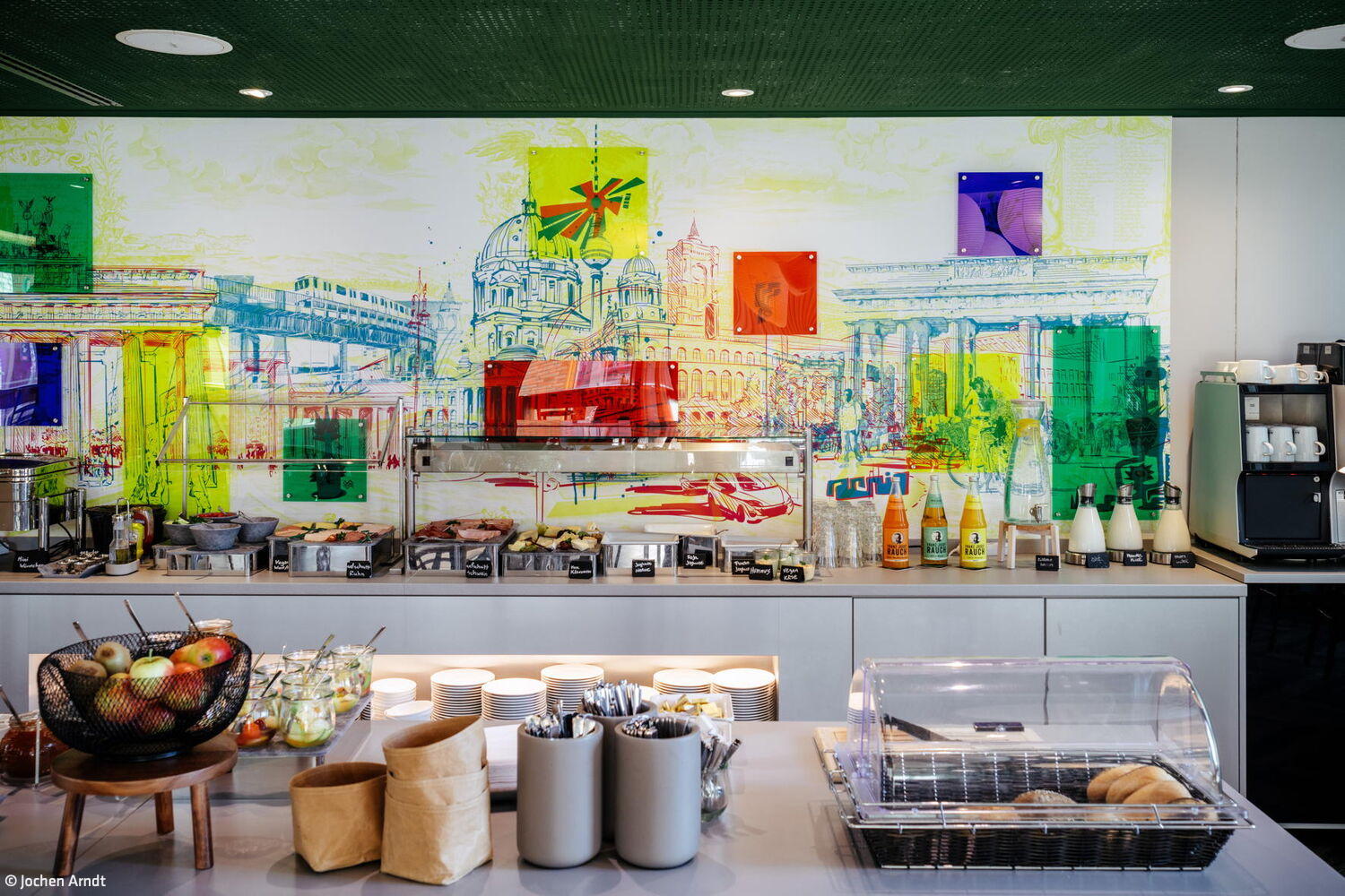 Die für Berlin typische, außergewöhnlich hohe Decke, stellte, obgleich architektonisch beeindruckend, bei der Umsetzung die größte gestalterische Herausforderung dar, da sie schnell kühl oder leer wirken kann. „Unser Ziel war es, einen Frühstücksraum zu schaffen, der weit mehr ist als eine funktionale Zone – ein sanfter, atmosphärischer Auftakt in den Tag, mitten in Berlin“, erklärt Interior Designerin Katharina Klotz. Die natürlichen Farben über den Wandgrafiken wirken durch eine künstlerische RGB-Installation bei Beleuchtung wie durch einen sich langsam lichtenden Morgennebel gefiltert – inspirierend für Gäste, die sich auf ihren ganz persönlichen Tagestrip durch Berlin vorbereiten. Die Grafiken selbst erzählen auf subtile Weise von der Vielfalt der Hauptstadt, von ikonischen Architekturen bis zu zeitgenössischen Stadtlandschaften. Unterstützt wird diese visuelle Erzählung durch das fein abgestimmtes Farbkonzept – sanfte Grün- und Blautöne schaffen eine atmosphärische Leichtigkeit und verleihen dem Raum eine träumerische Note. Das Mobiliar ist handgefertigt von Klotz Interior sowie regionalen Tischlereien.