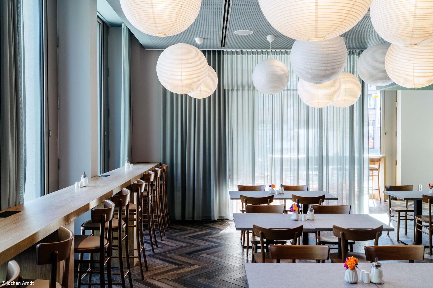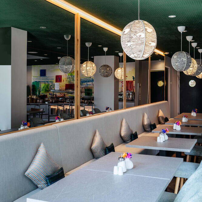 Das Capri by Fraser befindet sich an einem geschichtsträchtigen Ort im Herzen Berlins – und genau hier setzt das neue Gestaltungskonzept für den Frühstücksraum an. Ziel war es, den Gästen bereits am Morgen ein Gefühl für die Stadt zu vermitteln und sie visuell auf eine kleine Reise durch Berlin mitzunehmen. Der Auftrag mit klar definiertem Budget umfasste den Wunsch, den Raum funktional an den Frühstücksservice des Hauses anzupassen und gleichzeitig seine großzügige Raumwirkung zu erhalten. Für die Zukunft war eine hochfrequentierte, robuste Nutzung mit begrenzten Mitteln, aber hoher Designwirkung vorgesehen.
