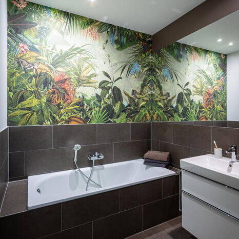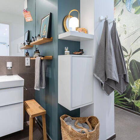 Auch den anderen Räumen wurde das gegeben, was ihnen noch fehlte, um für die Bewohnerin „lebendig“ zu werden: Um die zergliederten Fensterfronten optisch zu beruhigen, wurden maßgefertigte, breite, weiße Holzlamellen montiert, die vor neugierigen Blicken schützen und das einfallende Licht optimal kontrollieren. Im Masterbad breitet sich durch den Einsatz der Motivtapete „Into the Wild“ das lang ersehnte „Dschungelfeeling“ aus – durch den Spiegel optisch erweitert und mit einem platzierten Streiflicht effektvoll akzentuiert. Im Bild verstecken sich Papagei, Tiger und Co. – was auch die kleine Tochter der Bauherrin freut. Die Trennwand zum WC wurde mit einem tiefen Petrolton betont. Das lässt die Holzelemente, in denen locker Badaccessoires verstaut werden können, besonders warm erscheinen.
