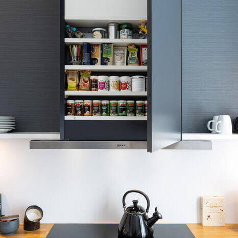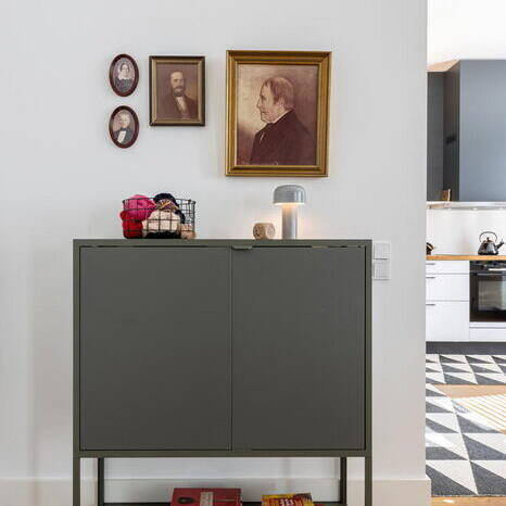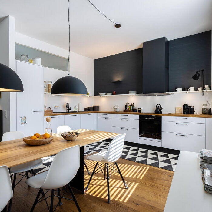 Das erste Einsatzgebiet war die Küche und der angeschlossene Essbereich: Vor allem der am Ende der Küchenzeile platzierte hohe Kühlschrank bot einen unattraktiven Anblick im Raum. Zudem wirkte die rein weiße Schrankzeile, die ohne Dunstabzug und Beleuchtung auskommen musste, verloren an der Wand und ohne gestalterischen Bezug zum restlichen Raum – es überwog eine ungemütliche Stimmung. Ein direkt neben dem Kühlschrank ergänztes, raumhohes Wandstück war die Lösung, um den Küchenbereich optisch ansprechender abzuschließen. Mit der verlängerten Fläche entstand ein ruhiger Hintergrund für ein Highboard mit dem programmatischen Namen „New Order“. Persönliche Erbstücke in Goldrahmen vervollständigen das Ensemble. Die Küchenzeile erhielt zudem einen individuell von der Tischlerei Lamp & Sohn maßgefertigten, flachen Oberschrank mit unauffällig integriertem Dunstabzug und dem langersehnten Stauraum für Gewürze. Seine anthrazitfarbene Front wird seitlich von einer passenden Wandbekleidung flankiert und führt den Hell-Dunkel-Kontrast fort, wie er bereits im Mobiliar und bei den Hängeleuchten anklingt. Der bereits vorhandene Teppich aus gewebtem Vinyl mit Schwarzweiß-Muster wurde passend zur L-Form umgearbeitet. Durch den schwarzen Zeilensockel kommt er nun viel besser zur Geltung. Der gesteigerte Kontrast im Raum wirkt im Zusammenklang mit den warmen Hölzern von Eichenparkett und Esstisch sehr harmonisch, wobei letzter erst einmal von einer Schutzabdeckung aus Kunststoff „befreit“ werden musste.