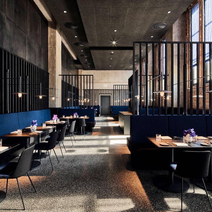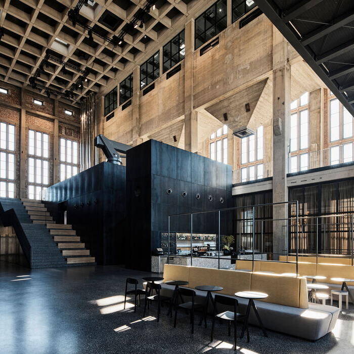 Fast liesse sich diese Geschichte beginnen mit „Es war einmal…“: 1940 hatten die Nationalsozialisten den Plan, den Hauptbahnhof als Verkehrsknotenpunkt nach Laim zu verlegen. Während des Umbaus mussten kleinere Ersatzbahnhöfe geschaffen werden, und dafür brauchte man – und zwar schnell – ein Kohle-Heizwerk. Der Bau – der heute das Bergson Kunstkraftwerk beheimatet – wurde in Aubing errichtet, während des Krieges nicht vollendet und in der Nachkriegszeit nach kurzer Inbetriebnahme 1988 aufgegeben, der Verrottung anheim gegeben – und schließlich vergessen. Die Bauherren des heutigen Kunstkraftwerks erwarben das Anwesen 2005. Bei Baubeginn war der Kubus in einem maroden Zustand, eine Wand nur provisorisch, das Dach ruinös, die einstigen Heizkessel unrettbar verrostet, und auch die früheren Kohlesilos, mussten erneuert werden. Nach dreijähriger Bauzeit ist es nun so weit – der 1. Bauabschnitt ist abgeschlossen. Kaskadenartig werden zwei weitere folgen und im Oktober wird das Gesamtprojekt abgeschlossen sein. Die Hauptakteure dieser Herkulesaufgabe sind die Bauherren, die Brüder Christian und Michael Amberger, sowie Stenger2 Architekten, die mit ihrem Konzept den Zuschlag erhielten. Betritt man dieses gigantische Bauwerk, einen monumentalen rostroten Würfel mit Klinkerfassade, der von aussen bereits staunen macht, verschieben sich die Maßstäbe im Innern erneut. Als vergleichsweise kleiner Mensch steht man unter einer kassettierten Decke in 25 Metern Höhe in einem riesigen Atrium. Die Dimensionen sind schier unfassbar. Die Tagesbar „Anima“ mit ihrer langen Theke empfangt die Gäste. In der Größe der früheren Heizkessel erhebt sich ein schwarzer Turm. Darin verbirgt sich die Küche, die das Restaurant „Zeitlang“ und einige Satellitenküchen versorgt.