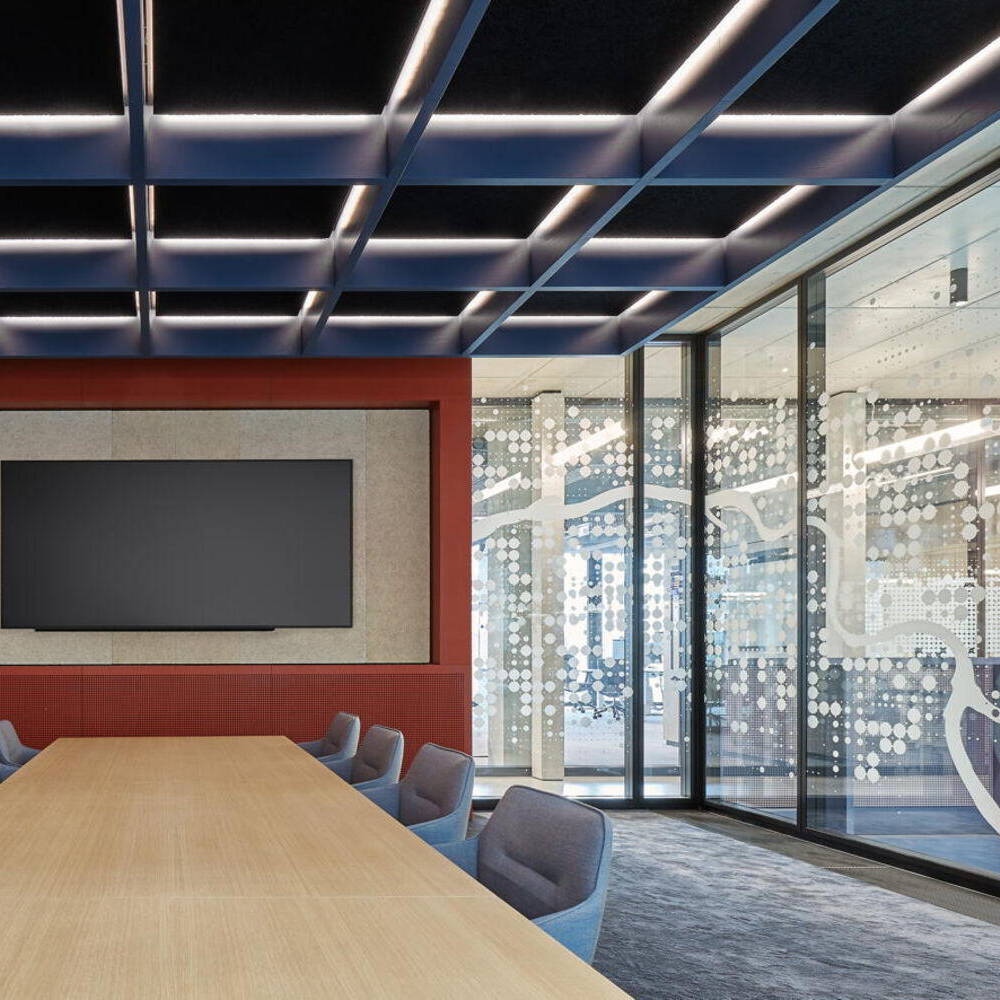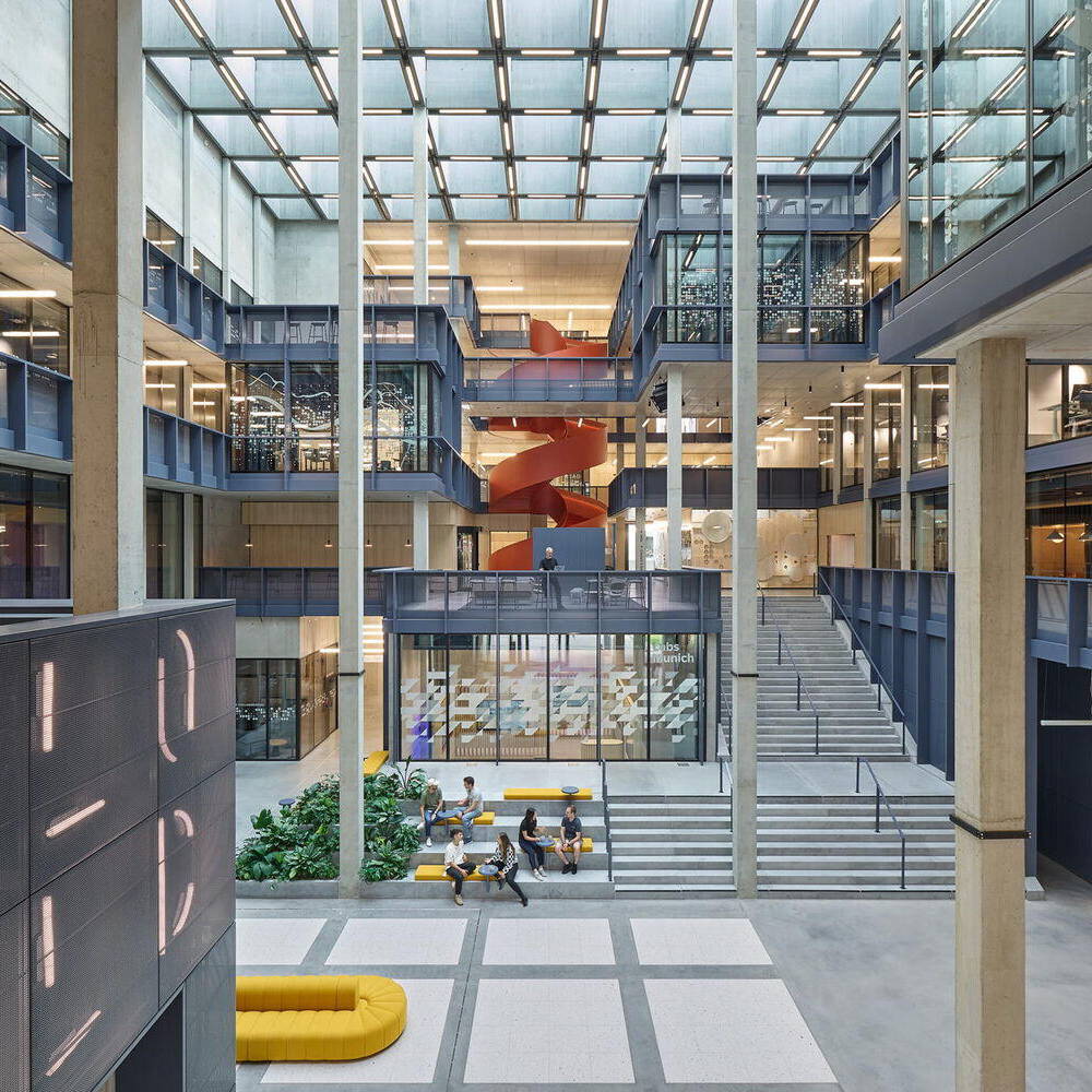 Die gemeinsame Mitte im Erdgeschoss ist der öffentliche Raum, der auch Besucher:innen zur Verfügung steht. Hier befinden sich die Vitalbar, ein Auditorium für Vorträge und Veranstaltungen sowie die SAP-Experience-Fläche, die aktuelle Projekte und Innovationen erlebbar machen. Eine breite Freitreppe führt nach oben und eine imposante rote Wendeltreppe ist nicht nur Blickfang – sie verbindet im rückwärtigen Gebäudebereich die nicht-öffentlichen Bereiche miteinander. Die Büroflächen von SAP und der TUM sind getrennt organisiert, jedoch durch zahlreiche kleine und größere Kommunikationszonen vernetzt. Diese offenen Bereiche fördern spontane Begegnungen und den interdisziplinären Austausch zwischen den Nutzenden. Beim Innenausbau wurde ein erheblicher Teil von der Lindner-Group ausgeführt, wie etwa individuell gestaltete Glas- und Holztrennwände, die eine Abtrennung ermöglichen und als Schallschutz fungieren. Auch hohe Brandschutzmaßnahmen wurden von Lindner ausgeführt.