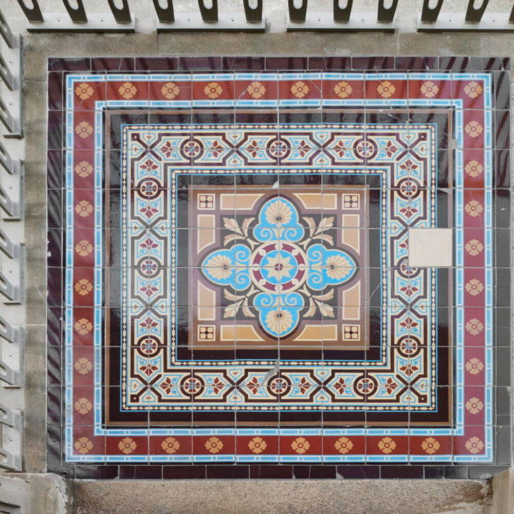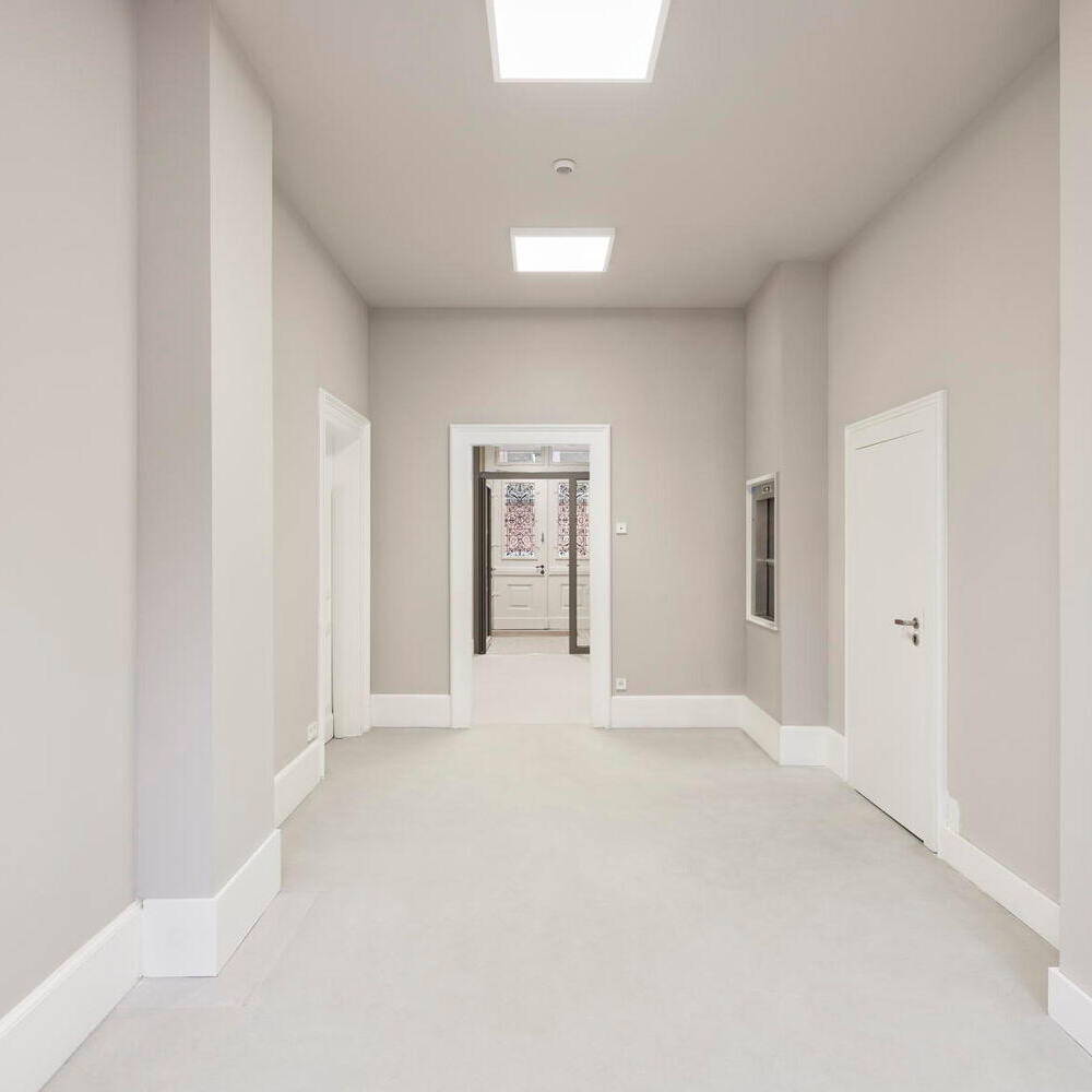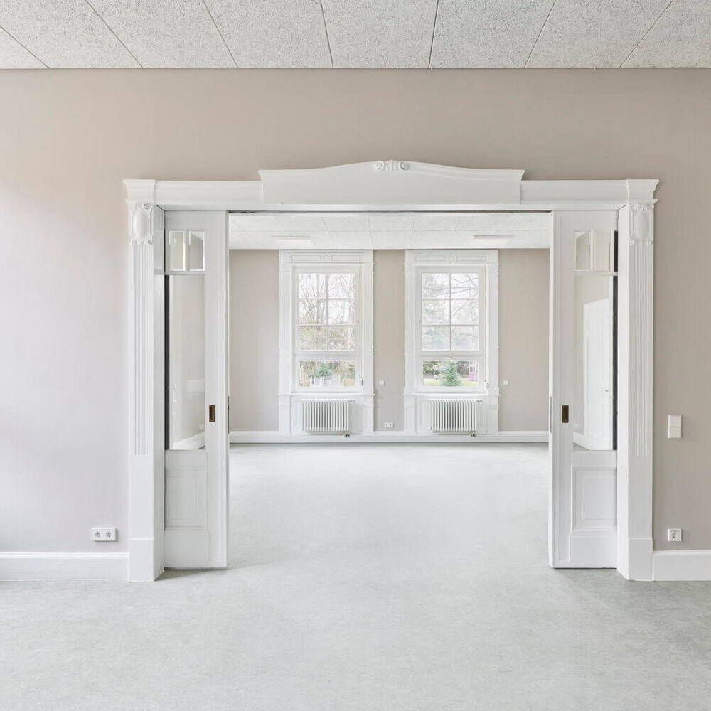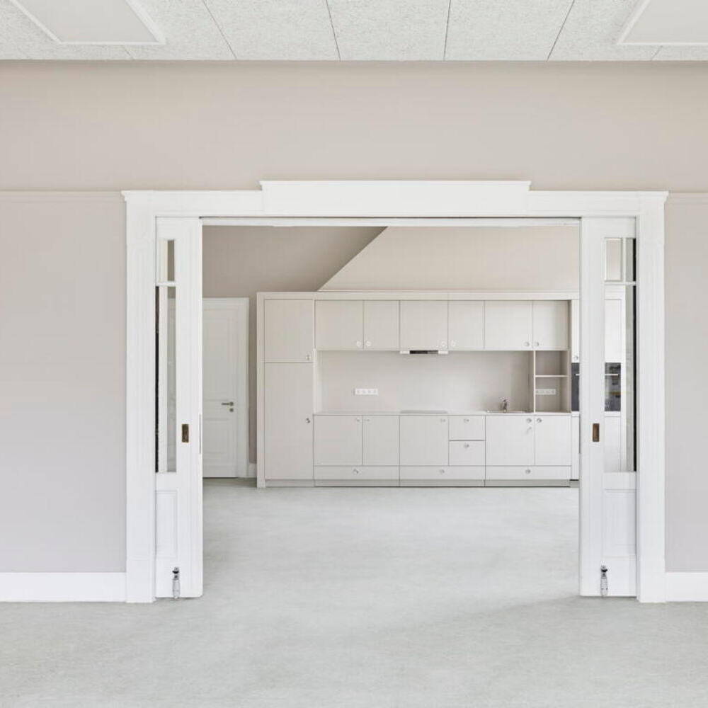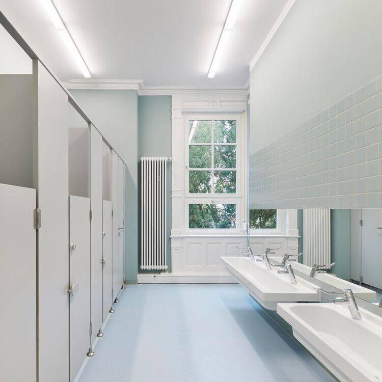 Auf Wunsch des Auftraggebers lag der Fokus darauf, Bestandsmaterialien zu erhalten und Recyclingmaterial aus anderen öffentlichen Gebäuden wiederzuverwenden. So wurden in einer Schule ausrangierte Akustikplatten sorgfältig ausgebaut und in die Villa integriert. Bei der Dachsanierung wurden die historischen Betondachziegel behutsam ausgebaut, bewertet, gelagert und nach den Dämmarbeiten wiederverwendet. Nur die schadhaften Ziegel wurden durch neu angefertigte und farblich passend engobierte ersetzt. Als klar war, dass die historischen Fußböden in einigen Räumen nicht mehr vorhanden waren, entschied man sich dafür, die nachgerüsteten Bodenbeläge aufzuarbeiten und sie an Fehlstellen grafisch im Patchwork-Stil zu ergänzen. Das Farbkonzept der Räume spielt mit der vorhandenen Materialvielfalt und setzt auf leichte Blau-, warme Grau-, Senf- und helle Grüntöne. Historische Holzelemente wie Türen, Fenster, Vertäfelungen und Sockelleisten bekamen eine weiße Lackierung. Diese zieht sich wie ein verbindendes Band durch das gesamte Gebäude.