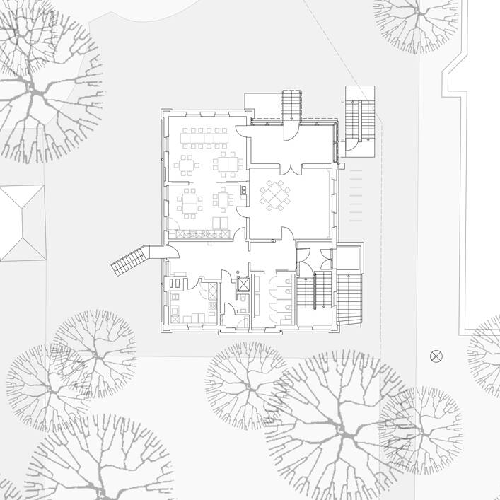 Die ursprüngliche Grundrissstruktur folgte dem bürgerlichen Wohnprinzip mit großzügigen, teils gefangenen Räumen. Durch Rückbau wurden diese Raumzusammenhänge wieder hergestellt und mit den Erzieherinnen ein pädagogisches Konzept entwickelt, das auf den Ort optimal abgestimmt ist. Nun gibt es vier große Gruppenräume, ergänzt durch Themenräume zum Basteln, Malen und für Bewegung. Ein besonderes Detail der Verknüpfung von Historie und moderner Nutzung ist die Kinderküche, die sich heute an der Stelle der früheren offenen Feuerstelle, des Herdes, befindet. Dazu wurde der ehemalige Abzug in die Gestaltung der Küche integriert und als Esse neu entworfen.