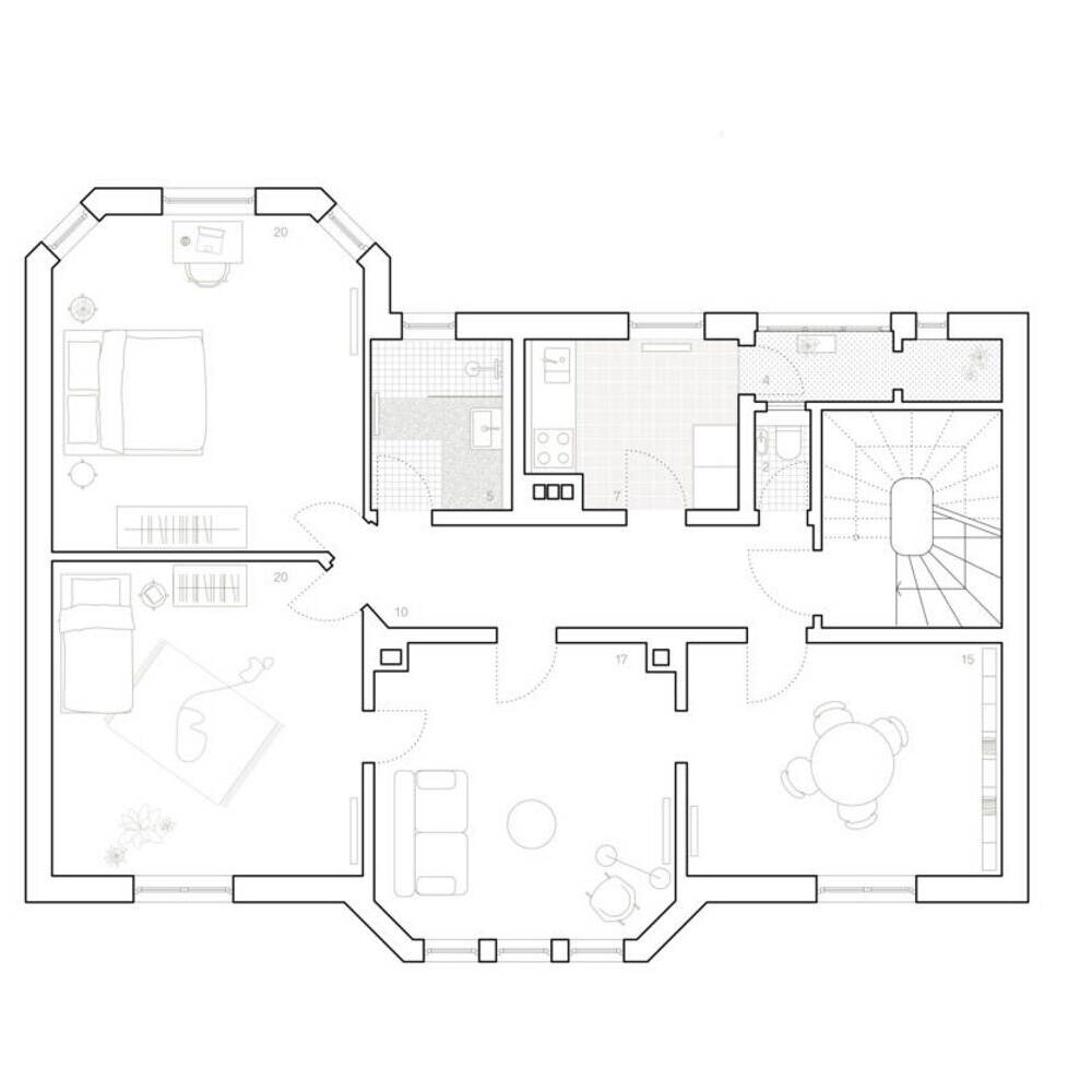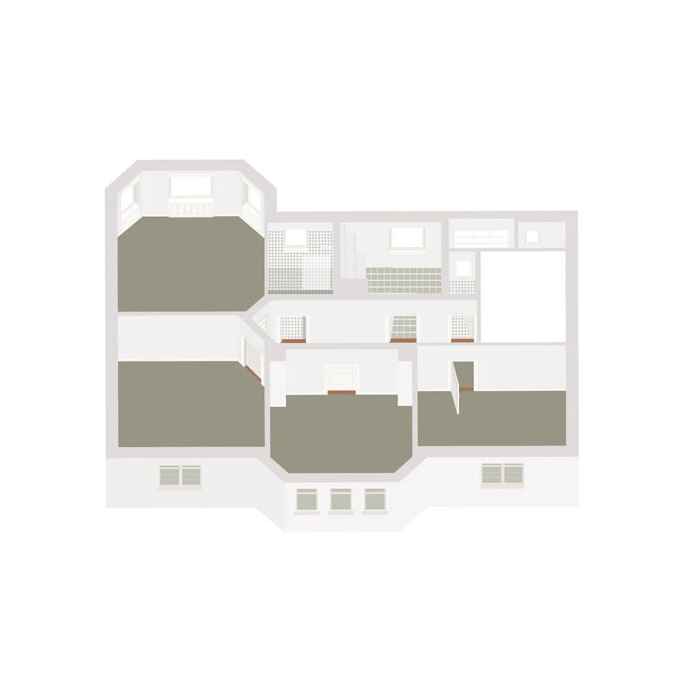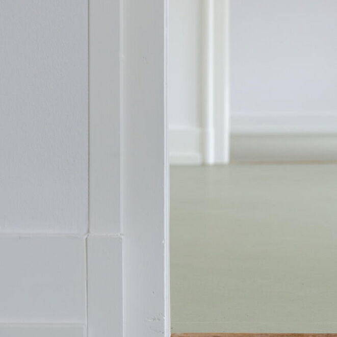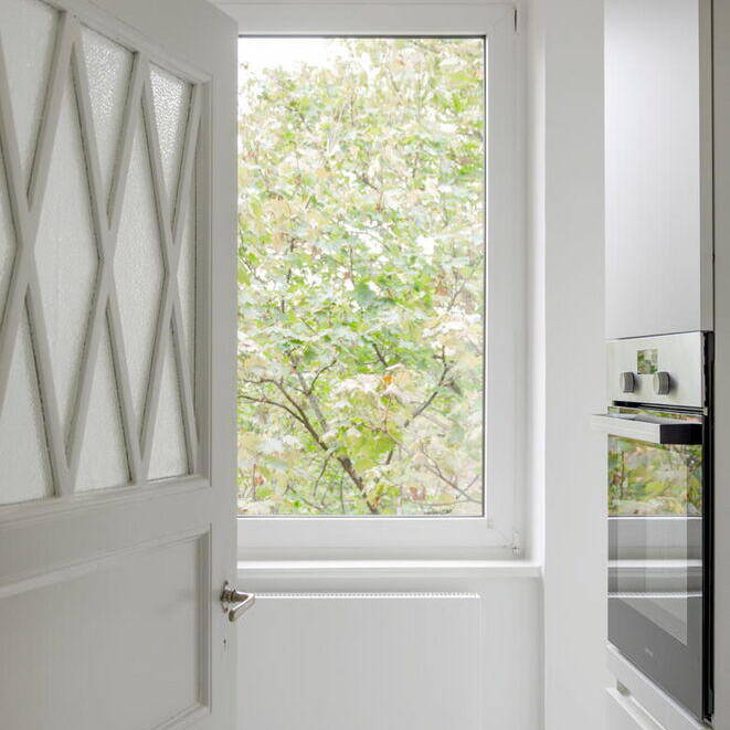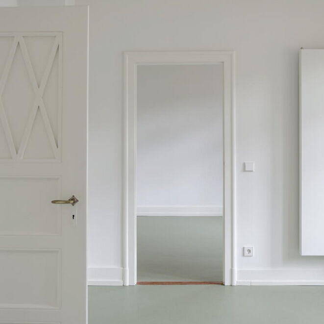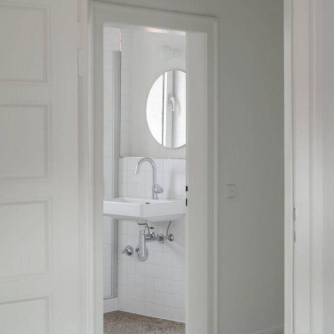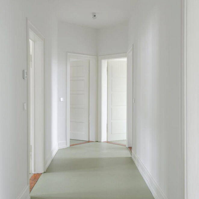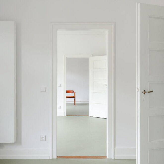 Bei der grundlegenden Sanierung der Vierzimmerwohnung fokussierten sich die Architekt:innen von Studio Cross Scale darauf, die räumlich charakteristischen Merkmale aufzuarbeiten und – wo notwendig – optisch und funktional wiederherzustellen. Besonderes Augenmerk widmeten sie den Holzelementen wie den Sockelleisten und Lamperien sowie den Kassettentüren. Sie wurden allesamt sorgfältig von überlagernden Schichten befreit, Beschädigungen repariert, Oberflächen geschliffen und gegebenenfalls fehlende Elemente neuzeitlich interpretiert ergänzt. Diese grundlegende und detailgenaue Aufarbeitung gewährleistet sowohl die Ästhetik als auch die Langlebigkeit der Holzelemente. Glücklicherweise war auch der zeitlos schöne und widerstandsfähige Terrazzoboden im jetzigen Badezimmer unter verschiedenen Bodenbelägen noch intakt und aufzuarbeiten.Für die Oberflächen wählten die Architekt:innen vor allem Weiß und dezente Farben, die sich mit den hochwertigen Materialien stimmig in das Gesamtbild einfügen und den historischen Charakter der Wohnung unterstreichen. Der lindgrüne Bodenbelag aus Linoleum bildet eine angenehme Basis für die Wohn- und Schlafräume. Die neuen und modernen Sanitärobjekte und Küchenmöbel nehmen sich gegenüber den historischen Elementen angenehm zurück.