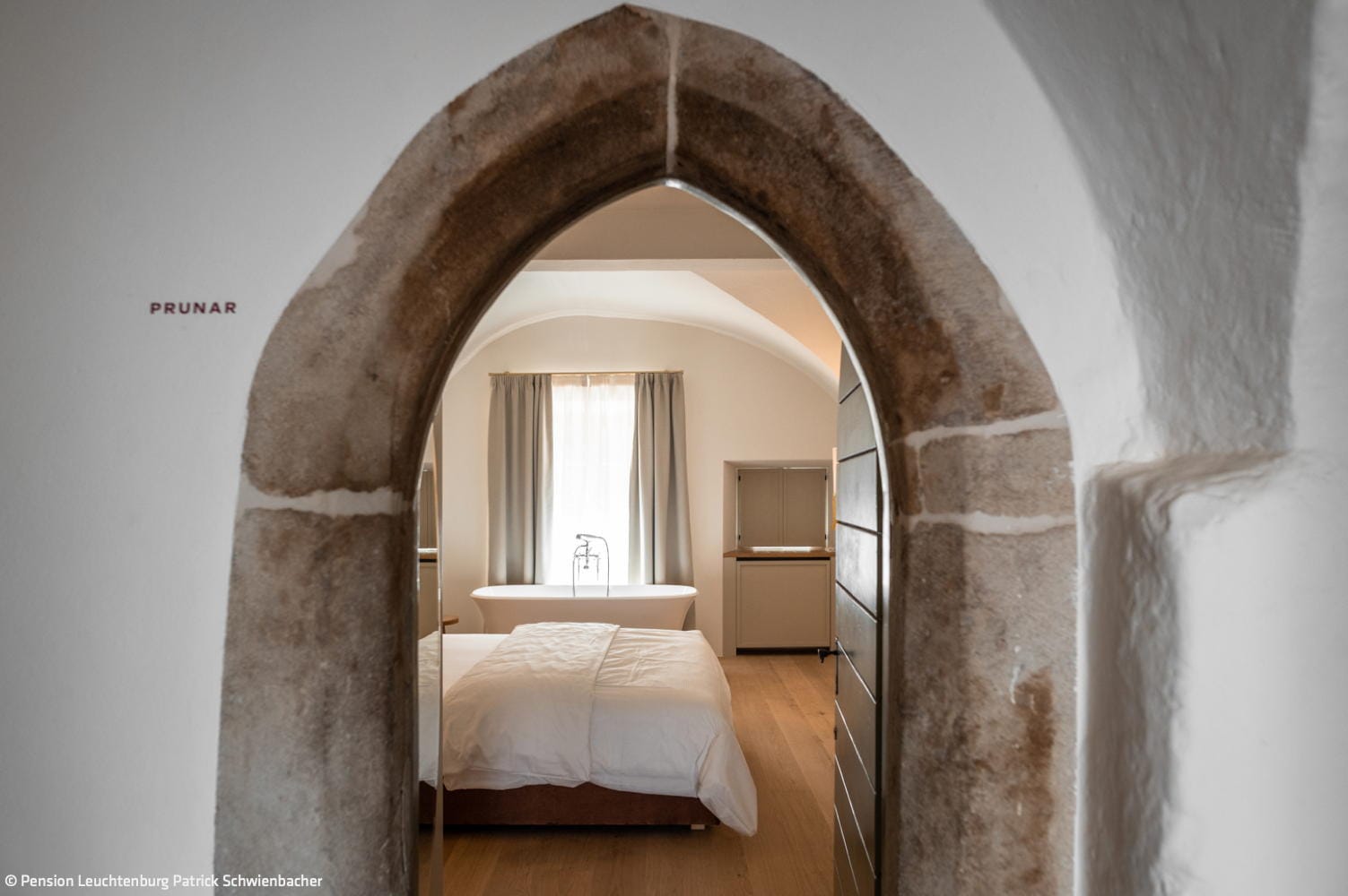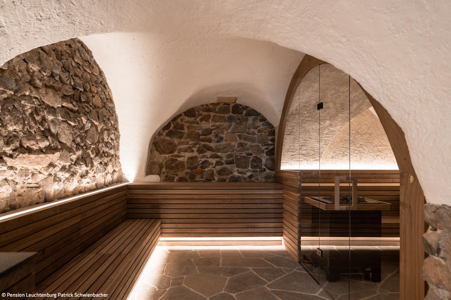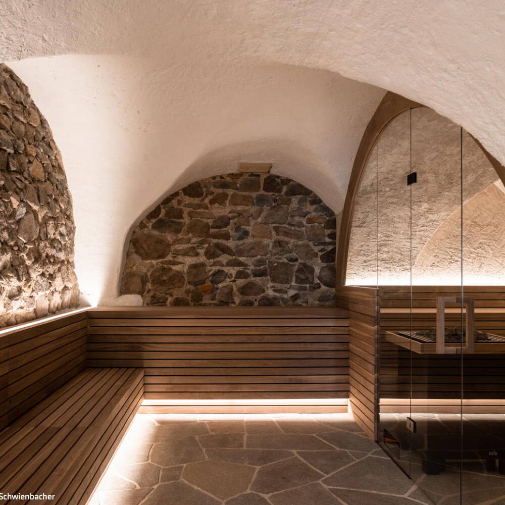 Serviertes Frühstück vom neuen Chefkoch Luca genauso wie ein mehrgängiges Abendmenü gibt’s auf der sogenannten „Terrazza“ mit Seeblick – eine neu geschaffene Lounge mit bodentiefen Fenstern vor dem Hauptgebäude. Das Gemüse kommt von der Biobäuerin, das Fleisch aus Südtirol und der Wein aus organischem Anbau aus der Region. Gäste dürfen gerne extravagant gekleidet kommen, aber auch ganz leger. „Wie jemandem halt gerade is(s)t“ betont Kat. Nur ein paar Schritte sind es von hier zum Seegrundstück – wo eine großzügige Liegewiese mit Bootshaus, ein Tret- und Ruderboot sowie eine Panoramasauna darauf warten, von den Gästen ausgiebig genutzt zu werden. Auch in der Leuchtenburg gibt es einen stylischen Spa-Bereich – und natürlich keinen gewöhnlichen. Eine Sauna aus Nussholz aus dem Sarntal fügt sich in ein historisches Gewölbe im Souterrain ein. Dazu kommen ein Wohnzimmer mit Plattenspieler, eine gemütliche Lounge und natürlich eine gute Auswahl an Vino.