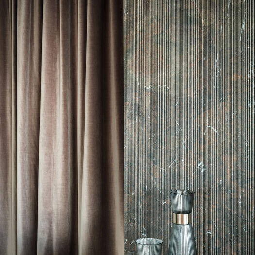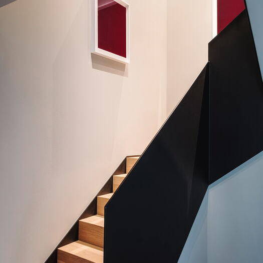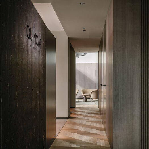 Der „Mailänder Look“ zeigt sich in den neuen Büroräumen in einer klaren Architektursprache, dem Einsatz von Wandpaneelen, verschiedenen und hochwertigen Oberflächen und Texturen sowie einem warmen Farbkonzept. Furnierte und gebeizte Wandpaneele aus Holz, glatt und in Leistenoptik, zitieren das typische Mailänder Büro. Natürliche Materialien, wie belgischer Blaustein mit gefräster Oberfläche, treffen auf elegant zeitlose Materialien wie Leder und Samt bei den Sitzmöbeln. Einen stilvollen Auftritt gewährt ein klassischer Bodenbelag aus Eiche, dessen diagonale Verlegung die vielen Verwinklungen der Räume aufnimmt. Den Grundriss haben die Innenarchitekten den Anforderungen des Auftraggebers entsprechend entwickelt: ein Büro für die Geschäftsführer, ein Bereich für die Assistenz, ein Großraumbüro, eine Lounge und ein Meetingraum. „Dann folgte das Material- und Ausbaukonzept, bei dem jede Wandabwicklung gezeichnet wurde, um Details, wie beispielsweise Wandanschlüsse und -abschlüsse zu klären und Proportionen festzulegen“, erläutert Ralf Böckle die Vorgehensweise.