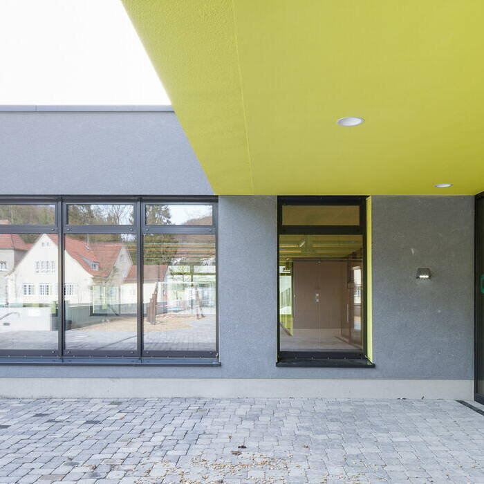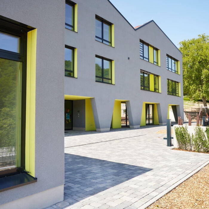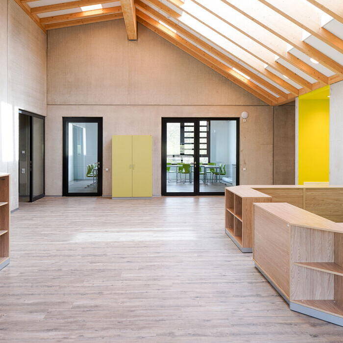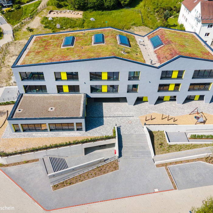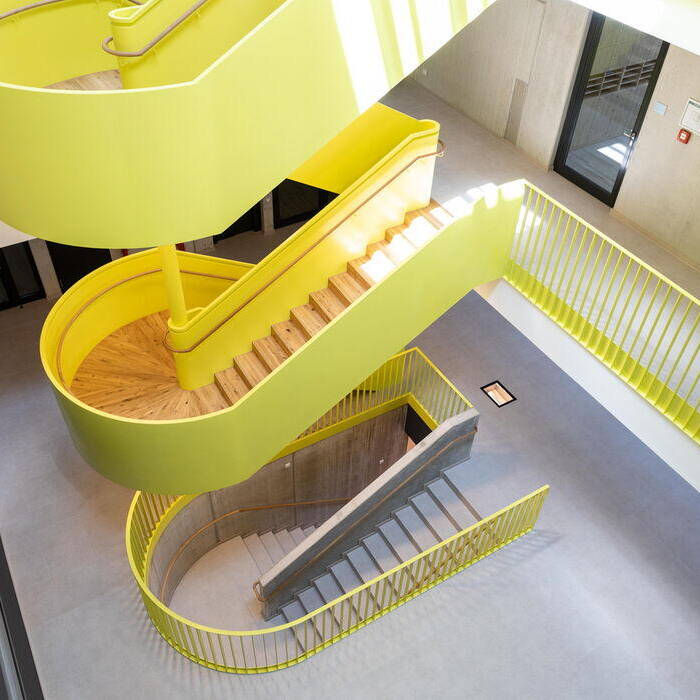 Das markante Hauptgebäude der Diakonie, das sogenannte „Mutterhaus“, erhebt sich inmitten des Campus direkt an einem weitläufigen See. In diesem baulichen wie landschaftlichen Kontext wurde in enger Zusammenarbeit mit den Bauherren und den Lehrkräften ein viergeschossiges, in den Hang gebautes Schulgebäude aus Ortbetonelementen und einem abschließenden Sparrendach mit Begrünung entwickelt. Dabei wurde dem pädagogischen Konzept einer „Draußenschule“ auch baulich Rechnung getragen: An einem Tag der Woche verbringen hier die Schüler:innen ihre komplette Schulzeit im Freien. Die Architektur des Gebäudes wurde so gestaltet, dass die verschiedenen Nutzungen sowohl im gemeinsamen Schulbetrieb, als auch unabhängig davon genutzt werden können. Die direkt am Eingang situierte Einfeldhalle, die über einen externen Zugang verfügt, fügt sich harmonisch in den Hang ein und betont den Zugang zu dem Gebäude. Der Haupteingang, der über eine großzügige, barrierefreie Rampenanlage erreichbar ist und einen sicheren Schulhof für die Grundschulkinder bietet, erschließt ein Foyer sowie die notwendigen Bereiche für Sekretariat und Besprechungen der Lehrerschaft. Durch Einblicke von der Eingangshalle in die Sporthalle entsteht eine Verbindung zwischen den verschiedenen Zonen. Das Haupttreppenhaus mit einer markanten gelben Spindeltreppe eröffnet den Blick in die beiden weiteren Etagen, wo sich Clusterbereiche befinden – wobei jeweils zwei Klassenräume, ein „Förder- und Forderraum“ sowie ein Ganztagsraum zu einem Cluster zusammengefasst werden. Die Flurzonen sind dabei den Pausen- und Spielbereichen zugeordnet, um großzügige Raumangebote entstehen zu lassen. Angegliederte Lehrerbereiche ermöglichen eine direkte Kommunikation mit den Klassenbereichen. Jeder Clusterbereich verfügt zudem über einen direkten Zugang ins Freie – für die unteren Klassen erfolgt dieser über einen direkt vorgelagerten Außenbereich, für die oberen Klassen über filigrane Brücken, die den Höhenunterschied zum sich anschließenden Gelände ausgleichen. In den großzügigen Außenbereich wurden Bereiche für die „Draußenklassen“ und Spielzonen integriert. Der untere Schulhof eignet sich für Laufspiele, während der ansteigende Schulhof am begrünten Hang den Kontakt mit der Natur ermöglicht. Schultiere finden hier ebenfalls ihren Platz, ergänzt durch ein Gehege am Ende der Rampenanlage.