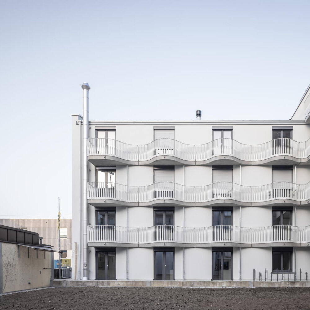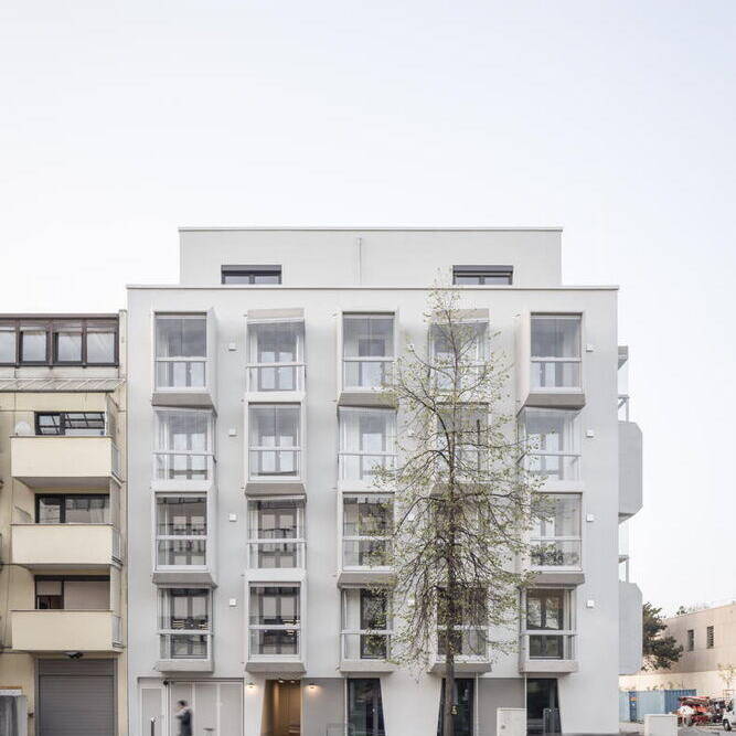 Die Appartements verfügen über einen Wohn-/Schlafraum, eine Küchenzeile und ein Bad. An der Gebäuderückseite liegen Balkone, die als wellenförmige Bänder ausgeführt sind. Durch eine geschickte, hoch verdichtete Anordnung konnten auf den Vollgeschossen bis zu 15 Wohneinheiten untergebracht werden, ohne dass ein „Zellencharakter” entsteht. Die Größen variieren von 17 bis 37 m2. Ein Supermarkt und ein Fitnessstudio liegen direkt gegenüber. Auch die Verkehrsanbindung ist günstig – entweder zur nahe gelegenen Bushaltestelle oder zur U-Bahnstation am Giesinger Bahnhof, der in etwa 15 Minuten zu Fuß zu erreichen ist. Der Baukörper wurde in Massivbauweise errichtet. Durch hohen Effizienzhausstandard erreicht das Gebäude einen KfW 55 Status.