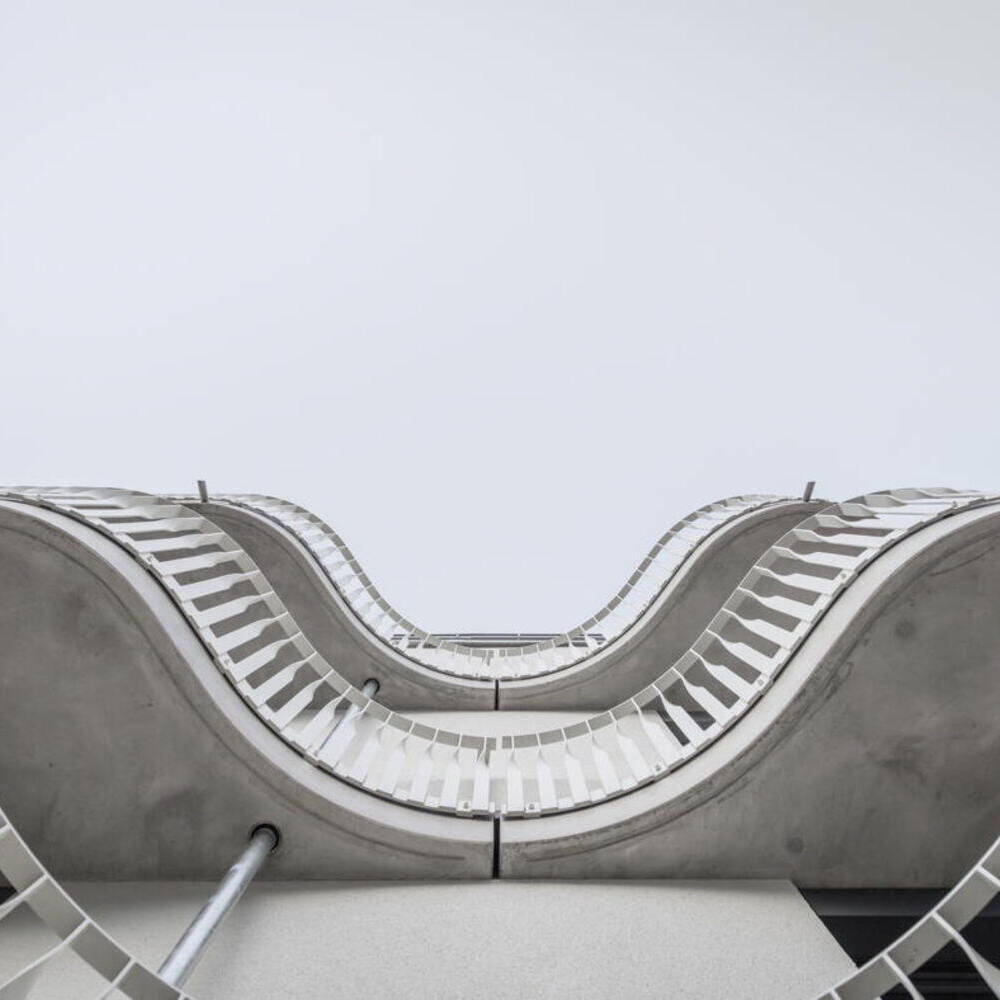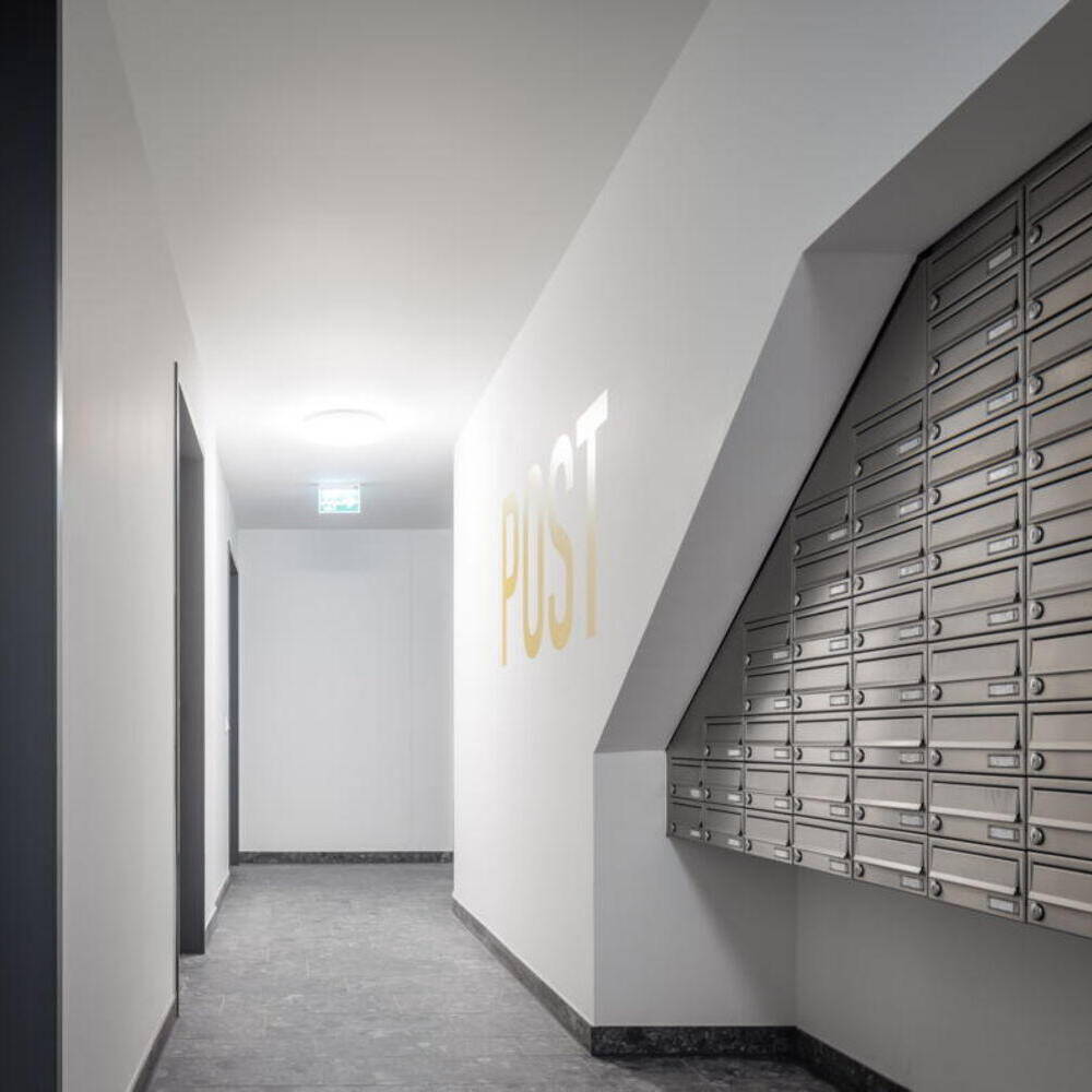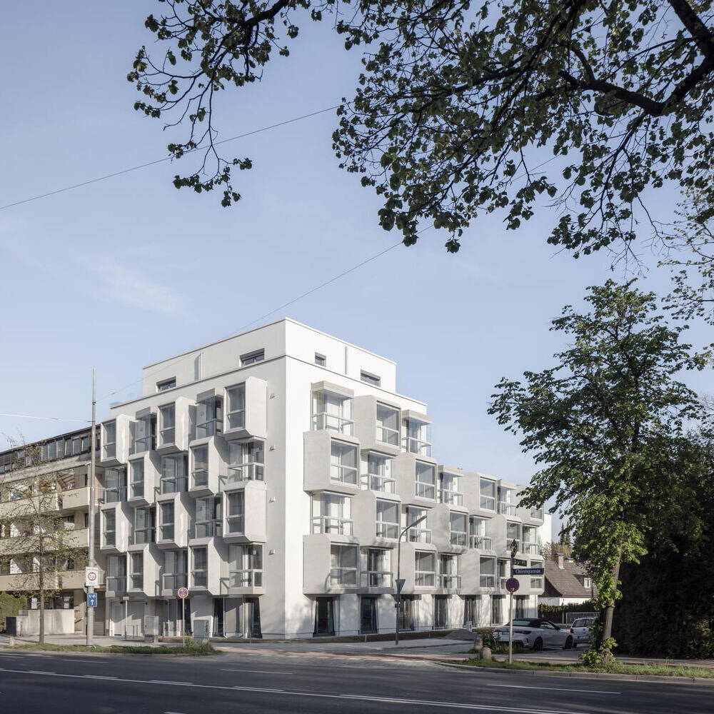 65 unterschiedlich große Appartements fanden in den sechs oberirdischen Geschossen Platz, ein Drittel davon sind barrierefrei nutzbar. Zunächst fällt die prägnant gestaltete Fassade ins Auge. Sie ist regelmäßig durch Sichtbetonelemente gegliedert, die als Sichtschutz fungieren. Die dazwischen liegenden großflächigen Fenster sind entweder als aus der Fassade herausragende Kuben ausgebildet oder flach und bündig in die Gebäudehülle eingesetzt. Die Grundfläche des Erdgeschosses bis zum 3. Obergeschoss erstreckt sich über die gesamte Gebäudelänge, während sich die Geschosse vier bis zum Dachgeschoss turmartig zur Straßenecke hin verjüngen und sie betonen. So bietet sich über der Ebene 3 Platz für eine große Gemeinschaftsdachterrasse, die allen Bewohner:innen zur Verfügung steht. Den oberen Abschluss bildet ein leicht geneigtes Flachdach.