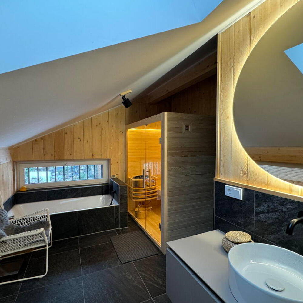Sowohl innen als auch außen hat der Architekt spannende Kontraste geschaffen. Außen durch die Kombination von Holz und dunklen Fassadenplatten, innen unter anderem durch industriell geprägte Armaturen in Schwarz, die zur Gemütlichkeit des warmen Holzes einen interessanten Gegenpol schaffen. Die Lamellen im Obergeschoss teilen das Gebäude optisch in die öffentliche Bereiche im Erdgeschoss und die privaten Räume in der oberen Etage. Gleichzeitig dienen als Sonnen- und Sichtschutz. Als besondere Ausstattung wurde noch eine Sauna integriert, die von den Besitzern nach ausgedehnten Wanderungen und Mountainbiketouren gerne genutzt wird.