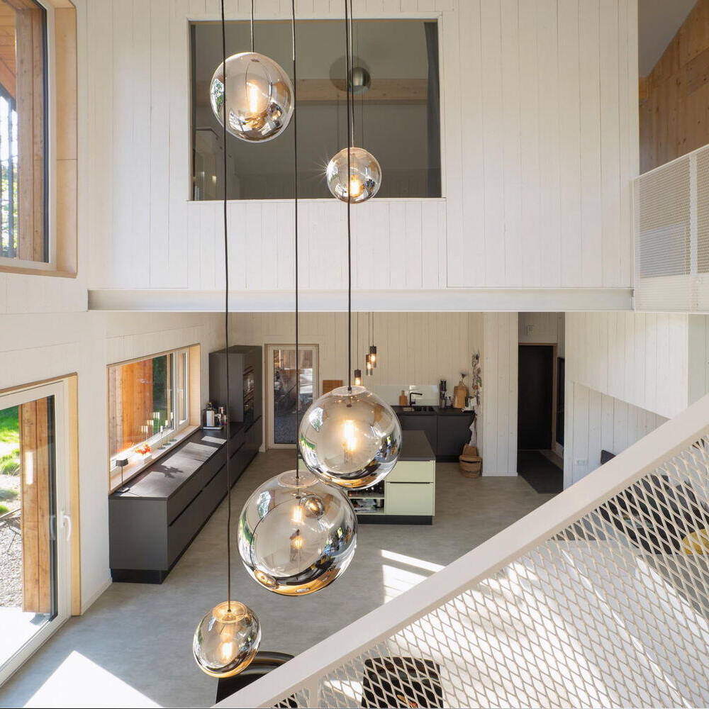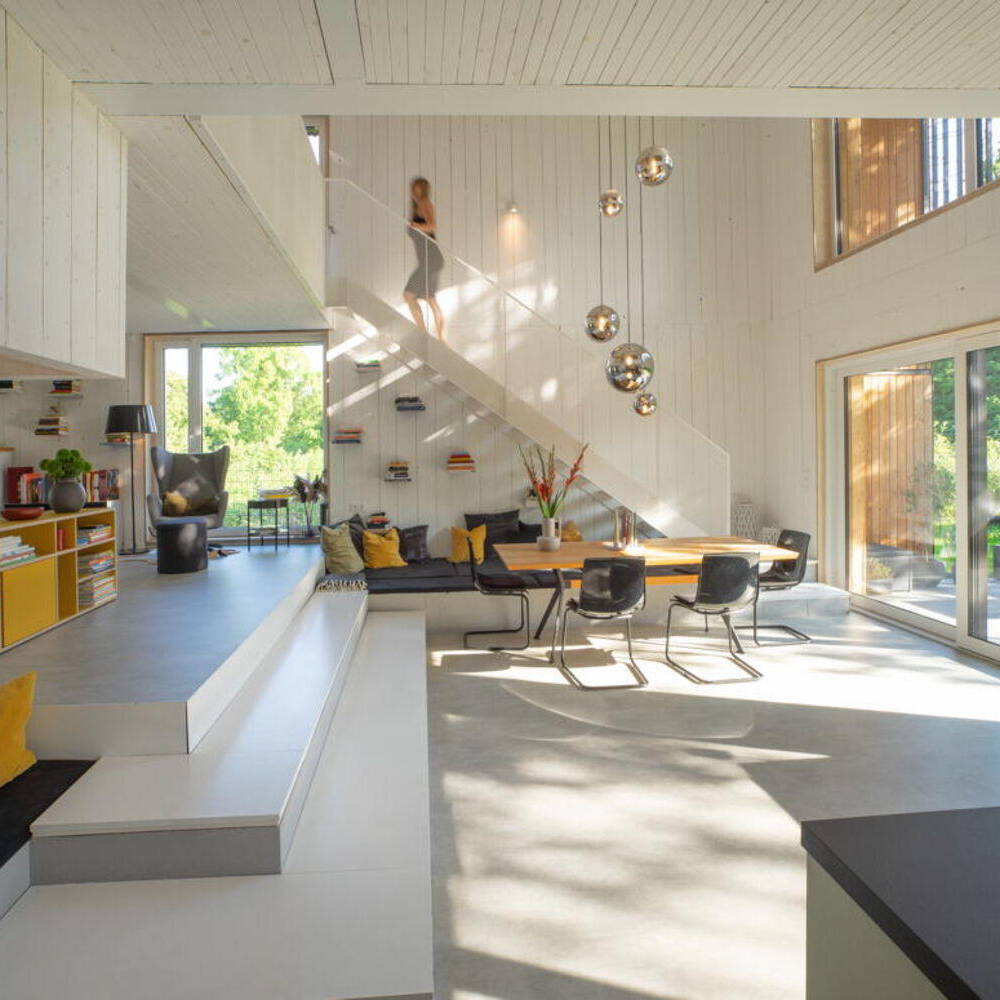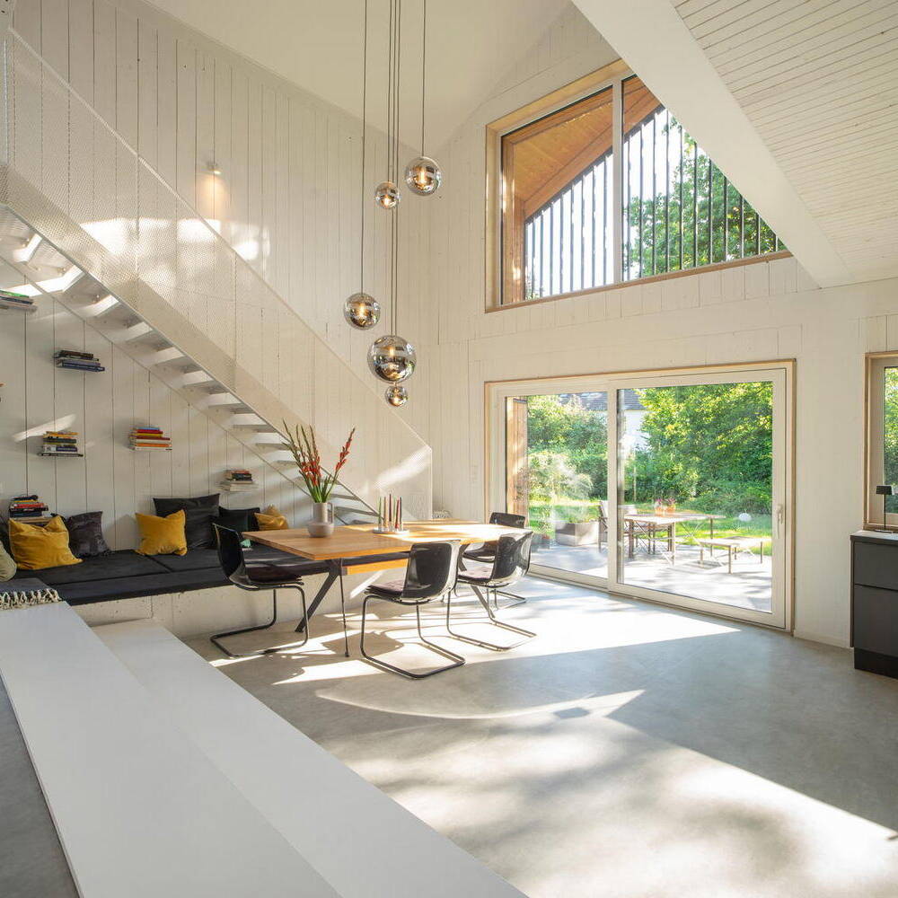 Im Garten einer alten Villa, die sich im Familienbesitz befindet, verwirklichte der Architekt Benjamin Stiller seine Vision vom idealen Eigenheim für sich und seine Familie. Während die Lage des Hauses auf der einen Seite eine hohe Verkehrsberuhigung mitbrachte, steckte es auf der anderen Seite voller Herausforderungen. So war es aufgrund oberflächennaher Steinschichten nicht möglich, tief in die Erde zu bauen. Ein Grund, warum die Garage nicht unter dem Haus liegt, sondern nach oben gewandert ist und so dem Wohnraum darüber Profil gibt. Nur ein Beispiel, bei dem die anspruchsvollen Bedingungen des Grundstücks zum Konzept des Hauses geworden sind. Ein anderes ist die Gliederung der Wohnbereiche, die dem Höhenvorsprung folgt. „Daraus haben sich ganz unterschiedliche Nischen und Sitzbereiche ergeben, die vielfältige Nutzungen erlauben und gerade bei Kindern als Tobeecken beliebt sein“, erklärt der Architekt. Das Ziel war es, ein nachhaltiges, nahezu autarkes Zuhause zu schaffen. Das 180 m2 große Einfamilienhaus setzt dabei konsequent auf Holz als primären Baustoff. Dabei handelt es sich um Holz, das eigentlich nicht zum Bauen verwendet wird. Vielmehr ist es Recyclingholz, das durch den lageweisen Aufbau vergleichsweise günstig massive Wände hat entstehen lassen. Geheizt wird über eine Wärmepumpe mit Fußbodenheizung, die in Zukunft durch eine nachinstallierte Photovoltaikanlage betrieben werden soll. Nachhaltigkeit ist somit ein zentrales Element des Konzepts. Das Innenleben des Hauses ist offen und lebendig gestaltet, mit Blickbeziehungen, die sich durch das gesamte Gebäude ziehen. Unterschiedliche Level schaffen Zonierungen und diverse Aufenthaltsbereiche, was das Raumgefühl dynamisch und abwechslungsreich macht. Besonders hervorzuheben ist die großzügige Galerie, die das Haus von überall erlebbar macht und eine zentrale Verbindung zwischen den Ebenen schafft. Der Essbereich, der mit 6,50 Metern Höhe beeindruckt, eröffnet immer neue Blickbeziehungen und sorgt für ein faszinierendes Raumgefühl. Was das Innenleben ebenfalls spannend macht, sind die stets neuen, reizvollen Lichtstimmungen, die im Zusammenspiel zwischen der Südwest-Ausrichtung und dem Baumbestand auf dem Grundstück entstehen.