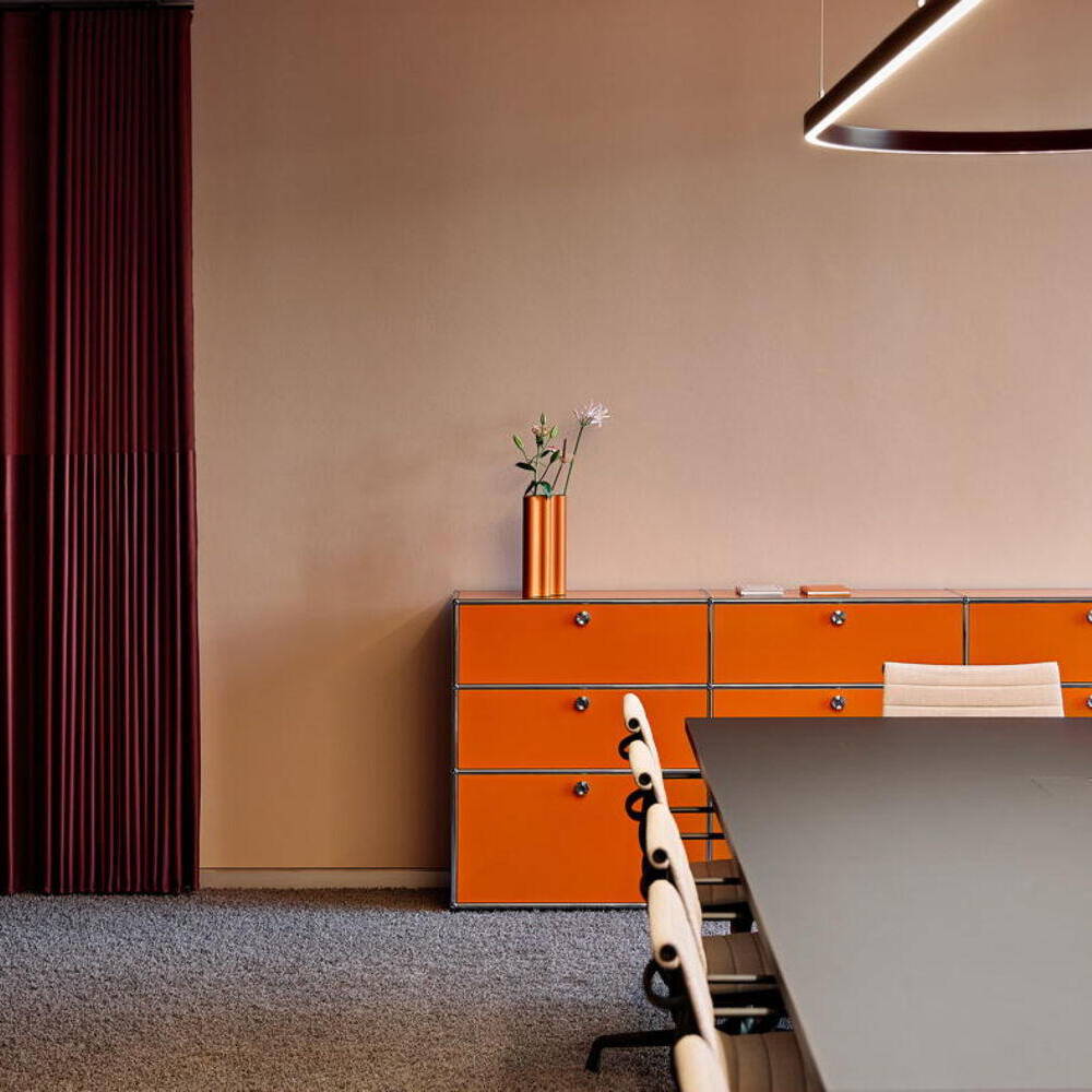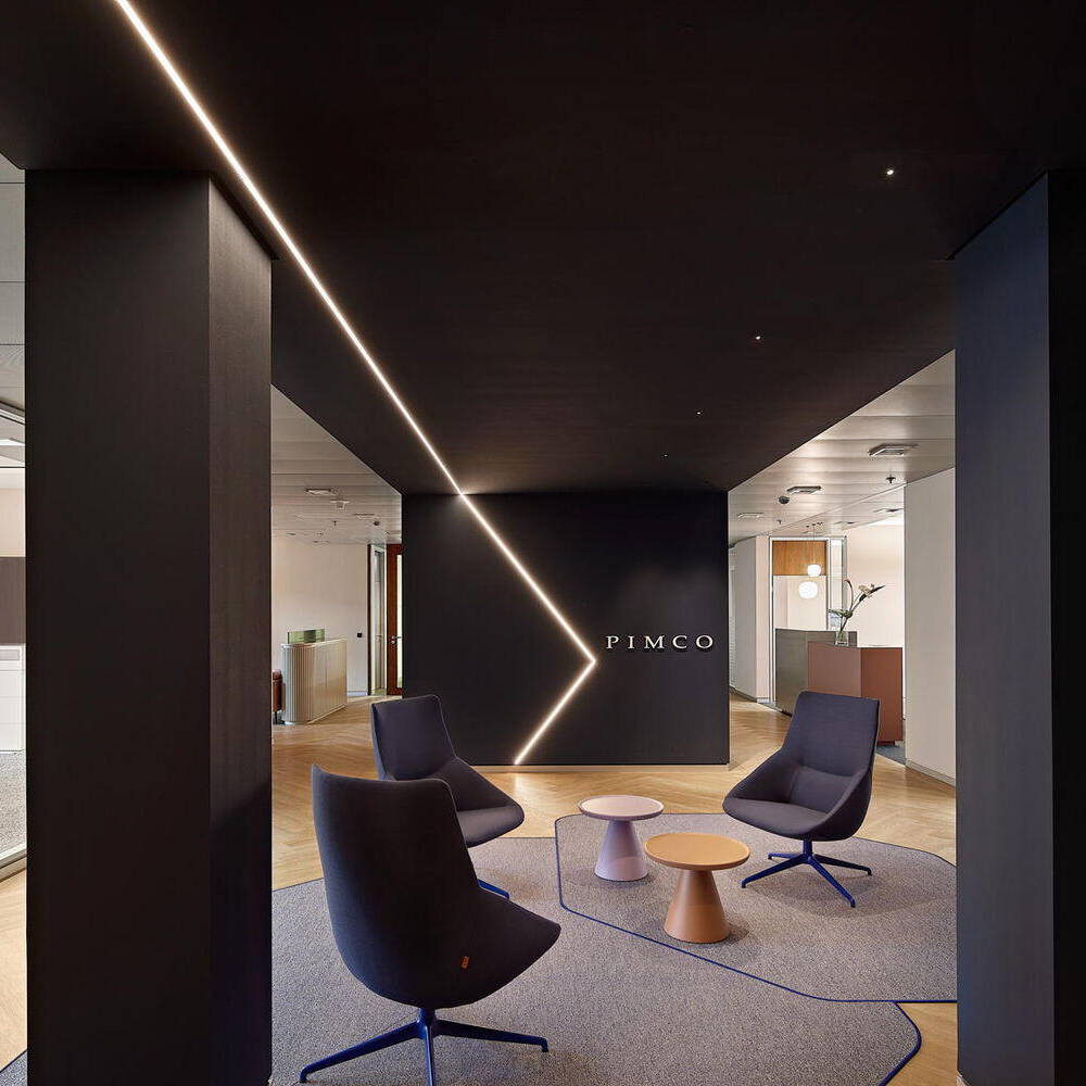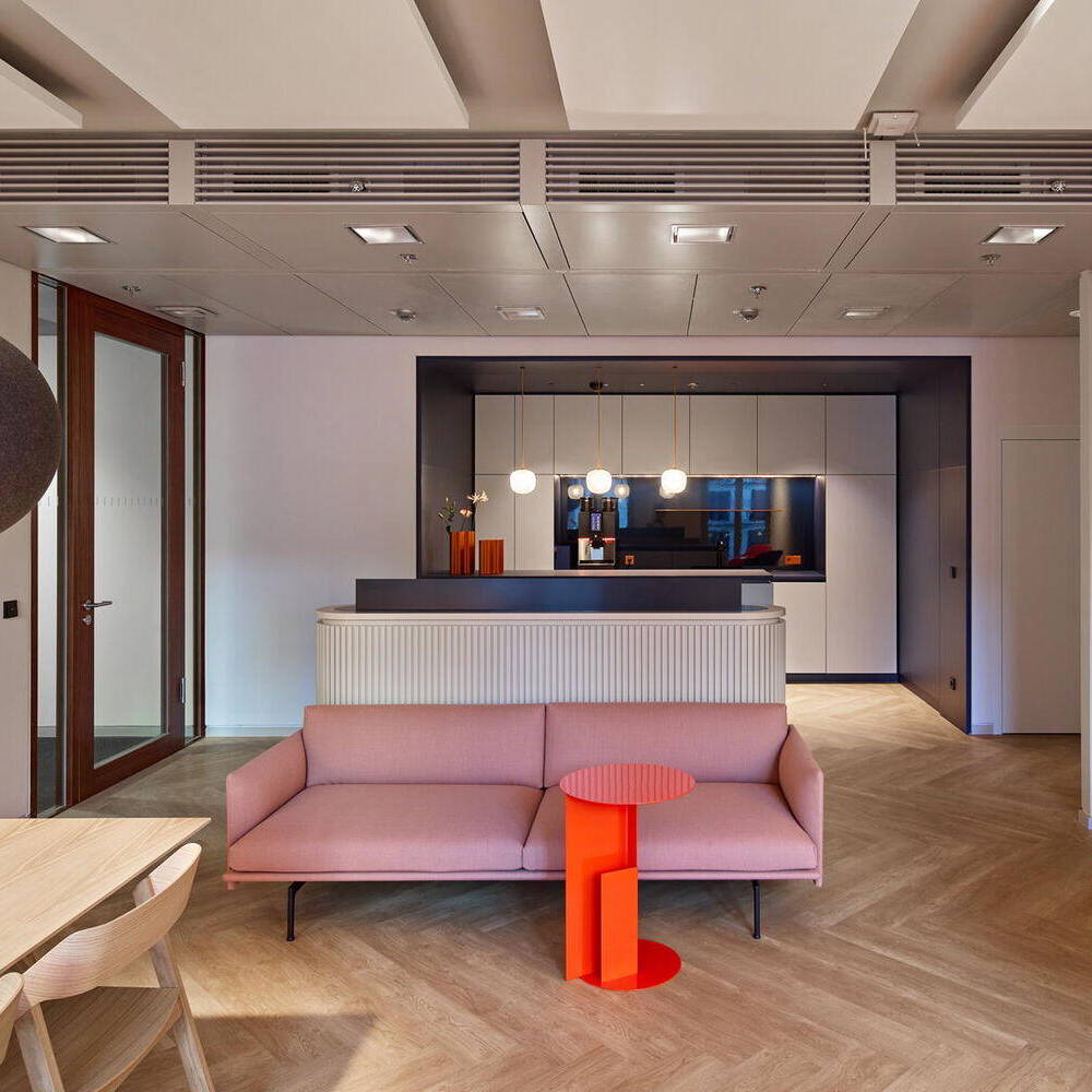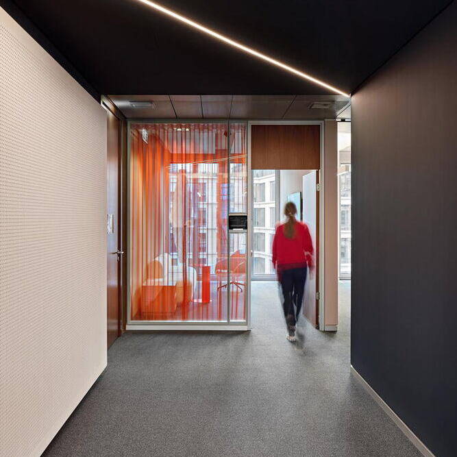 Statt einer Komplettsanierung, setzten die Frankfurter Architekten gezielte Akzente. So wurden in den Kern- und Kommunikationszonen neue Qualitäten geschaffen: Eine offene Teeküche mit Lounge-Charakter – Aufenthaltsort und Treffpunkt zugleich – fördert den informellen Austausch; zwei Think Tanks ermöglicht konzentriertes Arbeiten, während ein großzügig verglaster Besprechungsraum den Eingangsbereich mit Tageslicht flutet. Eine durchgehende Lichtlinie führt intuitiv zum Empfang und lenkt den Blick auf das Logo – subtil, aber wirkungsvoll. Diese Musterlounge ist kein abgeschlossenes Endprodukt. Sie versteht sich als Ausgangspunkt für Weiterentwicklung, als Plattform für neue Anforderungen. Just Architekten demonstrieren, wie aus dem Gedanken der Doppelnutzung ein dynamisches Raumkonzept entstehen kann – flexibel, nachhaltig, identitätsstiftend. Das Projekt ist ein Plädoyer für das Potenzial von Bestandsarchitektur: wandelbar, offen und bereit für die Anforderungen von morgen.