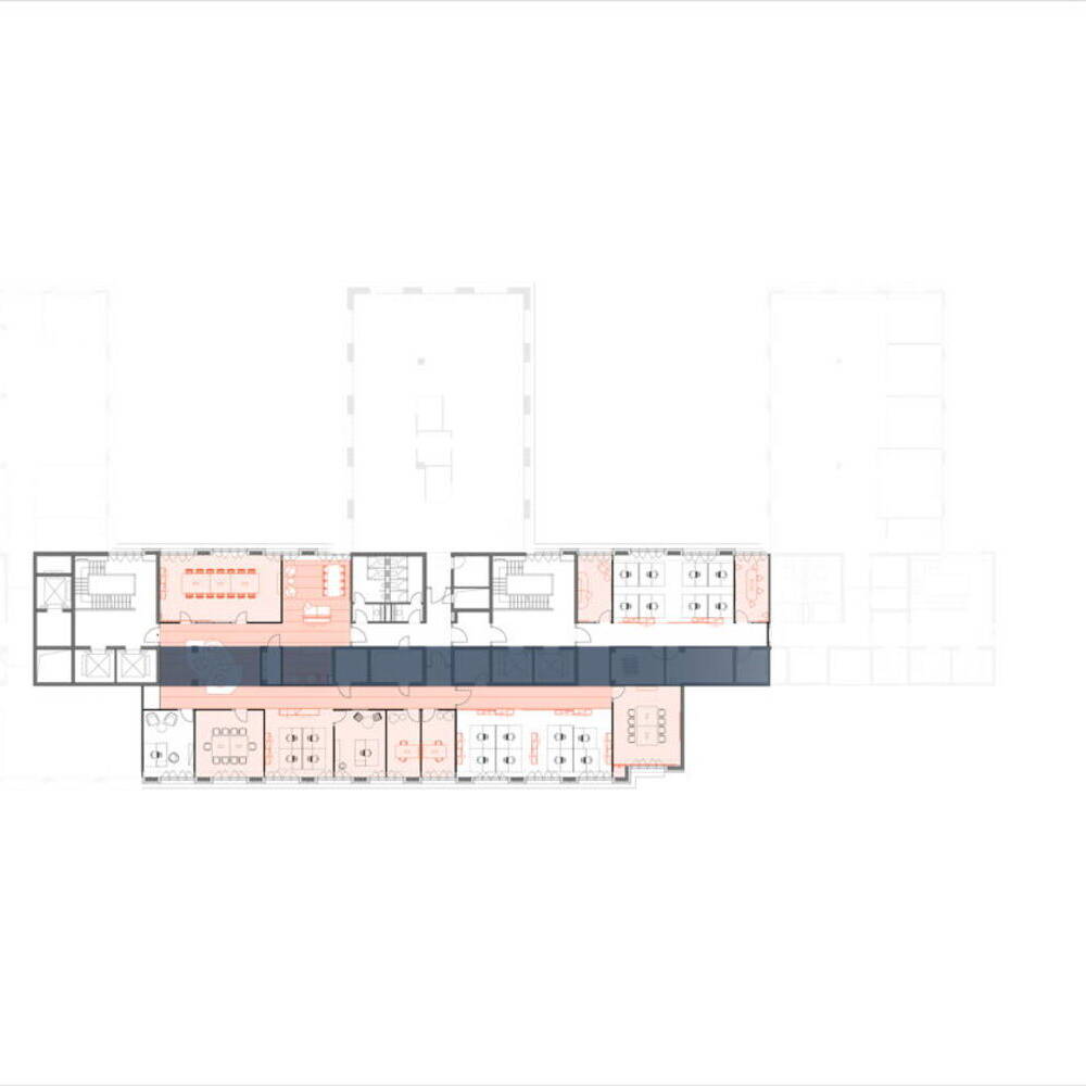 Die Umgestaltung folgt einem präzisen Farb- und Funktionskonzept, das sich am Corporate Design des Kunden orientiert. Herzstück ist die sogenannte Markenzone: ein zentraler Bereich in kräftigem Dunkelblau, der als räumliches und visuelles Rückgrat fungiert. Diese Zone bleibt bewusst durchlässig und verbindet die Bereiche, statt sie zu trennen. Flankiert wird sie von Kommunikationszonen in abgestimmten, ruhigen Tönen. So entstehen natürliche Laufwege und ein offenes Miteinander.