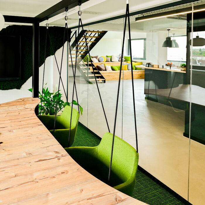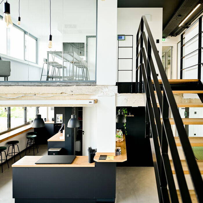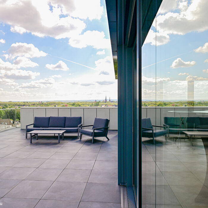 Aus Brandschutzgründen befindet sich in jeder Etage eine (Büro-)Fläche mit je rund 320 m². Dank offenerer, flexibler Grundrisse und Glastrennwänden sind die Räume hell und freundlich. Die Böden bestehen aus Teppich und Vinyl sowie teilweise Exposidharzbeschichtungen. Auch hier wird das Farbkonzept der Grautöne mit blauer Nuance weitergeführt. Wo es möglich war, wurden Betonelemente freigelegt und in Szene gesetzt. In der 12. Etage befinden sich zusätzlich Konferenz- und Loungeflächen zur Anmietung auch für externe Nutzer. Der Nutzungsmix der Immobilie spiegelt den modernen Lifestyle wider, indem er Arbeiten und Leben zusammenbringt. Die Kombination aus Büros, Bistro, Concierge, Tagesmutter-Angebot, Fitness- und Eventflächen ist zeitgemäß.