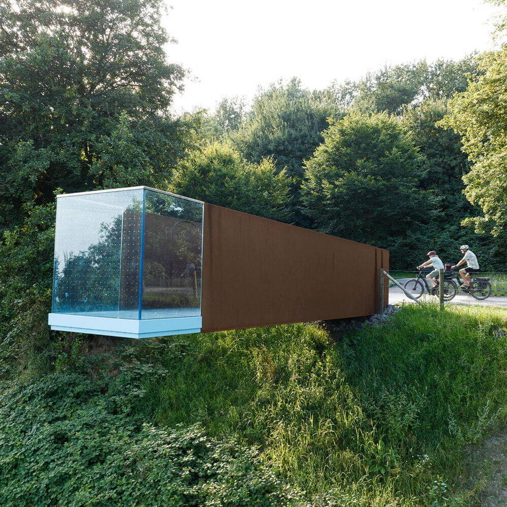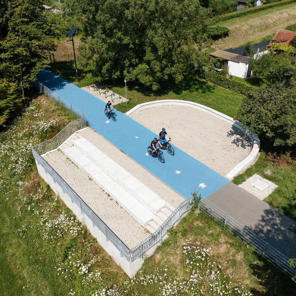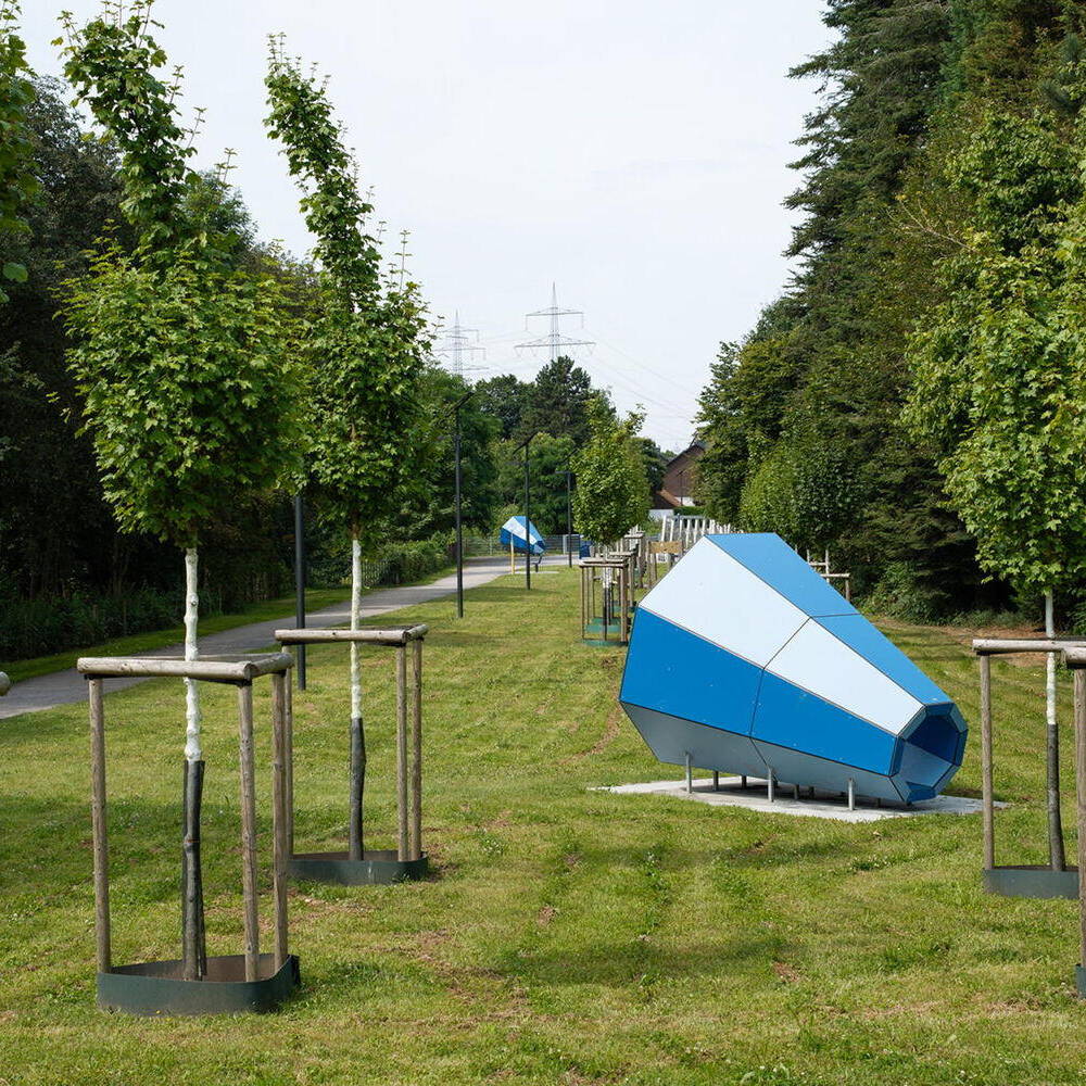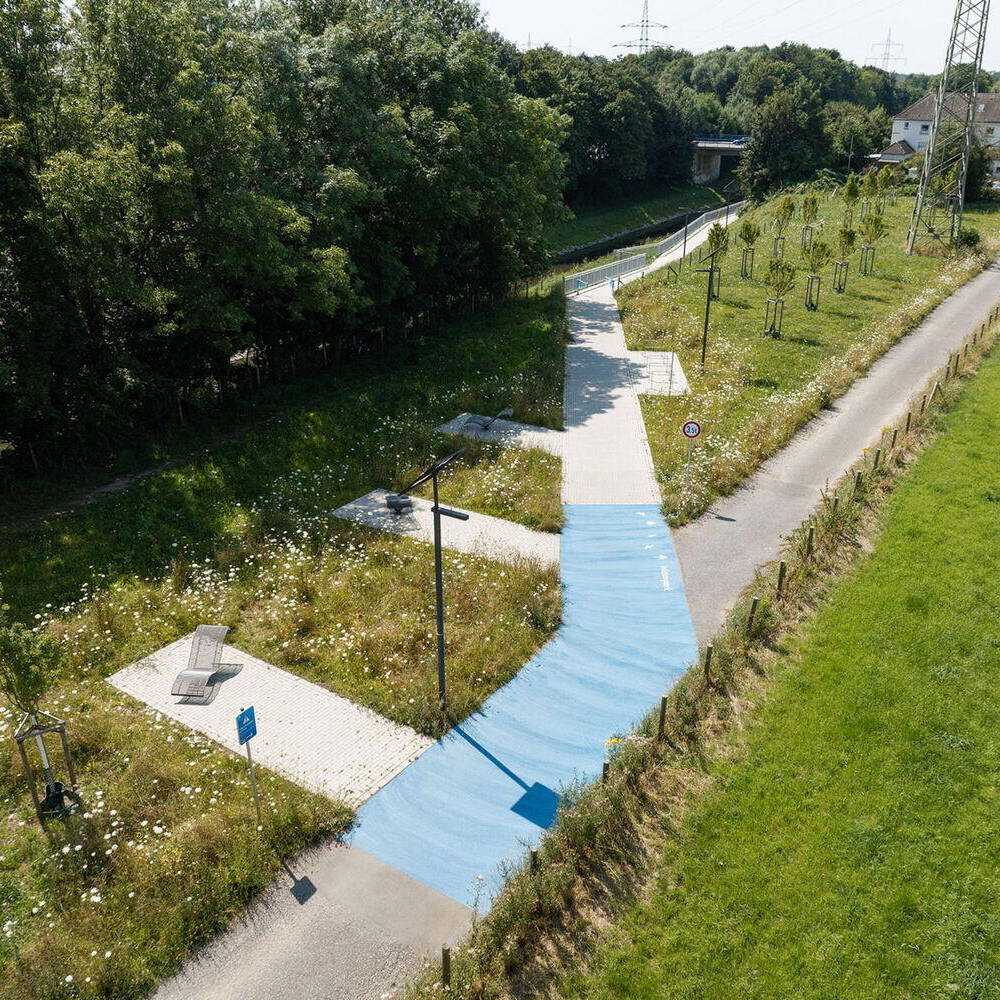 Dabei verbindet die Promenade weit mehr als „nur“ die Städte, sie wirkt identitätsstiftend und macht die Emscher und ihre begleitenden Wege zu einem attraktiven Teil von Quartier, Stadt und Region. Als Rückgrat dient der alte Betriebsweg der Emschergenossenschaft, der heute ein gewässerbegleitender Rad- und Fußweg ist. Doch erst die Aufwertung der Uferbereiche und die Gestaltung von besonderen Orten machen ihn zu mehr: einem attraktiven und multifunktionalen Stadtraum. Auf der zirka 20 Kilometer langen Strecke entstanden 25 gestaltete Räume, die jeweils lokale Themen aufgreifen, räumliche Bezüge thematisieren oder die Verbindungen zu den Quartieren stärken. Neue Brücken und Unterquerungen laden dazu ein, den Raum auf eine bisher nicht dagewesene Weise zu entdecken und ermöglichen neue Anbindungen zum öffentlichen Nahverkehr. Die Emscher-Promenade wird so zum wichtigen Teil der blau-grünen Infrastruktur der Region. Sie lässt sich in drei Teilbereiche gliedern. Der erste Abschnitt zeigt eine typische Ruhrgebietslandschaft, eine Mischung aus Industrie, Gewerbe, Wohnen und Grün. Die Promenade reagiert mit den Orten auf dieses Umfeld, lenkt Sinne wie Hören und Sehen, macht Besonderes sichtbar und stellt Sinnzusammenhänge dar. Beispiele hierfür sind die Hellbachterrassen mit heimischen Bäumen und Bänken zum Verweilen sowie blau lackierte, trichterförmige Objekte –Lauschstationen –, die das Thema Wasser und seine Geräusche aufnehmen. Im zweiten Abschnitt dreht sich alles um die zukünftige landschaftlichen Attraktivität des Flusses und seiner Geschichte. Blaue Pferdeskulpturen, die Emscherbrücher Dickköppe, erinnern an die Wildpferde, die hier früher lebten. Der markante Emscher-Steg wiederum ragt vom Weg weit über die Uferböschung und erlaubt einen Blick auf eine künftige Aufweitung des Flusses als ökologischer Schwerpunkt. Der dritte Abschnitt stellt die Verbindung des Stadtraums zum Fluss in den Vordergrund. So entstand an den Herdicksfällen ein Wassererlebnisort. Spielerisch geht es entlang der blauen Wasserschlange zu, die sich weit über die Wiese erstreckt. Alle Treffpunkte, Spiel- und Lernorte folgen einem gemeinsamen Baukasten und bilden den „blauen Faden“ der Emscher-Promenade.