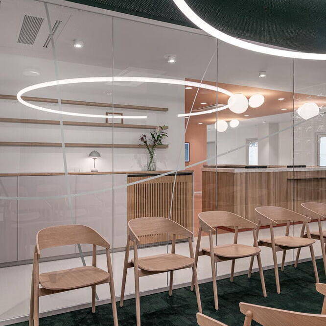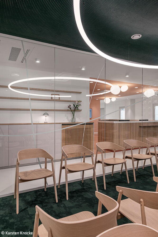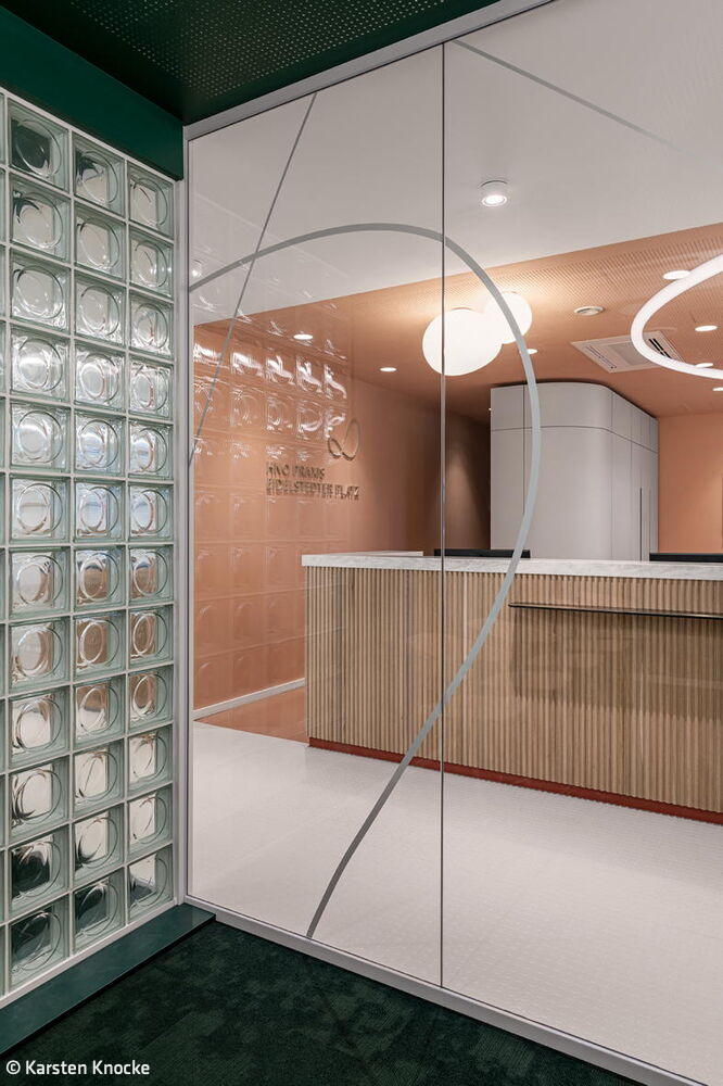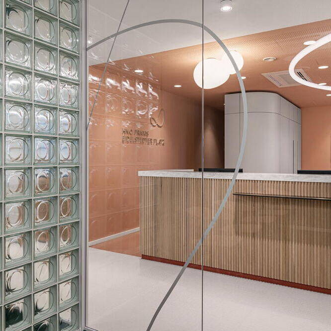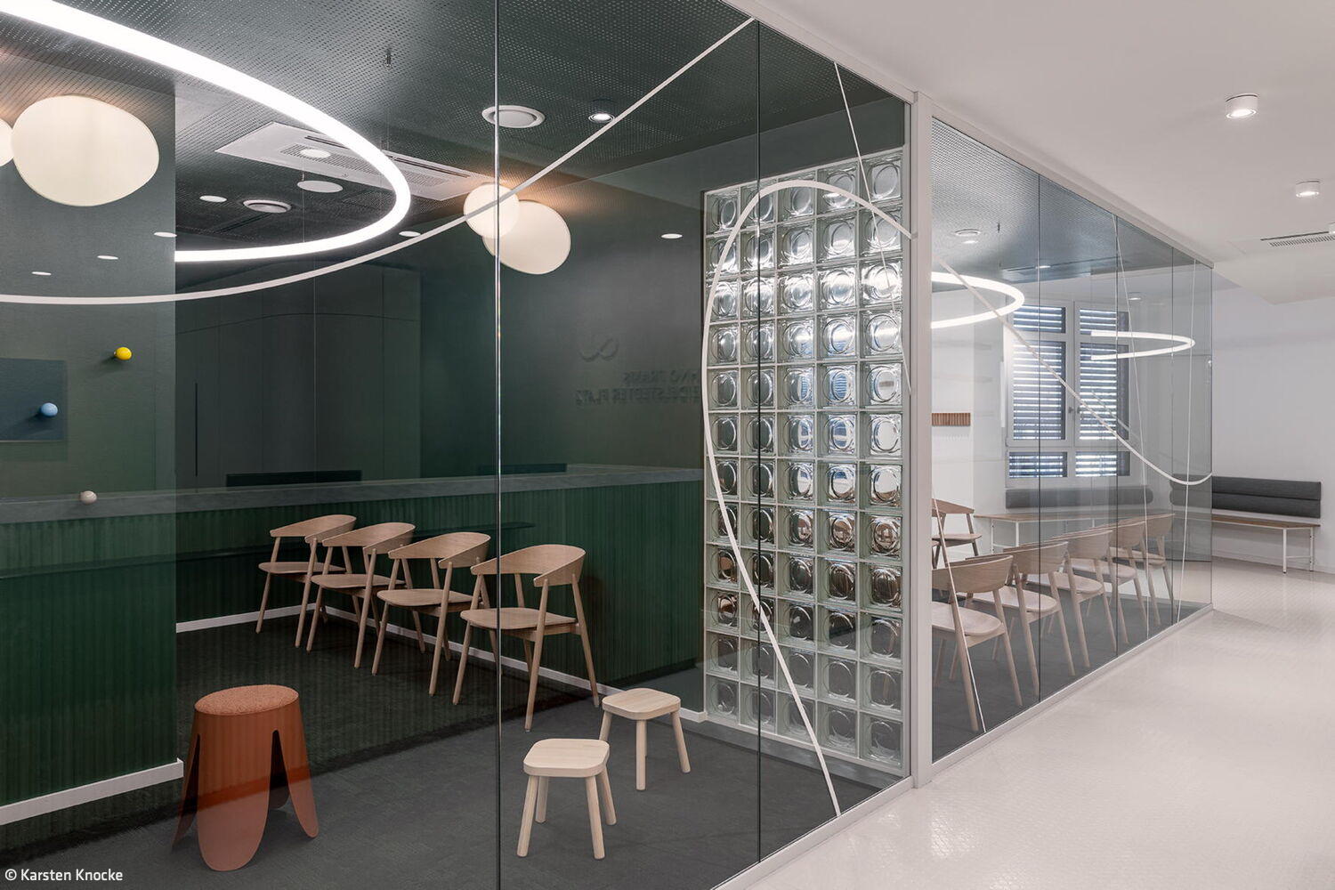 Ziel war es, eine Atmosphäre zu schaffen, die sowohl beruhigend als auch klar strukturiert ist, um Patient:innen eine hohe Aufenthaltsqualität zu bieten. Die Raumstruktur und das unaufdringliche Design gewährleisten eine ansprechende und nutzungsorientierte Umgebung, die ganz klar den Menschen in den Mittelpunkt stellt. In Anlehnung an den Fachbereich und im Einklang mit dem Markenauftritt der Praxis bildet eine runde Formgebung das gestalterische Leitmotiv für alle Räumlichkeiten. Der Grundriss folgt einer zirkulären Raumstruktur, bei der der Empfangs- und die Wartebereiche als verbindende Elemente im Zentrum und die Behandlungs- und weitere Funktionsräume in einem äußeren Zirkel liegen. Diese Anordnung schafft eine harmonische Balance zwischen Offenheit im Empfangsbereich und angemessener Privatsphäre in den Behandlungszonen. Ein fein ausbalanciertes Farbkonzept, ergänzt durch ein unaufdringlich integriertes Wegeleitsystem vom Designer David Steingrüber, gibt Orientierung und vermittelt über seine klaren Strukturen Ruhe im hektischen Praxisalltag. Die nummerierten Behandlungsräume sind grafisch ansprechend gestaltet, wobei Folierungen und grafische Elemente die Bildmarke der Praxis aufgreifen. Die Sichtbeziehungen, die zwischen den verschiedenen Praxiszonen entstehen, schaffen architektonische Tiefe und attraktive Durchblicke, die den Raum ästhetisch bereichern und eine hohe Aufenthaltsqualität für die Patient:innen bieten.